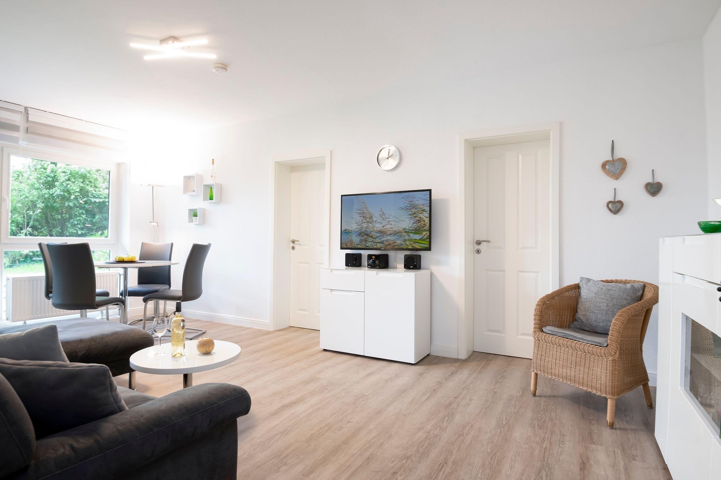 Eins der Schlafzimmer ist mit komfortablem Doppelbett (2x90x200 cm), Kleiderschrank und Flatscreen-TV ausgestattet, das zweite Schlafzimmer bietet zwei bequeme Einzelbetten (90x200 cm), zwei Kleiderschränke und einen weiteren TV. Beide Schlafzimmer sind mit Fliegengittern ausgestattet. Der offen gestaltete Wohn-/Essbereich begrüßt Sie mit großzügigem Sofa und Flatscreen-TV, sowie Essplatz für 4 Personen direkt am Fenster mit Blick in den Garten. Von hier führt ein Zugang direkt auf Ihre Terrasse, genießen Sie morgens gleich die erste Tasse Kaffee mit einer Brise frischer Ostseeluft in der Nase oder lassen Ihre Urlaubstage hier entspannt am Abend ausklingen.