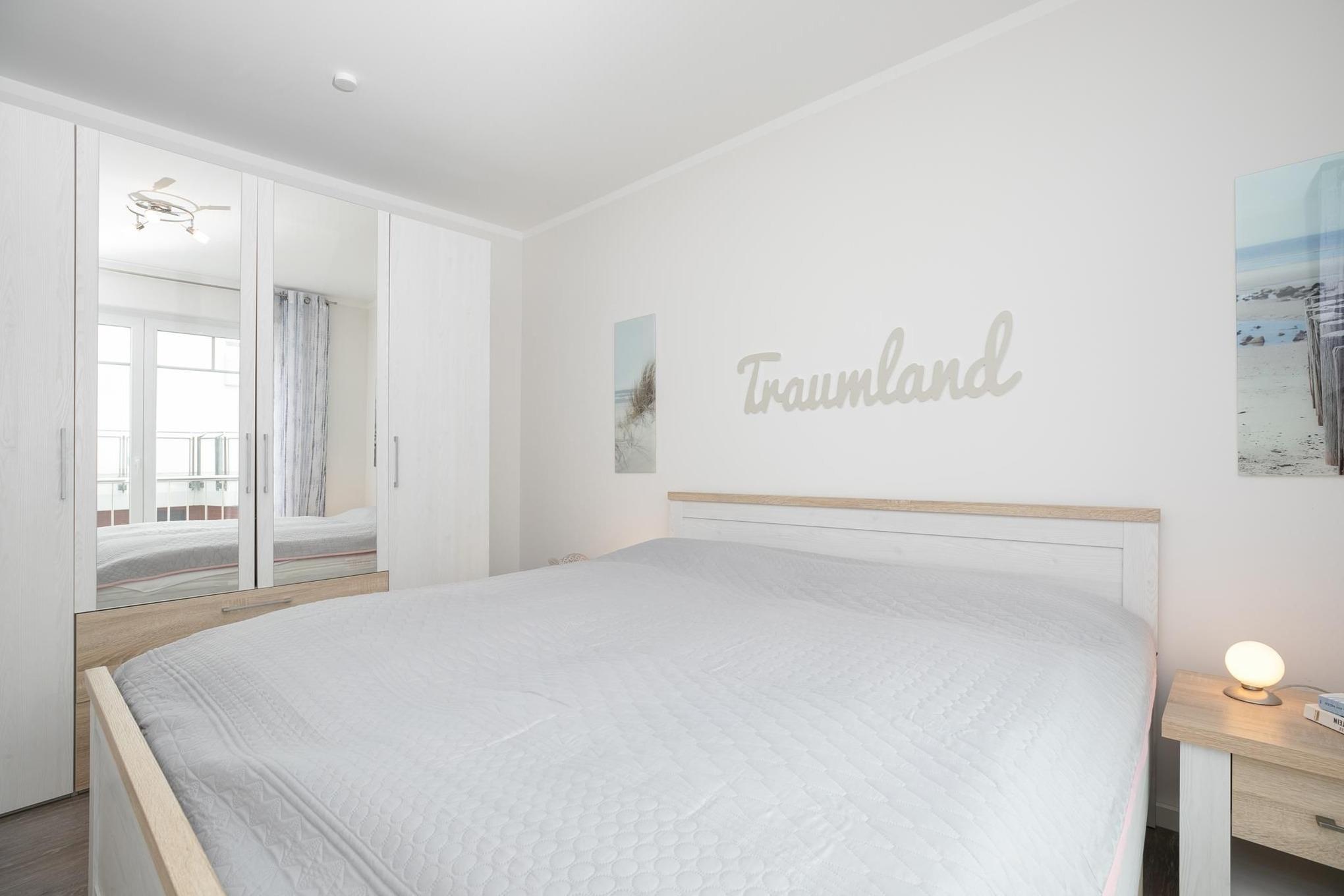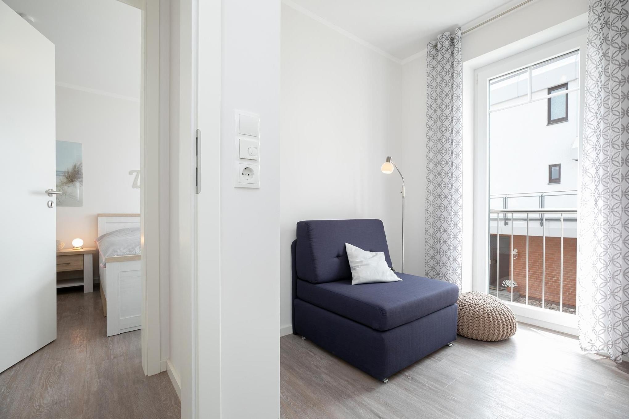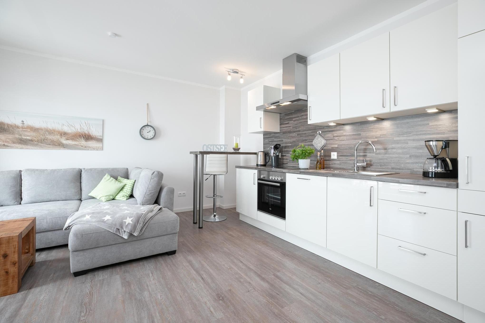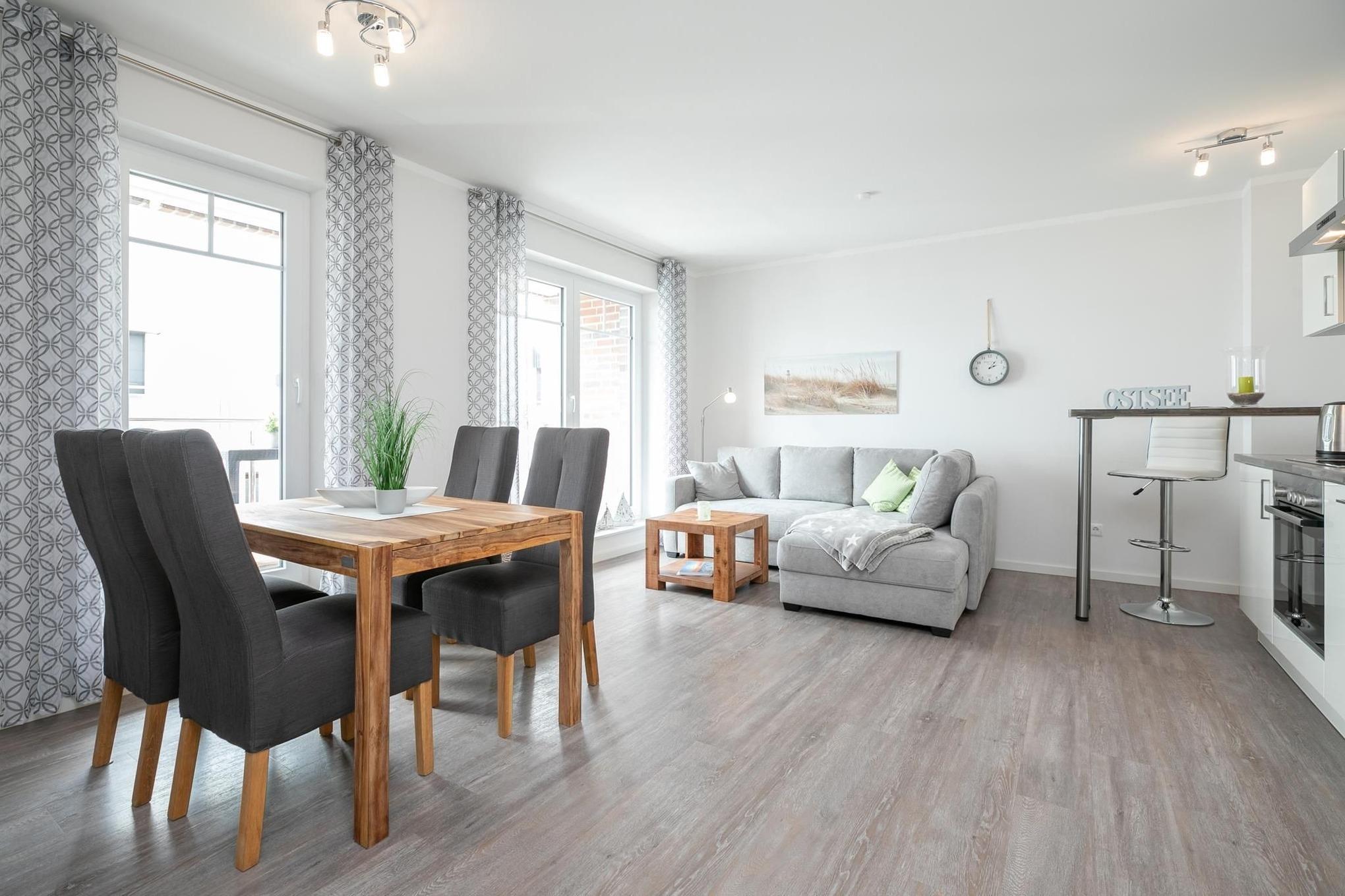 Das großzügig geschnittene Wohnzimmer mit Flat-TV und gemütlicher Sitzecke, Essplatz und voll ausgestatteter Küchenzeile lässt keine Wünsche offen. Von hier haben Sie auch direkten Zugang zum möblierten und überdachten Balkon, auf dem Sie die gesunde Ostseeluft bei einem guten Glas Wein genießen können. Über einen WLAN-Anschluss bleiben Sie mit Ihren Lieben in Verbindung. Im separaten Schlafzimmer wartet ein großes Doppelbett (180x200 cm) darauf, Ihnen traumhafte Nächte zu bescheren. Ein modernes Duschbad mit WC runden dieses schöne Ferienobjekt ab.