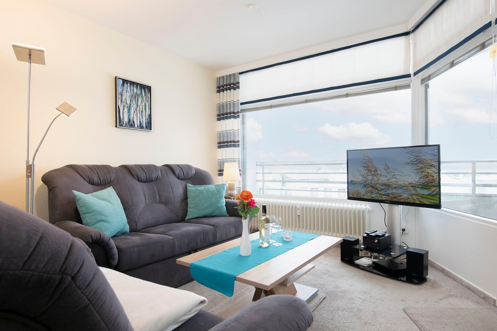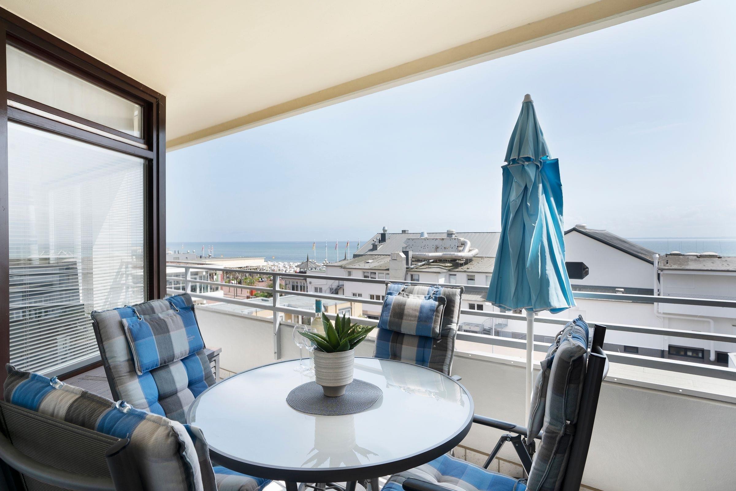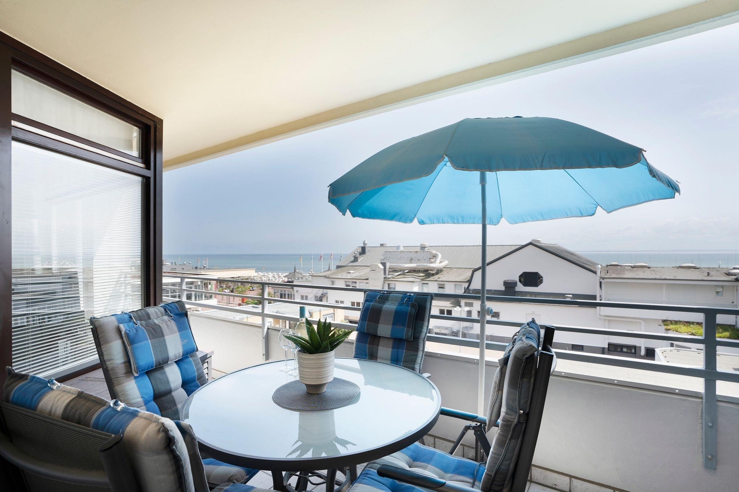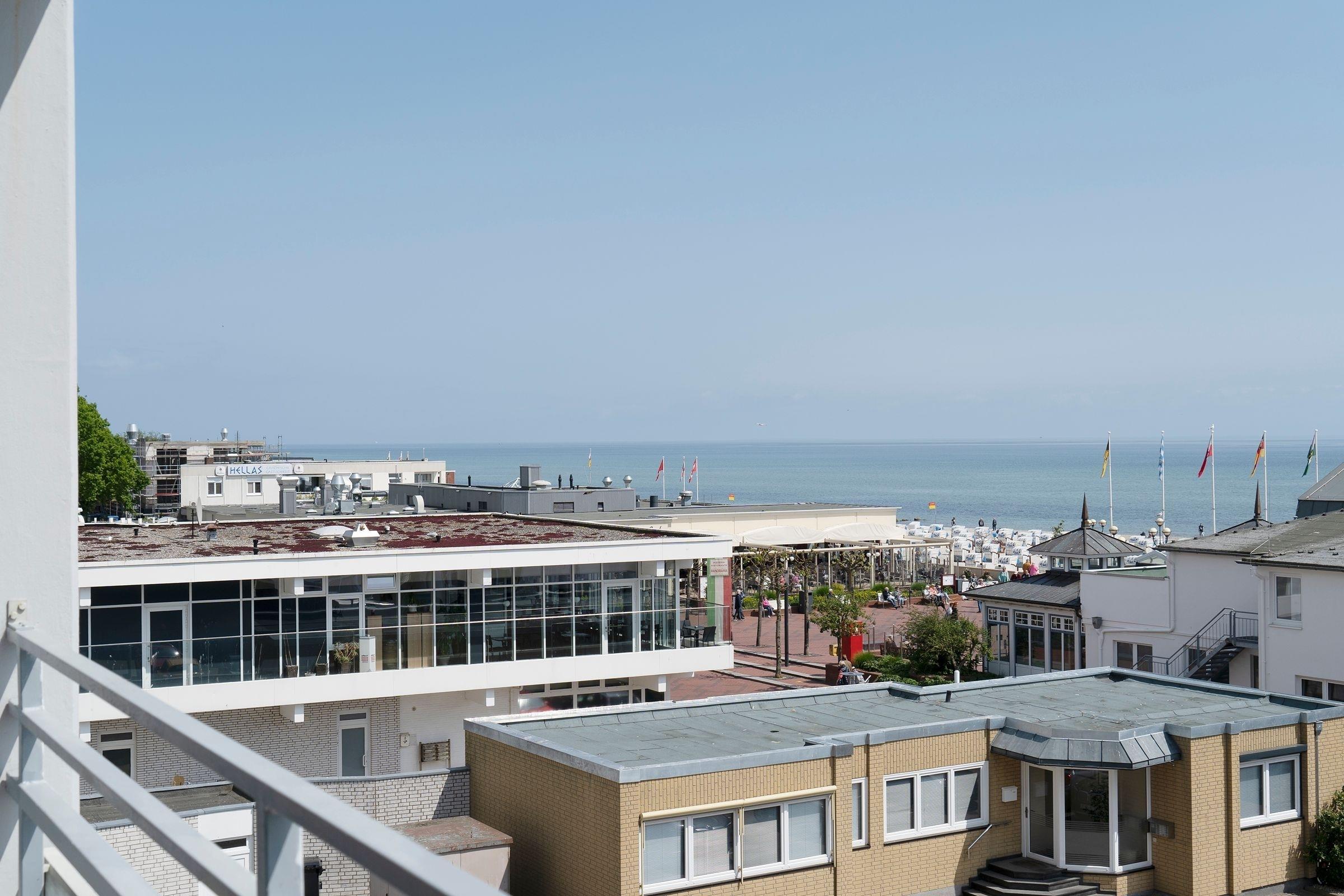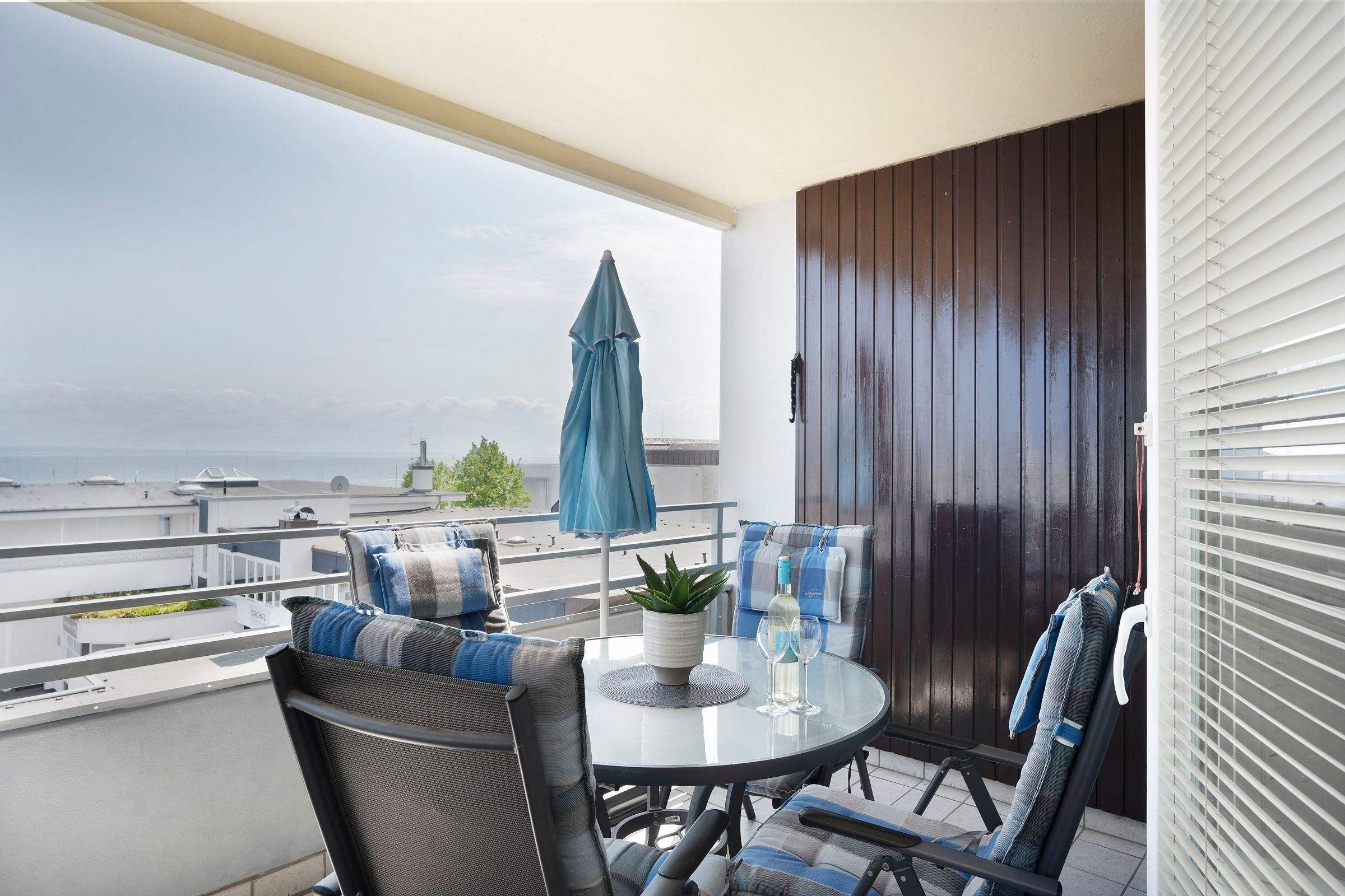 Moderne Ferienwohnung mit Balkon und Meerblick im Grömitz Center, nur wenige Gehminuten vom Strand entfernt.