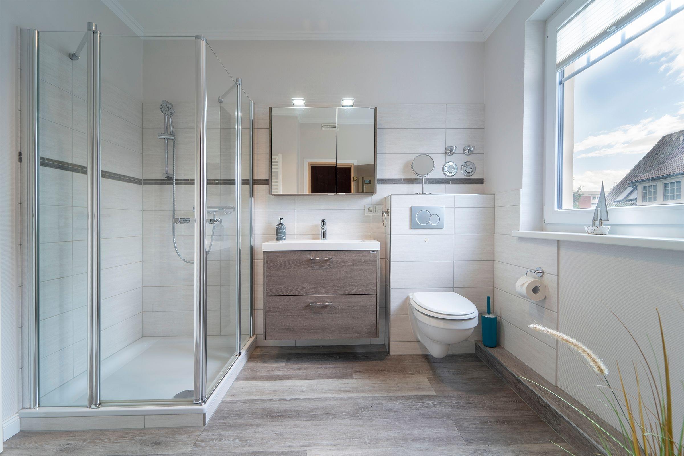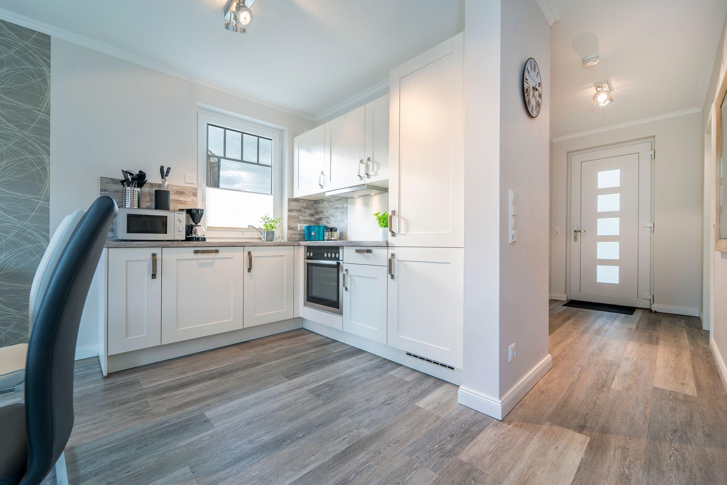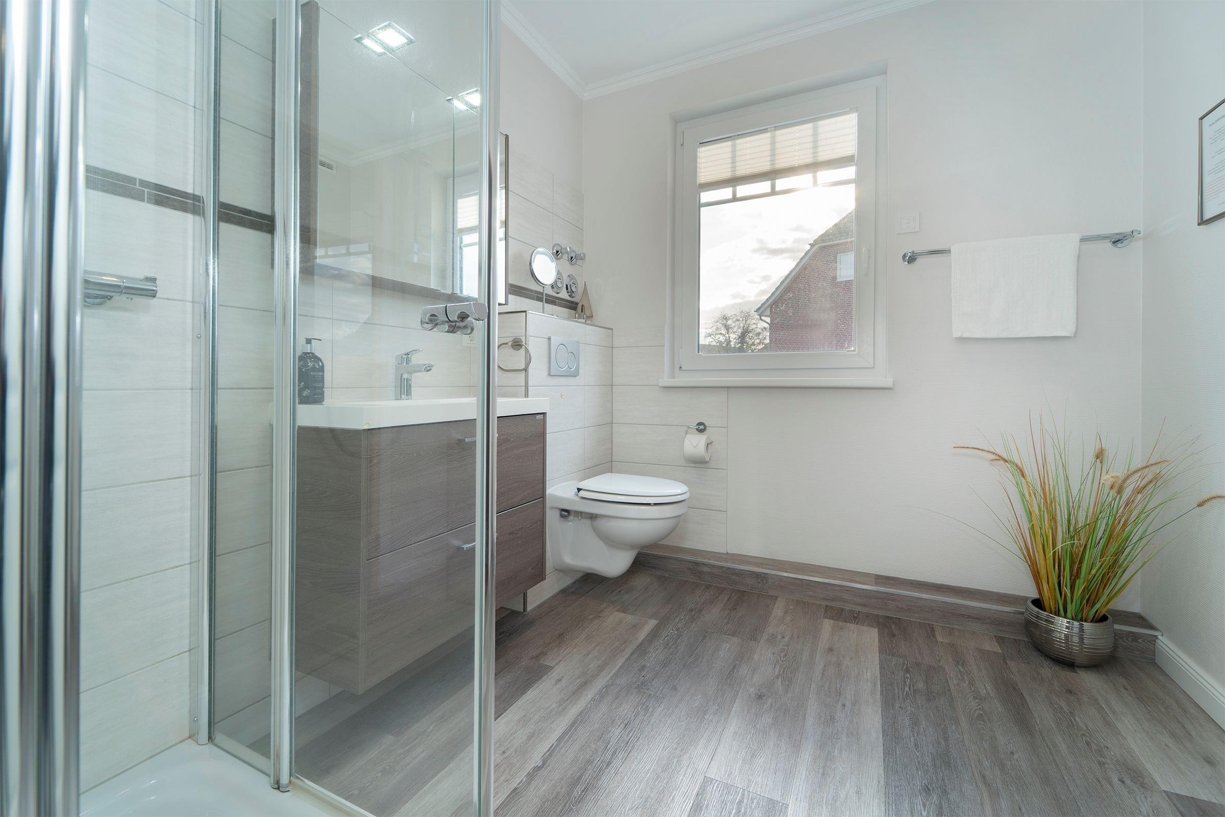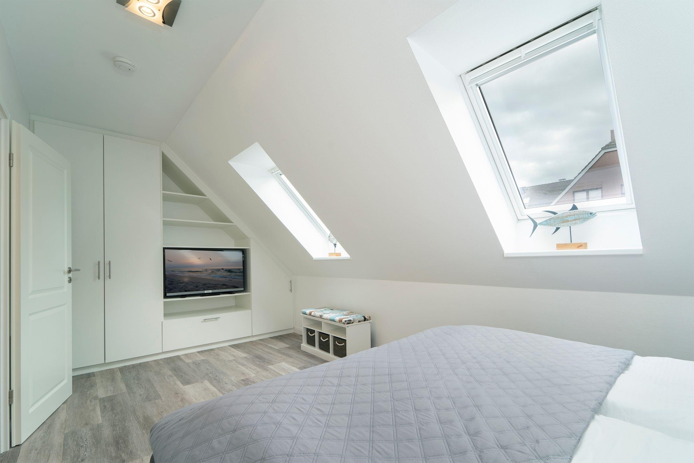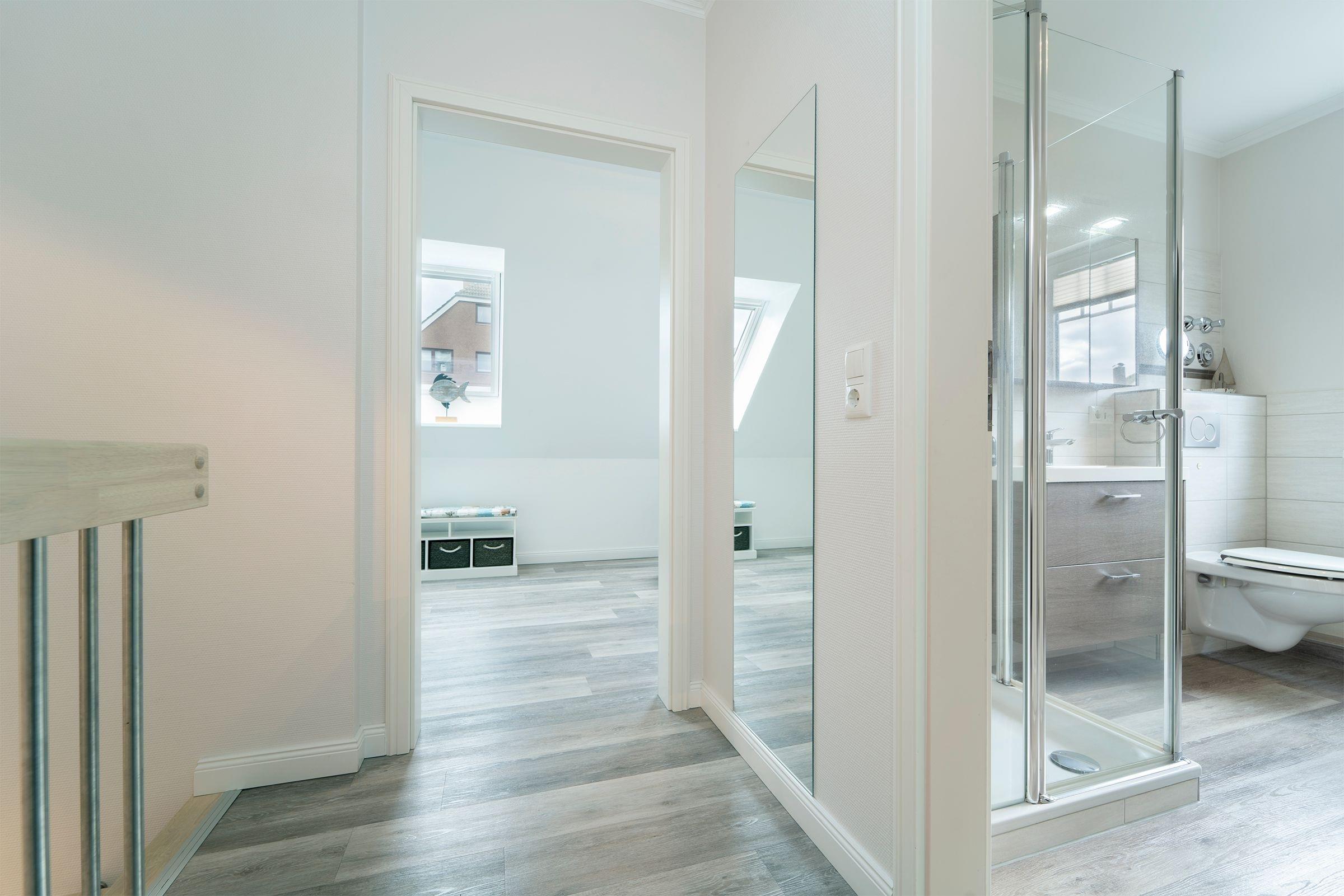 Im Erdgeschoss finden Sie ein helles, lichtdurchflutetes Wohnzimmer mit einer gemütlichen Sofalandschaft und einem modernen Flachbildfernseher. Im angrenzenden Essbereich trifft sich die ganze Familie um schöne Abende zu verbringen. In der komfortablen Küche bleiben keine Wünsche offen. Von der Spülmaschine, der Mikrowelle, einem Kühlschrank mit Gefrierfach und Backofen bis hin zum Wasserkocher und Toaster ist alles für Ihr perfektes Dinner vorhanden. Im Erdgeschoss steht ein Gästezimmer mit einem Einzelbett (Federkernmatratze, 90x200 cm) zur Verfügung. Auf gleicher Etage befindet sich ein Duschbad mit Waschbecken, WC und Waschmaschine gegen Gebühr. Das Haus verfügt über ein zweites, geräumiges Badezimmer mit Dusche und Sauna in der 1. Etage. Ebenfalls in der 1. Etage befinden sich zwei komfortable Schlafzimmer. Nach einem erlebnisreichen Urlaubstag finden Sie mit den hochwertigen Original ORTHOPÄDIKA Boxspring-Doppelbetten (180x200 cm bzw. 160x200 cm) problemlos Entspannung und Ruhe. In jedem Schlafzimmer befindet sich ein Einbauschrank und ein Flachbild-TV sowie Verdunklungsrollos.