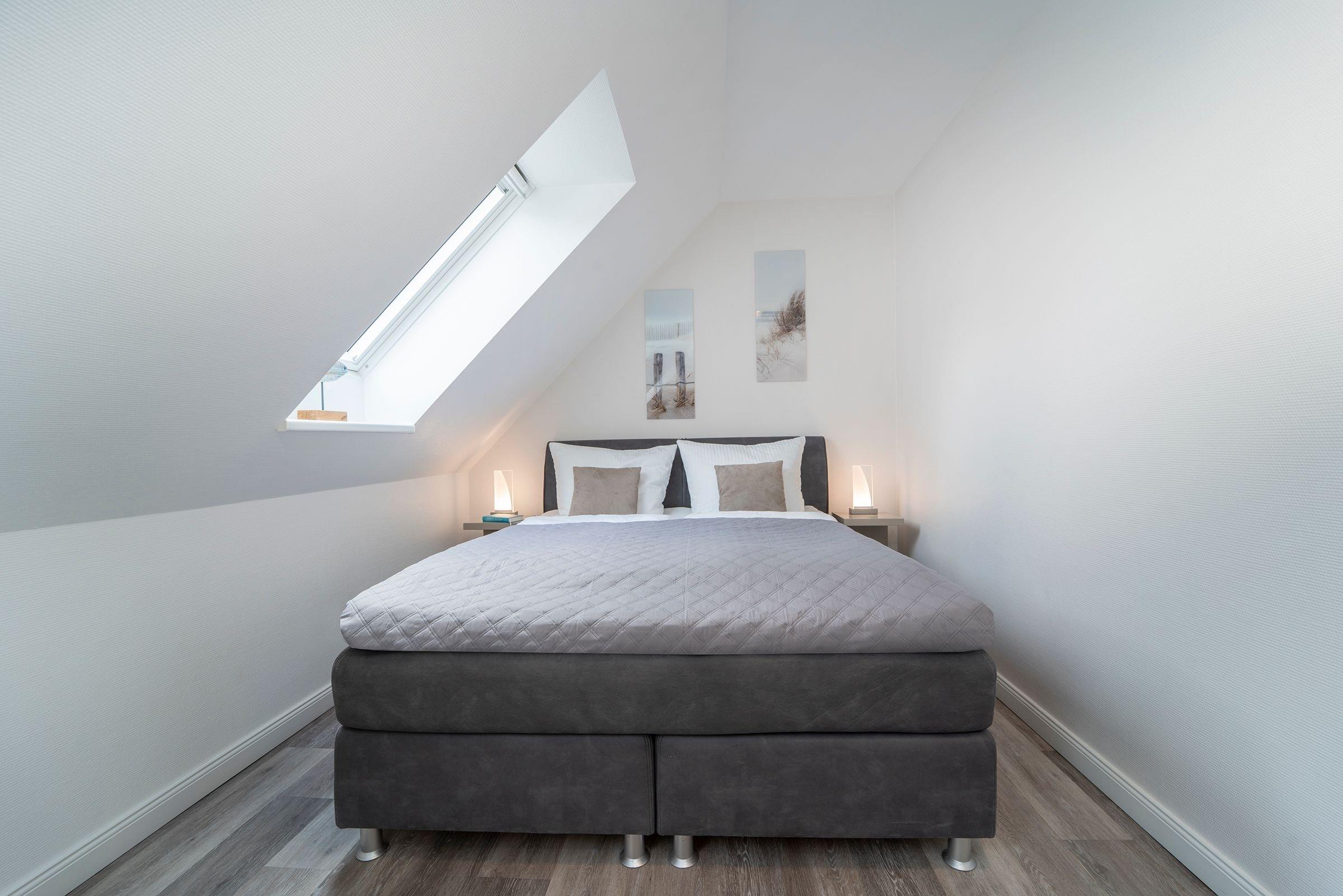 Schlafzimmer 2: Doppelboxspringbett (160x200 cm), im OG, Kleiderschrank, TV Verdunklungsrollos