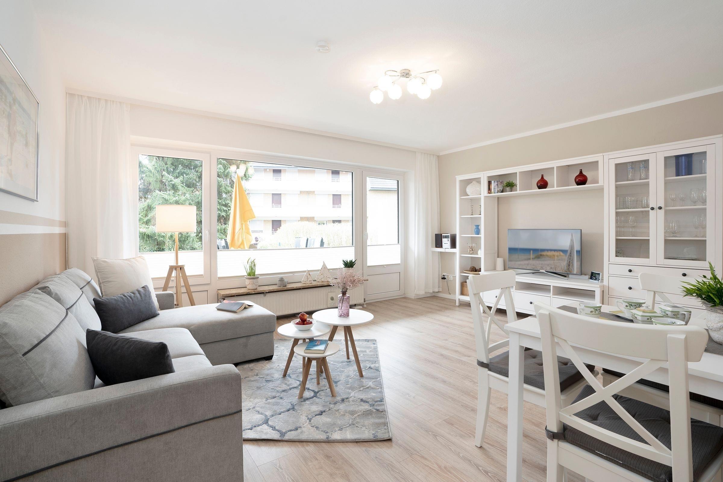Eine schöne 2-Zimmer-Ferienwohnung erwartet Sie in der Lübecker Bucht in guter Lage und mit guter Ausstattung! Im gemütlich eingerichteten Wohnzimmer befinden sich eine Couchecke sowie ein Esstisch, eine Schrankwand mit Flachbildschirm-Fernseher und eine Stereo-Anlage.