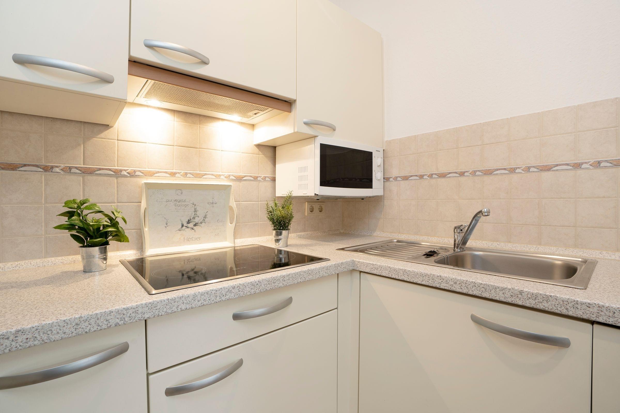 Es steht Ihnen eine Küche mit folgender Ausstattung zur Verfügung: Ceranfeldherd, Spülmaschine, Mikrowelle, Kühlschrank mit Gefrierfach und natürlich Kaffeemaschine, Toaster und Wasserkocher. Das Schlafzimmer ist ausgestattet mit einem Doppelbett (2x 90x200 cm) und großem Kleiderschrank, Nachtschränkchen mit Beleuchtung. Eine Ablage für Kleidung ist vorhanden. Das neuwertige Bad verfügt über Dusche/WC, beheizbaren Handtuchhalter und Waschbecken. Ein sonniger Balkon mit Relaxstühlen befindet sich vor dem Wohnzimmer - perfekt für ein Frühstück! Ebenso können Sie hier kostenfrei das WLAN nutzen.