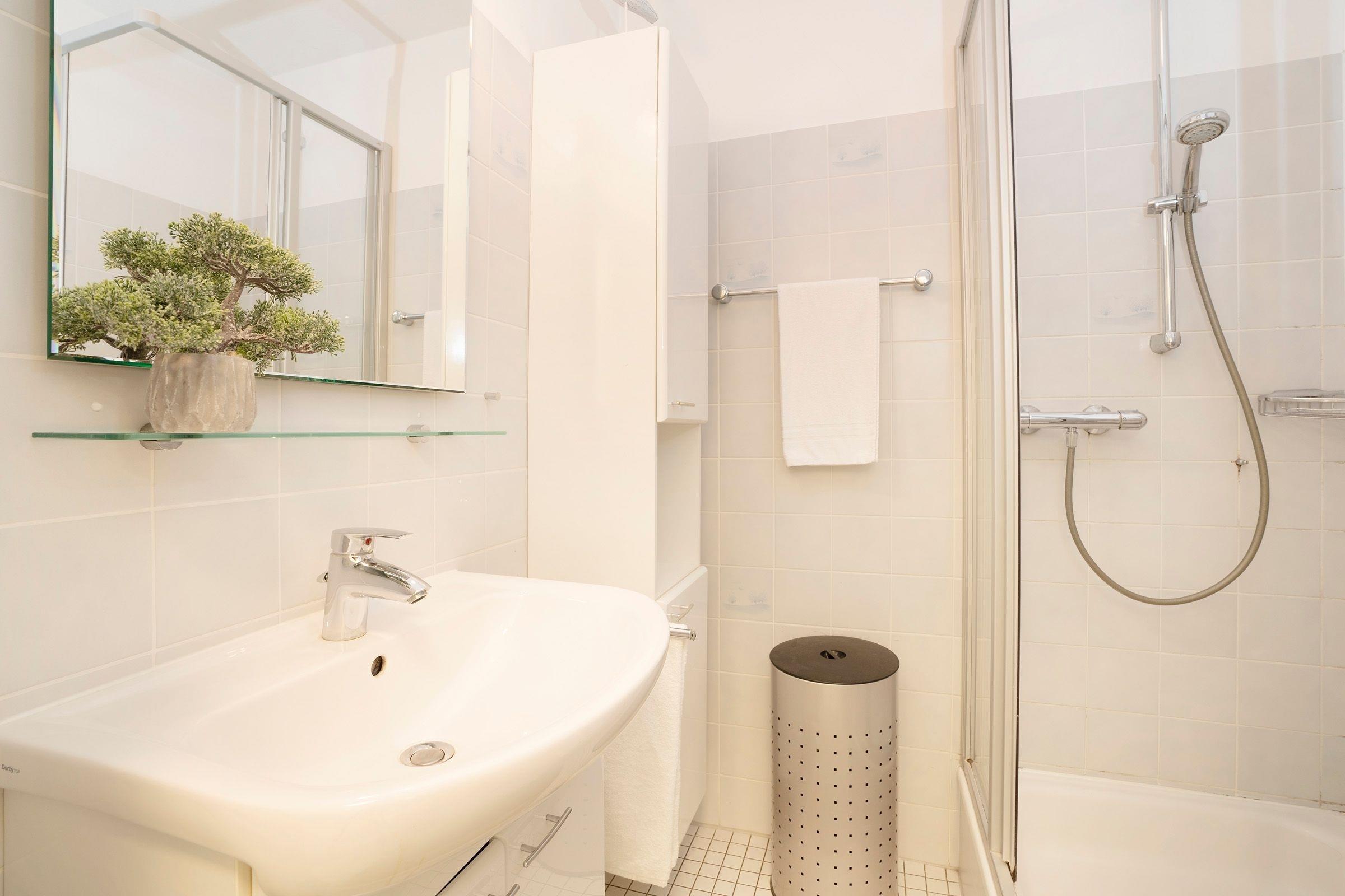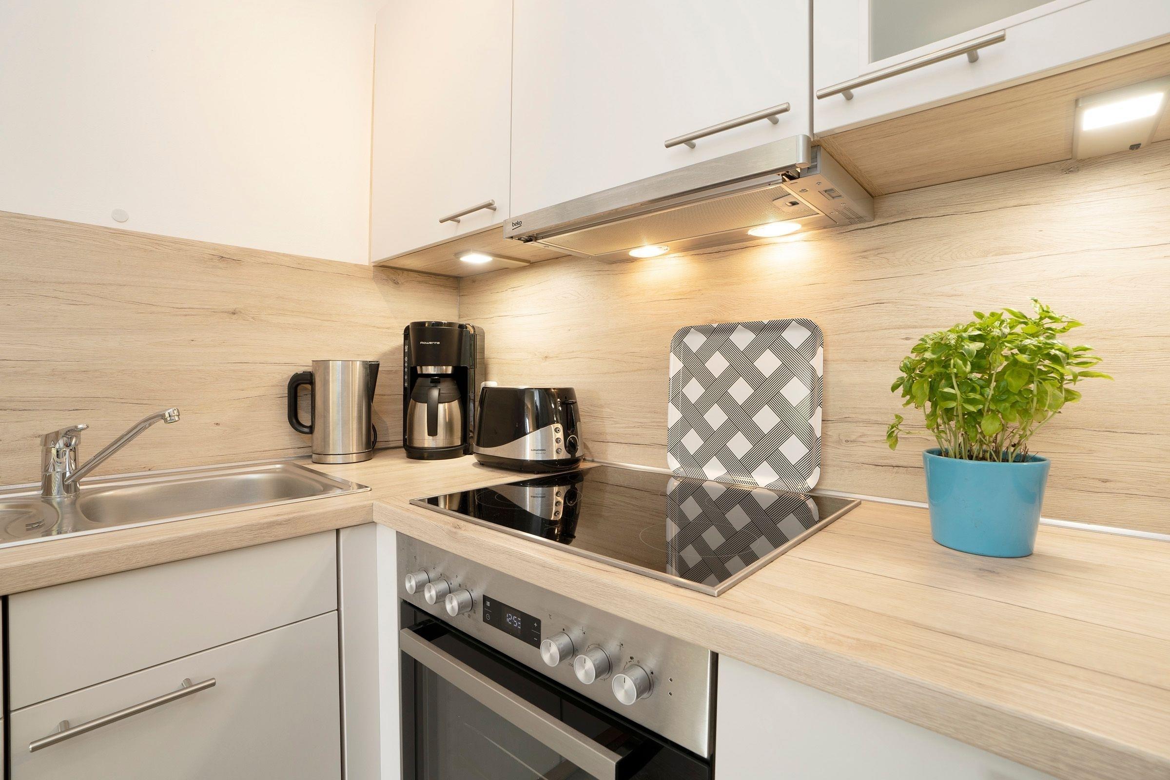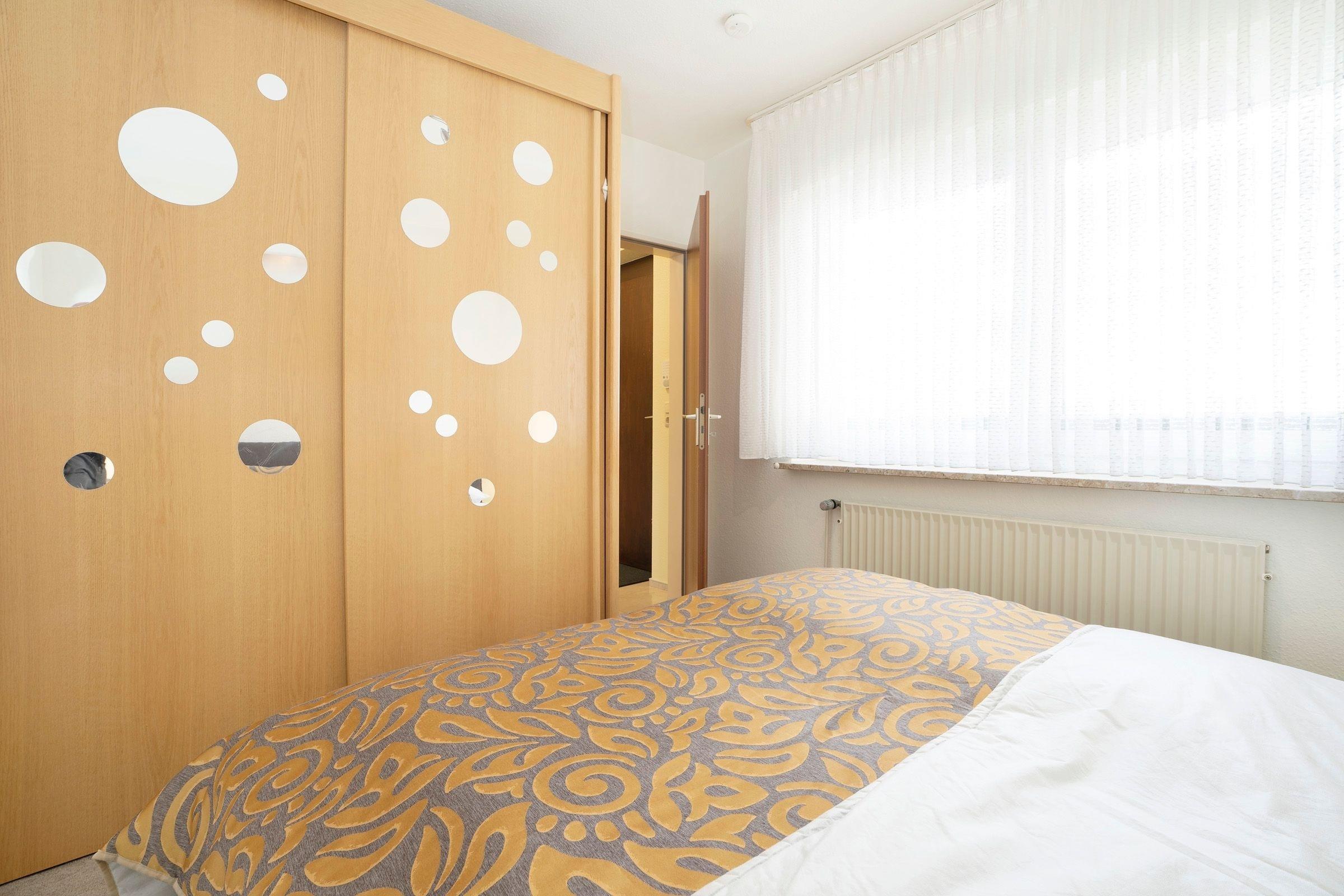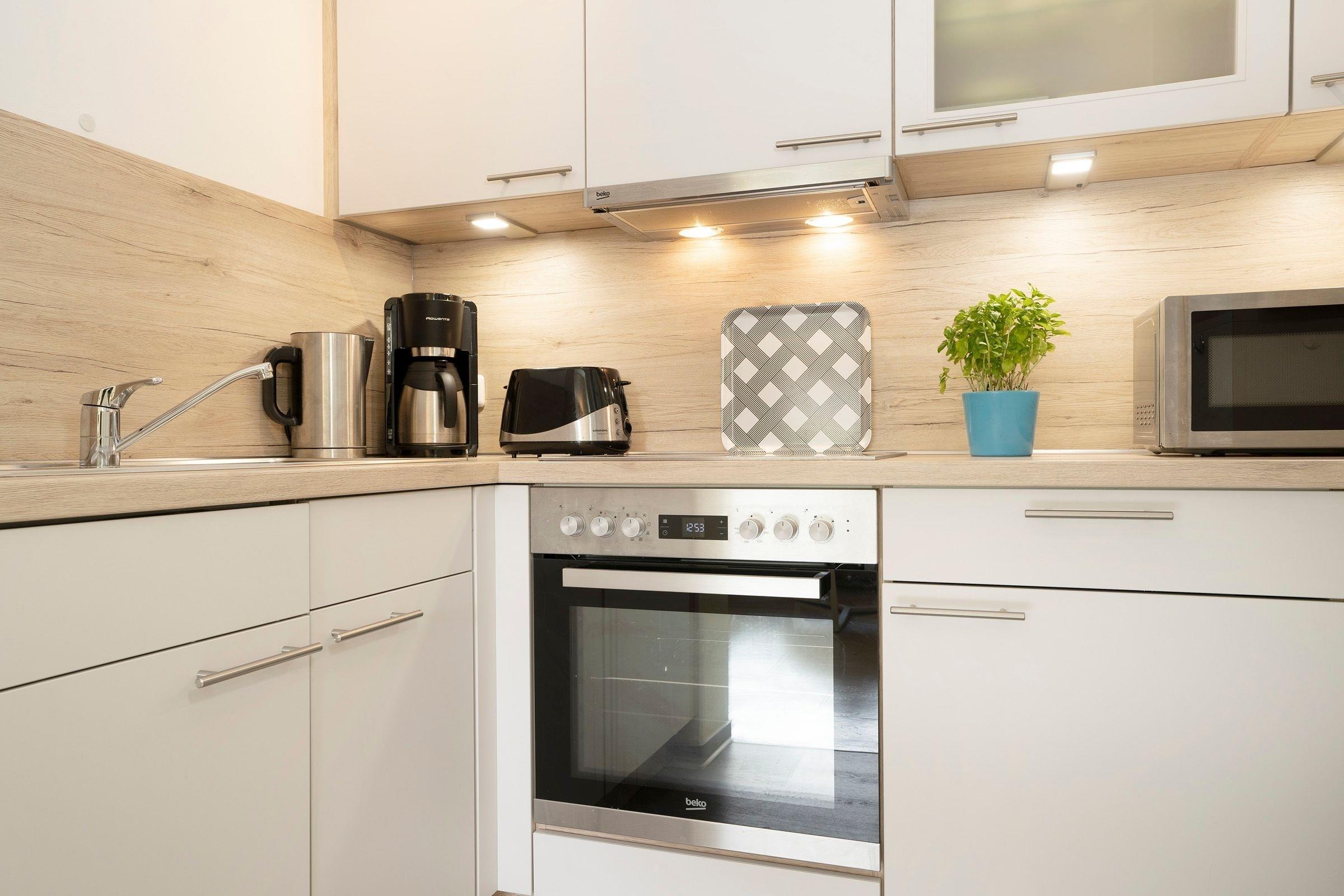 Das moderne Wohnzimmer bietet eine große Couchecke sowie eine Essecke, wo selbst gekochte Speisen genossen werden können. Diese können in der gut ausgestatteten Küche mit Herd/Backofen, Mikrowelle, Kühlschrank, Toaster, Kaffeemaschine uvm. zubereitet werden. Weiterhin finden Sie in der Ferienwohnung einen Flachbild-TV, Stereo-Anlage und einen Video-Recorder vor. Das Schlafzimmer ist ausgestattet mit einem Doppelbett (2x 90x200 cm) und großem Kleiderschrank. Ein Verdunkelungsplissee sorgt für ungestörten Schlaf. Es gibt ein Badezimmer mit Dusche/WC (Badmöbel). Der WLAN-Anschluss ist für Sie inklusive.