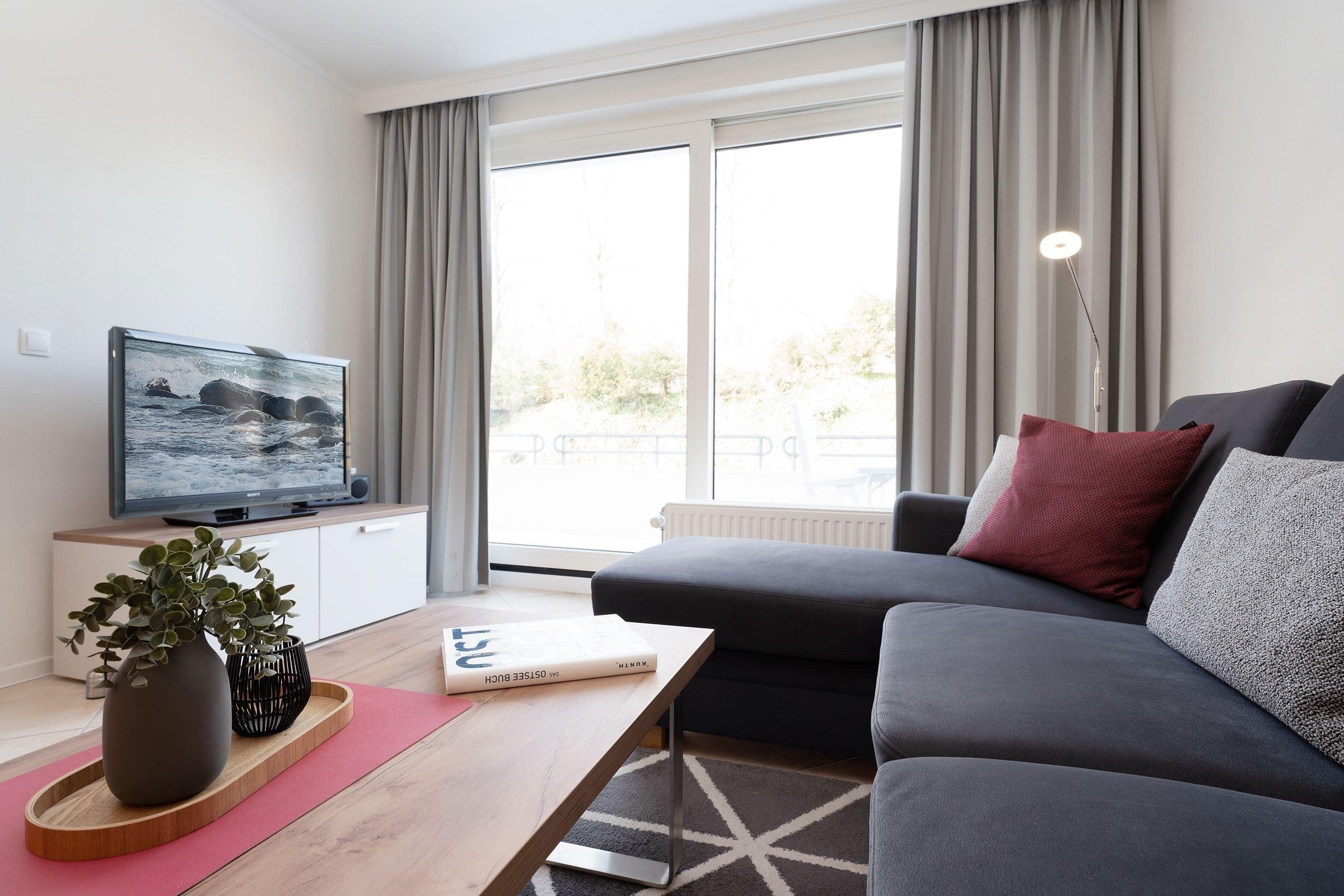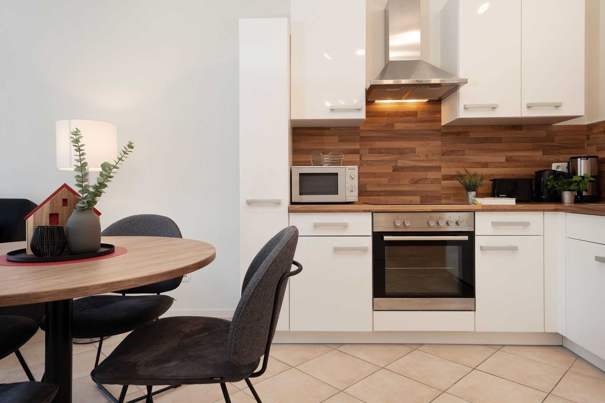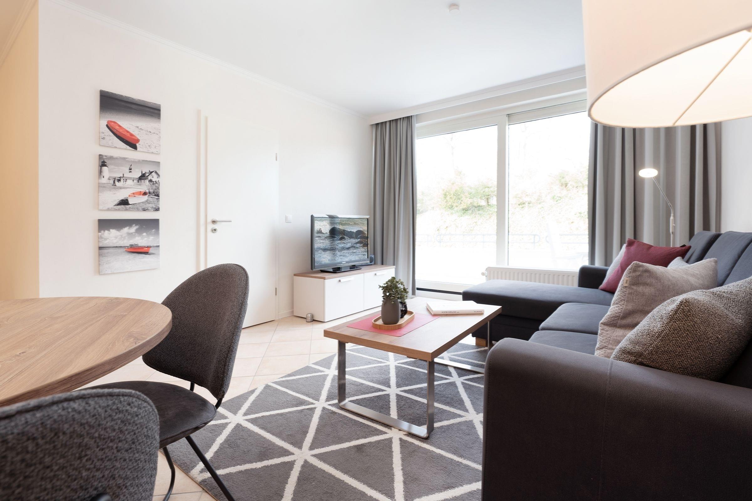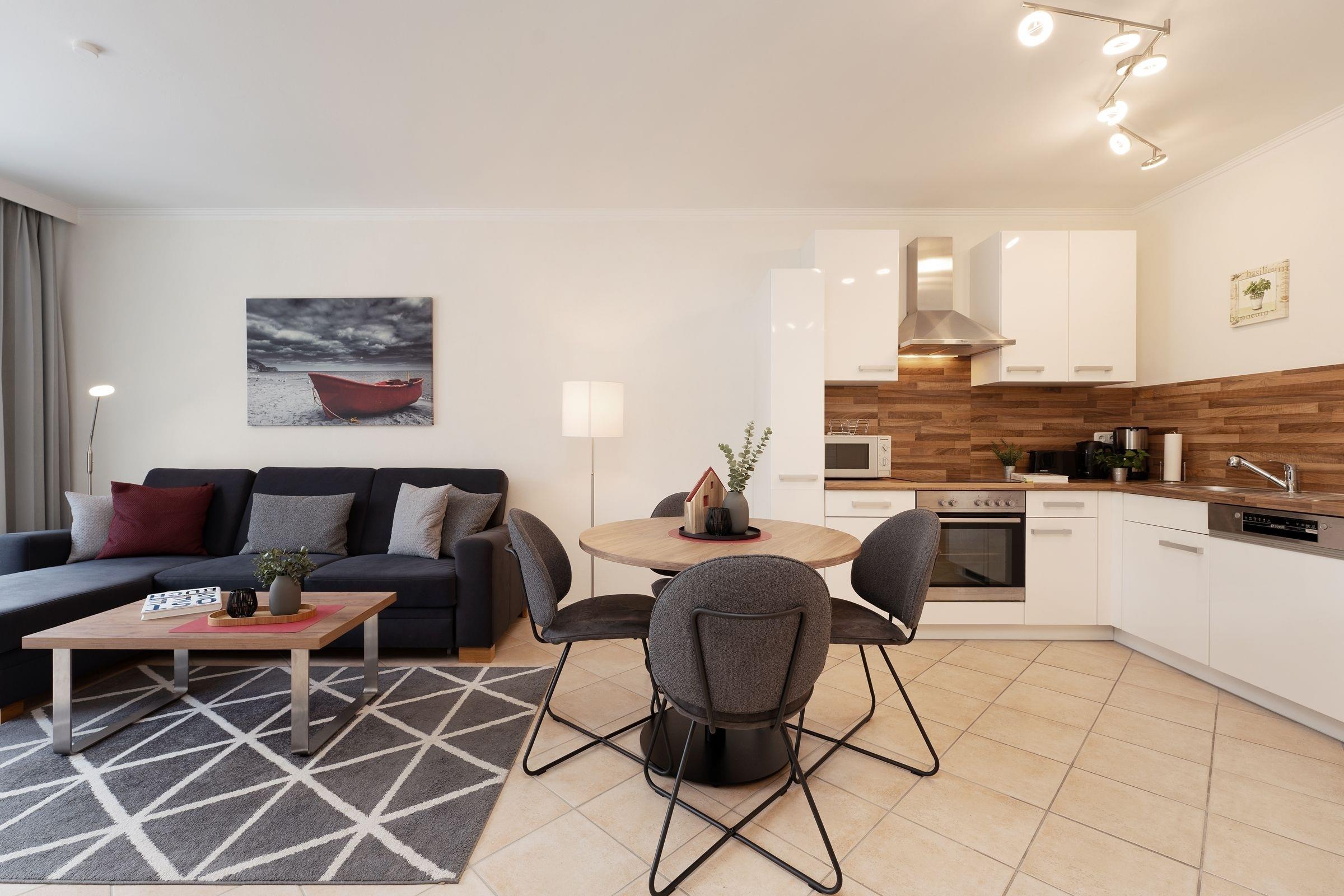 Das Herzstück dieser geschmackvolle 2-Zimmer-Ferienwohnung ist der offen gestaltete Wohn-/Essbereich mit moderner integrierter Küche, stilvollem Essplatz für 4 Personen, komfortabler Sofalandschaft mit Flatscreen-TV sowie Blick ins Grüne und Balkonzugang Richtung Kurpark. Auf 55 m² Wohnfläche finden hier bis zu 4 Personen ausreichend Platz und Komfort.