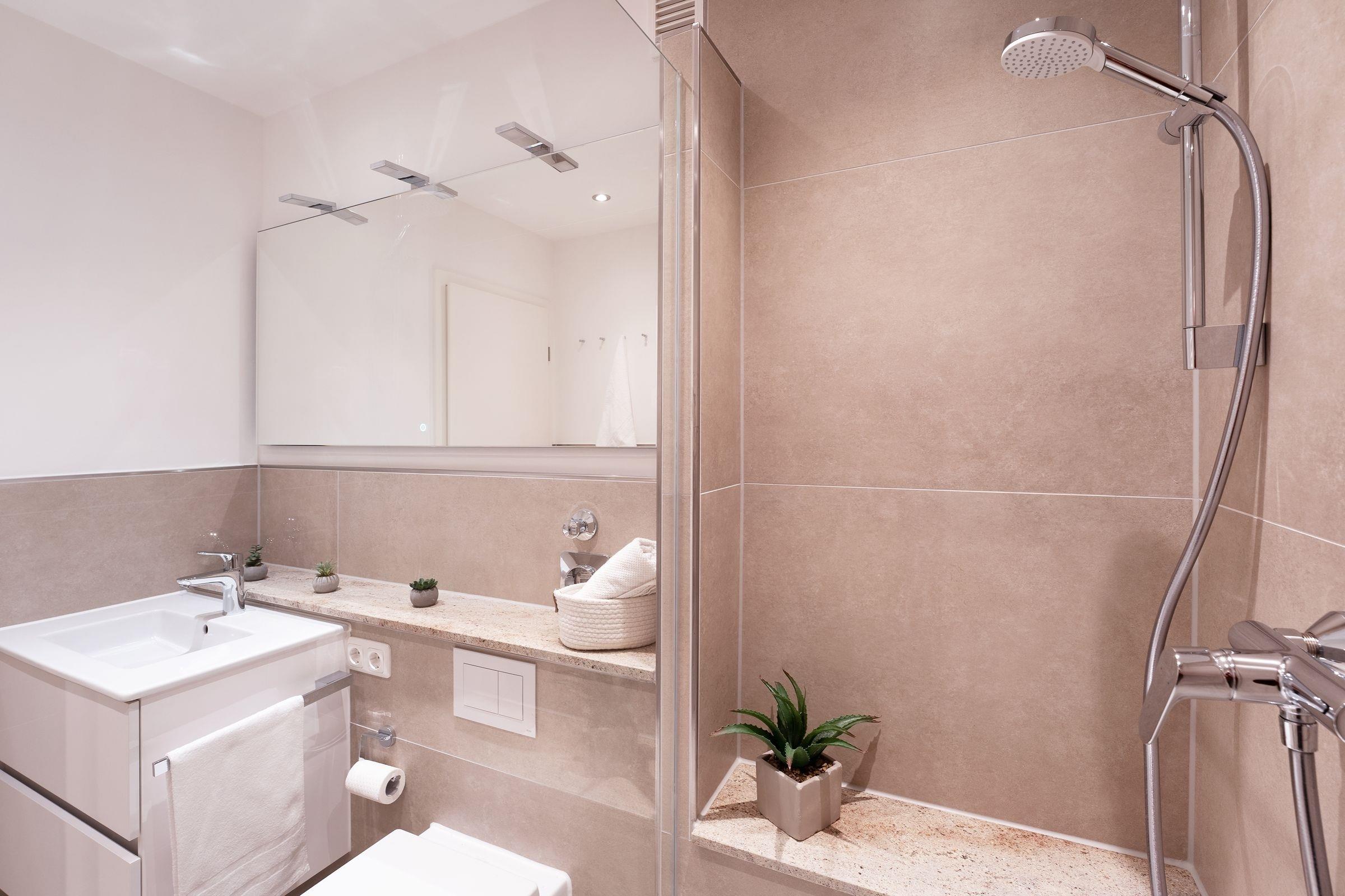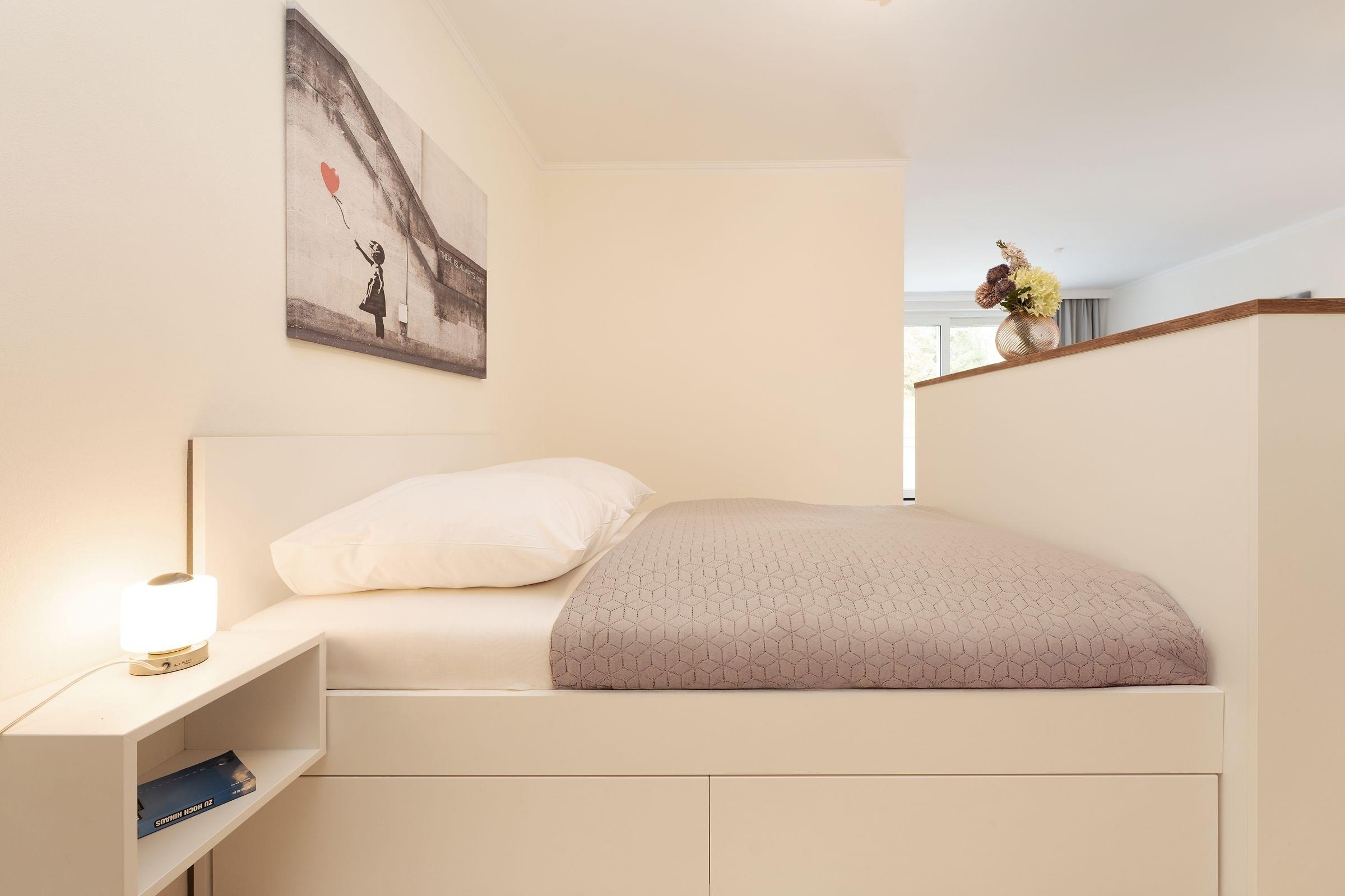 Das separate Schlafzimmer ist mit einem hochwertigen Boxspringbett (160 cm x 200 cm) und einem modernen Kleiderschrank mit ausreichend Staufläche ausgestattet, im Wohnzimmer bietet ein Schlafbereich mit einem bequemen Doppelbett (2x 80x200 cm) einen weiteren Schlafplatz. Die Küche bietet tolle Alltagshelfer wie einen 4-Platten-Ceranherd, Kühlschrank mit Gefrierfach und Spülmaschine. Das moderne Badezimmer besticht durch eine stilvolle Dusche, hochwertige Armaturen und ein harmonisches Design, das Komfort und Eleganz vereint.