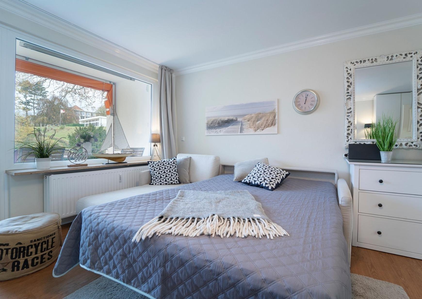 Neu in 2026: Eine komplett neue, hochwertige Schlafcouch, die mit einem Handgriff in ein komfortables Bett (ca. 150x200 cm) verwandelt werden kann. Die neue Couch sorgt nun für deutlich mehr Liegekomfort (neue Fotos folgen in Kürze).