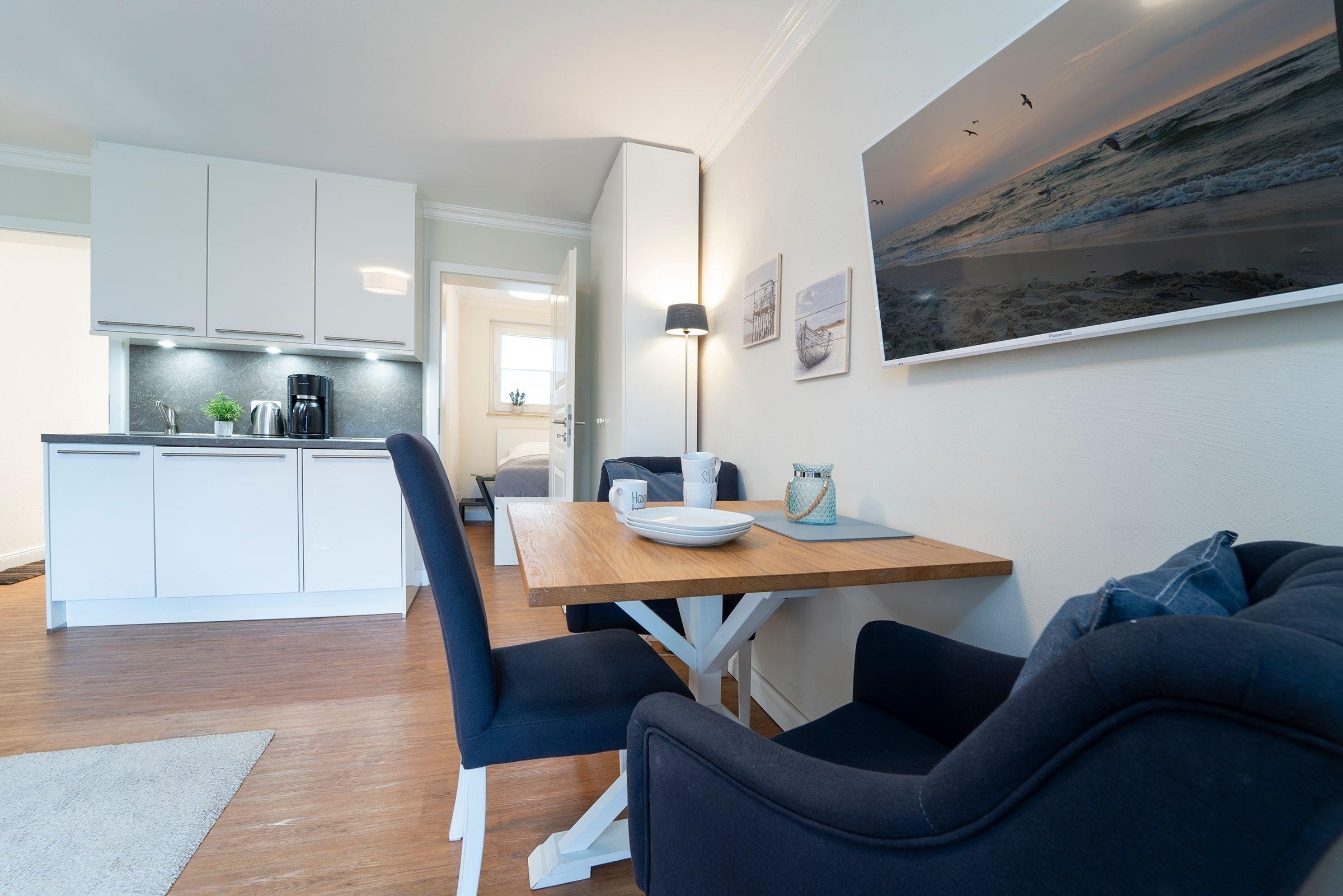 Zur Ausstattung gehören außerdem eine gemütliche Wohn- und Kuschelecke, eine integrierte Küchenzeile mit Essplatz, ein separates Schlafzimmer mit Einzelbett (90x200 cm) sowie ein modernes Bad mit Dusche und WC. Alles ist harmonisch aufeinander abgestimmt – mit viel Liebe zum Detail renoviert und dekoriert.
