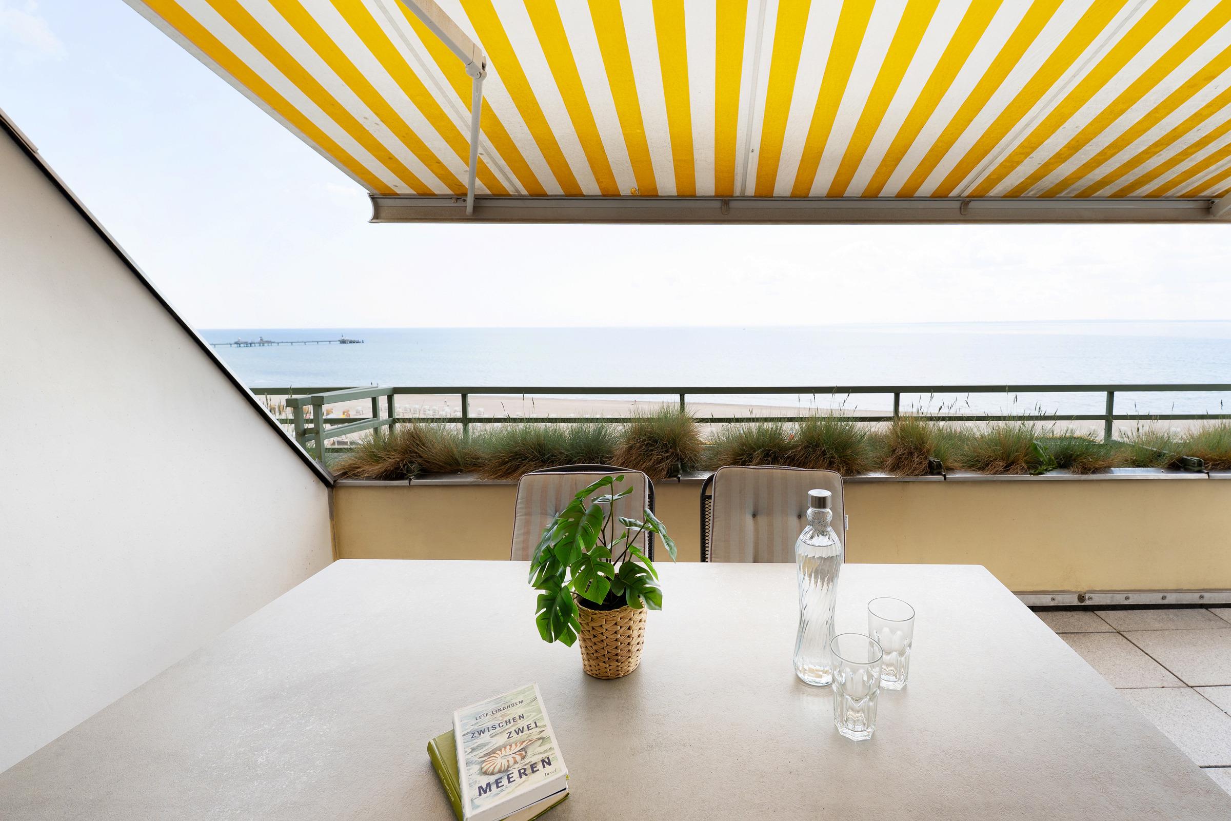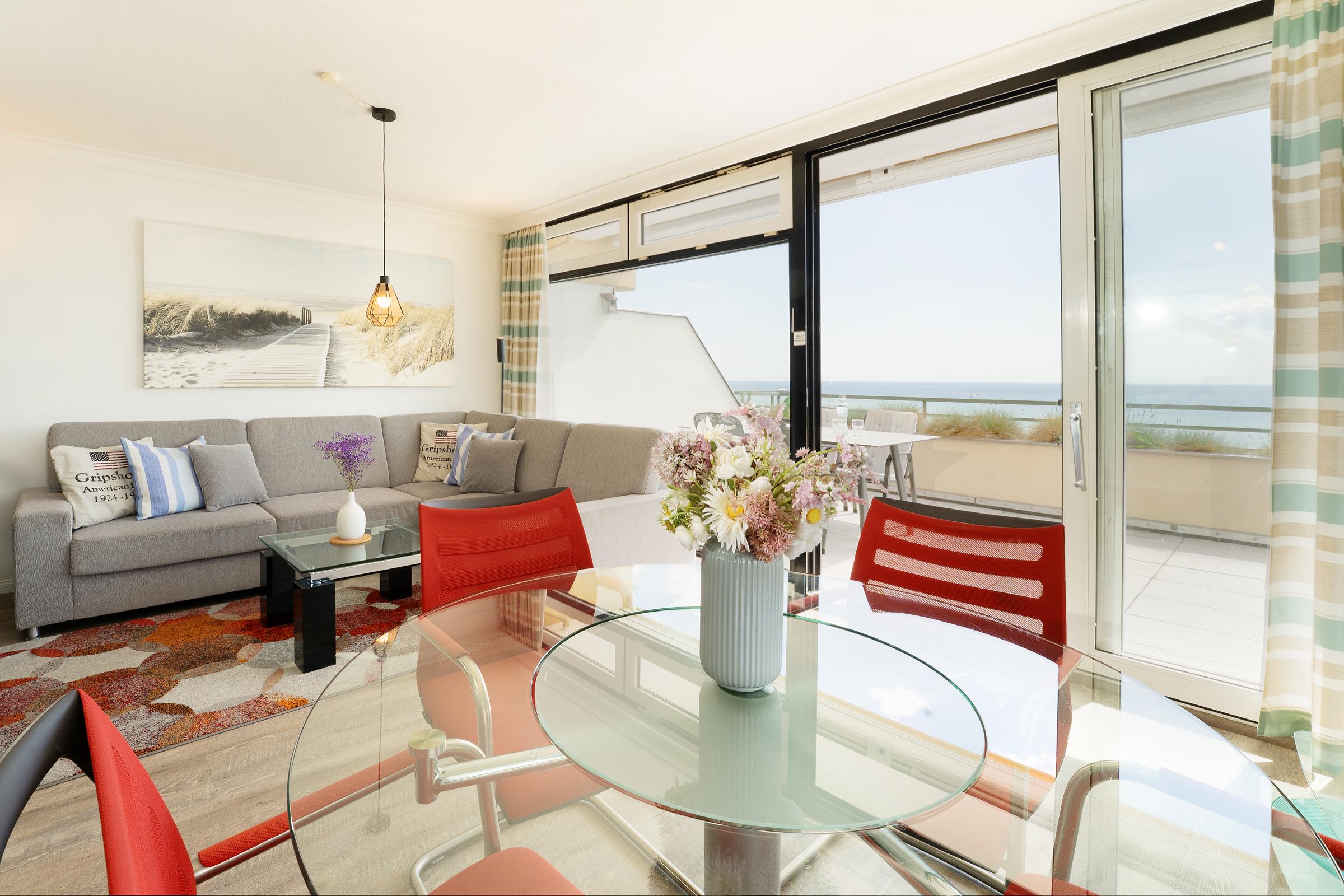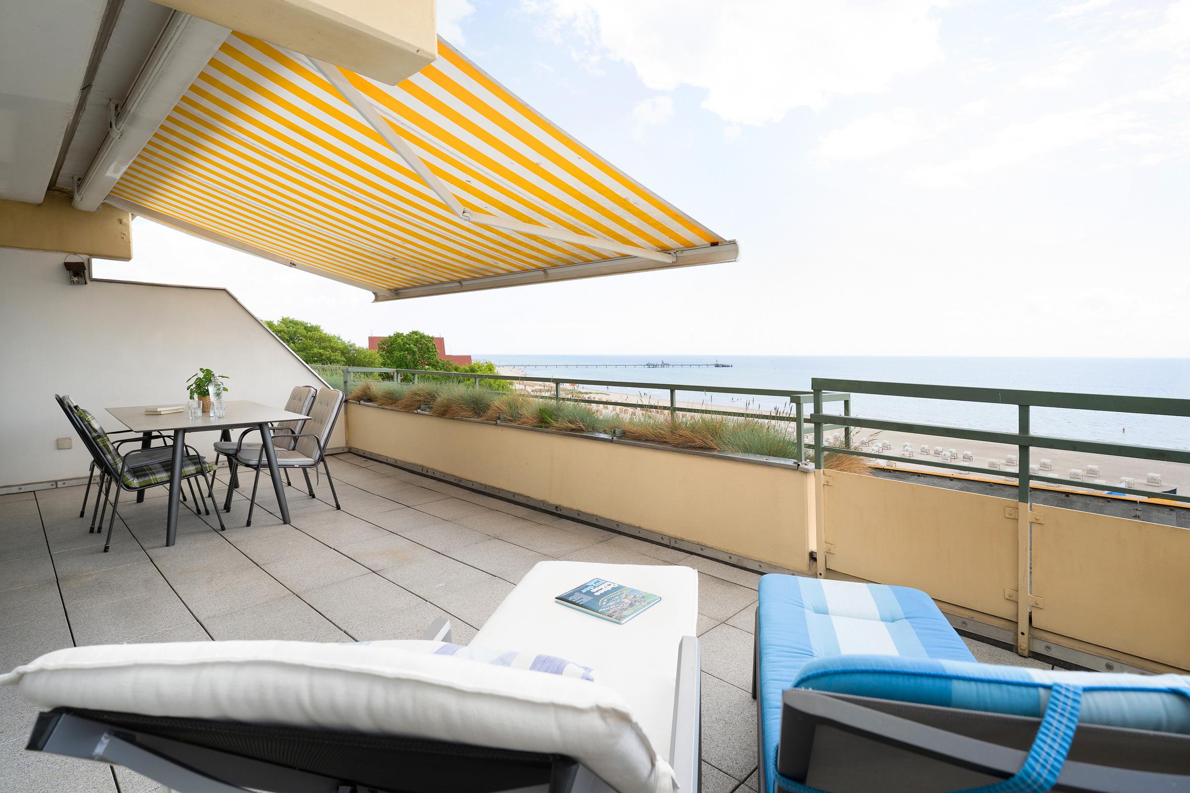 Ein traumhafter Blick auf die Ostsee und den Strand erwartet Sie in dieser komfortabel und geschmackvoll eingerichteten Ferienwohnung mit großer Balkonterrasse. Es gibt ein geräumiges Wohnzimmer mit umlaufender Fensterfront und Flachbildfernseher, eine große Rundcouchecke, eine offene Küche - gut ausgestattet mit Backofen, Ceranfeldherd, Spülmaschine, großer Kühlschrank mit Gefrierfach - sowie eine Esstheke mit 4 Hockern. Ebenfalls steht Ihnen ein runder Esstisch mit Stühlen zur Verfügung, auch von hier genießen Sie den Seeblick. Entspannen Sie in den Schlafzimmern mit Doppelbetten (SZ1: 2x 90x200 cm und SZ 2: 2x 80x200 cm), Dachterrassenzugang und zusätzlichem TV in einem der beiden Schlafzimmer. Die Schlafzimmer verfügen über verdunkelnde Gardinen. Das moderne Badezimmer ist ausgestattet mit Badmöbeln, Waschbecken und ebenerdiger Dusche mit Echtglasabtrennung.