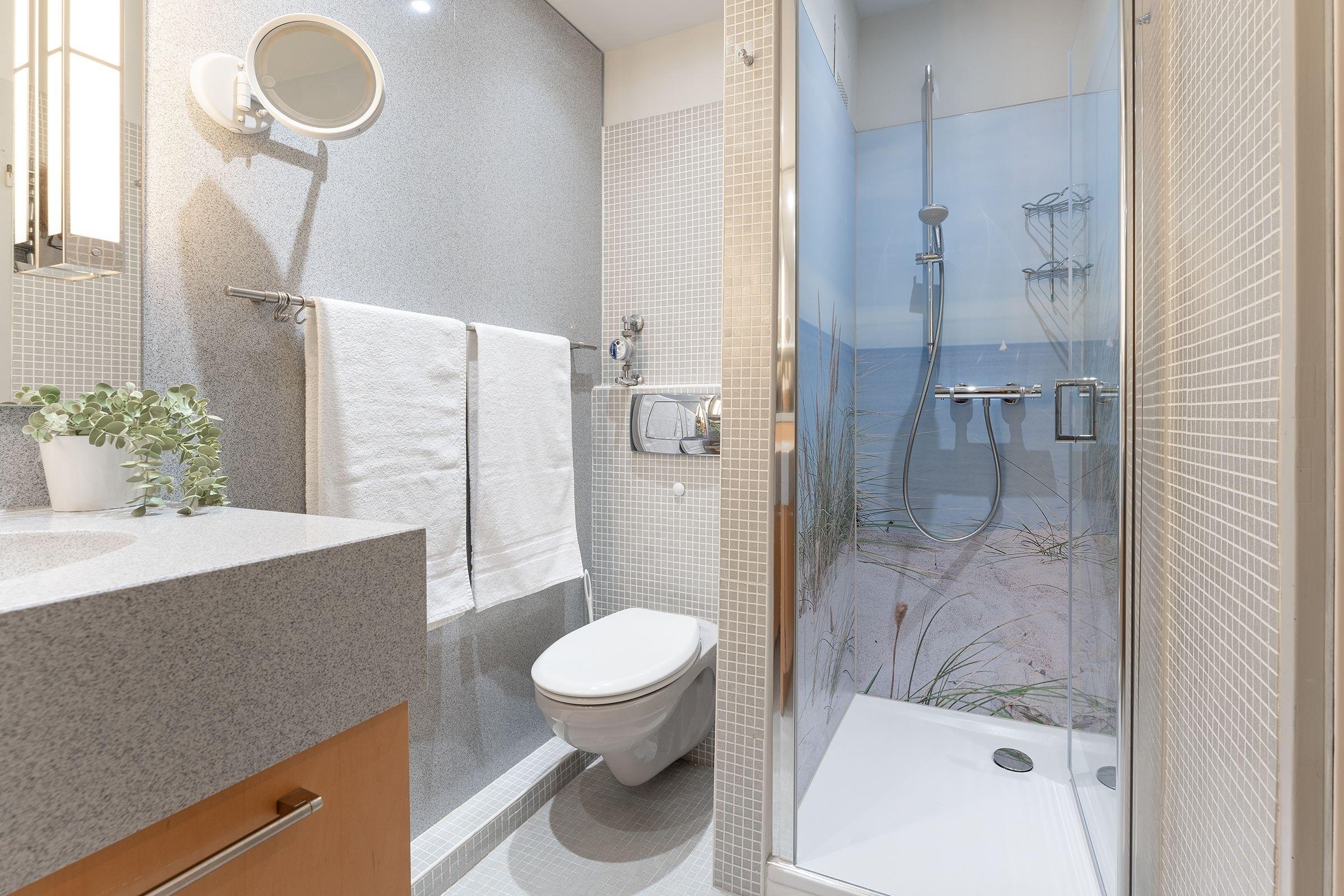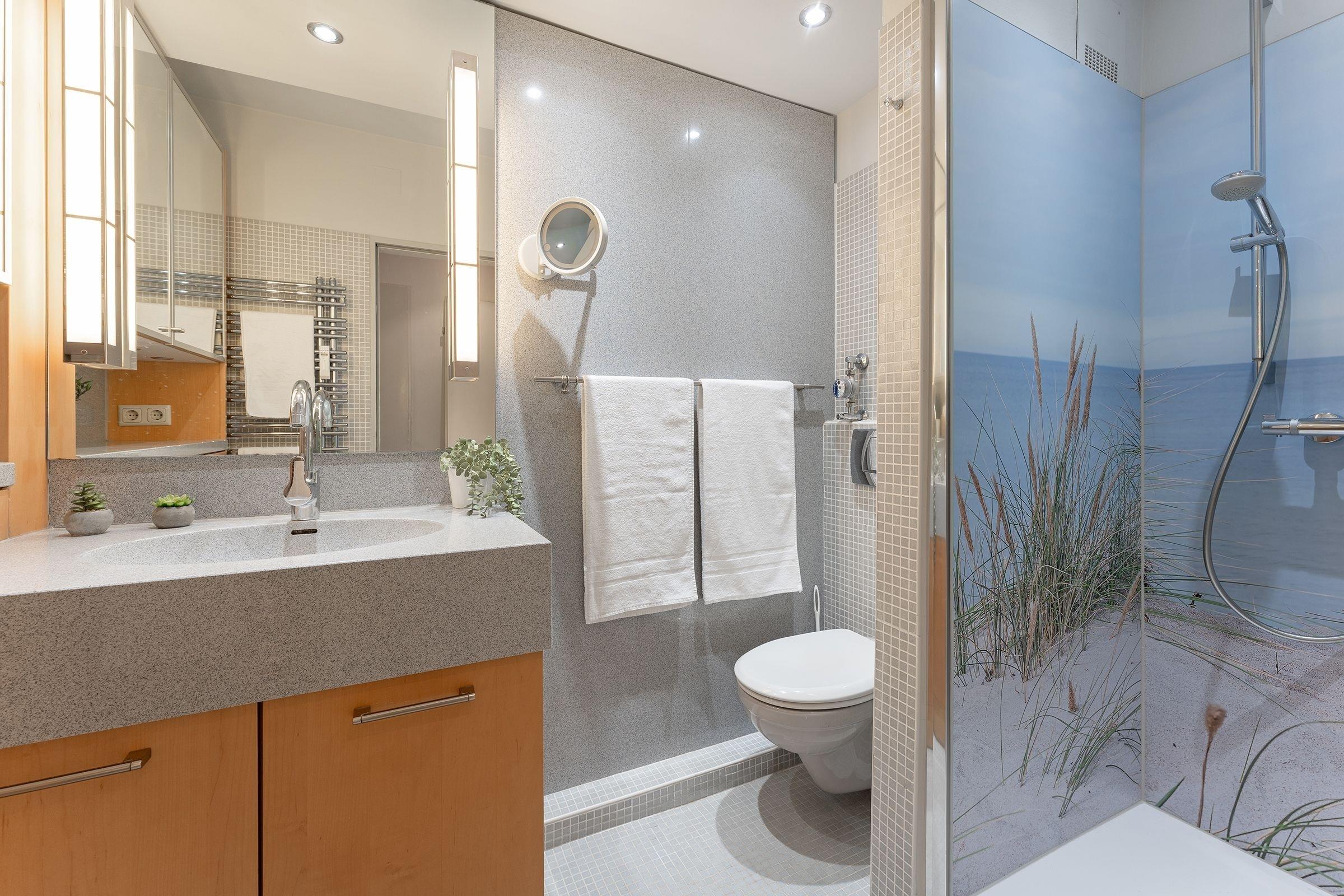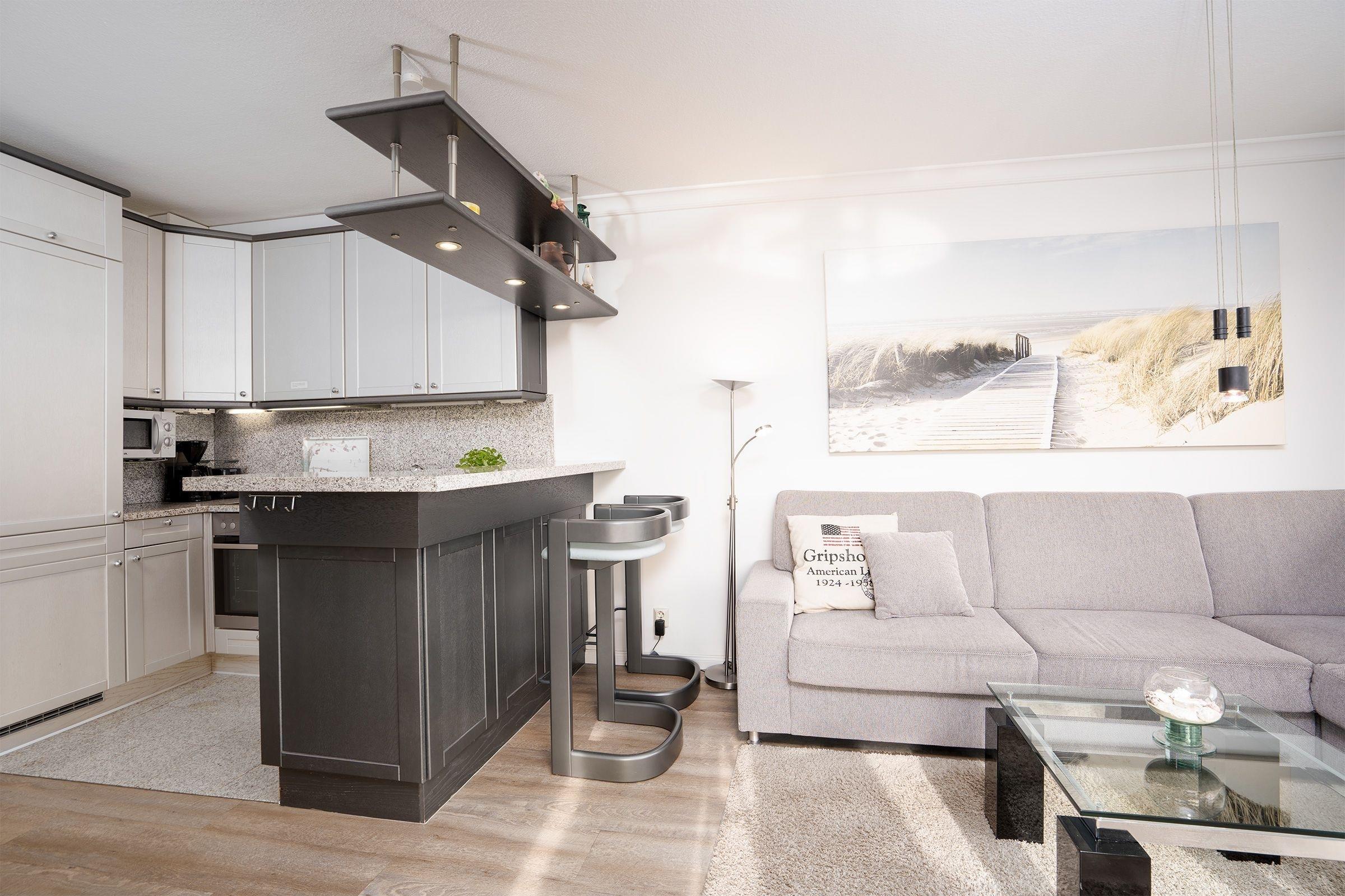 Ein traumhafter Blick auf die Ostsee und den Strand erwartet Sie in dieser komfortabel und geschmackvoll eingerichteten Ferienwohnung mit großer Balkonterrasse. Es gibt ein geräumiges Wohnzimmer mit umlaufender Fensterfront und Flachbildfernseher, eine große Rundcouchecke, eine offene Küche - gut ausgestattet mit Backofen, Ceranfeldherd, Spülmaschine, großer Kühlschrank mit Gefrierfach - sowie eine Esstheke mit 4 Hockern. Ebenfalls steht Ihnen ein runder Esstisch mit Stühlen zur Verfügung, auch von hier genießen Sie den Seeblick. Entspannen Sie in den Schlafzimmern mit Doppelbetten (SZ1: 2x 90x200 cm und SZ 2: 2x 80x200 cm), Dachterrassenzugang und zusätzlichem TV in einem der beiden Schlafzimmer. Die Schlafzimmer verfügen über verdunkelnde Gardinen. Das moderne Badezimmer ist ausgestattet mit Badmöbeln, Waschbecken und ebenerdiger Dusche mit Echtglasabtrennung.
