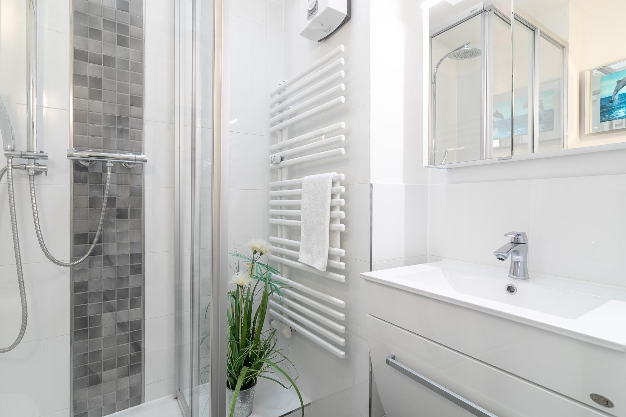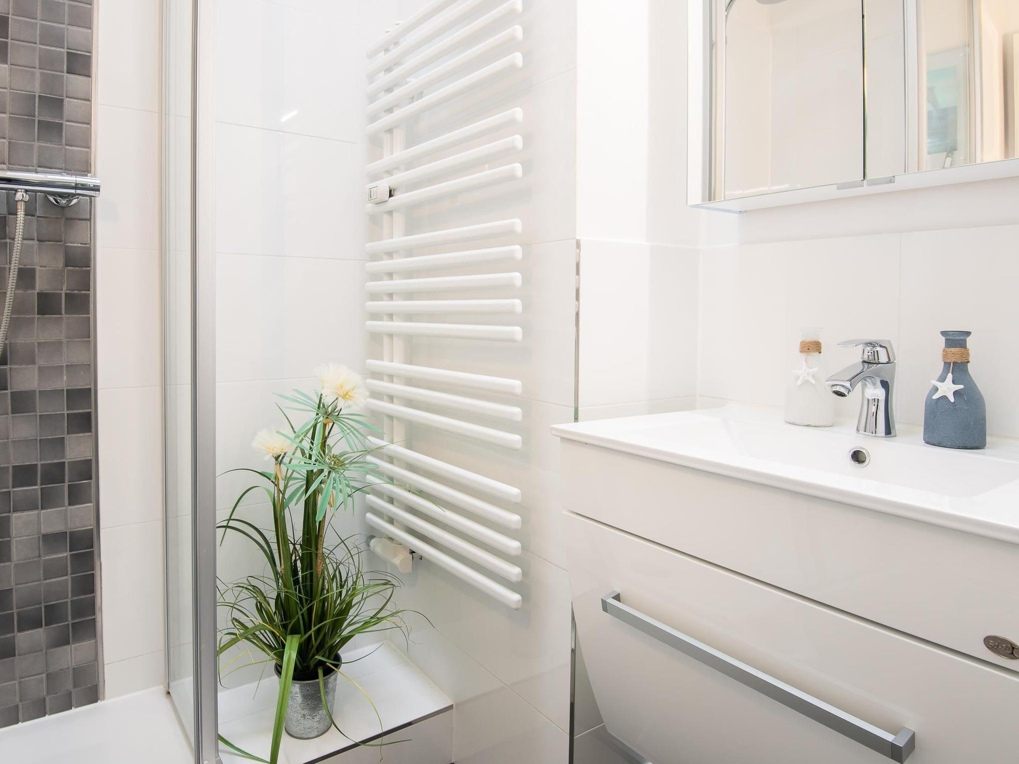 Die Wohnung begrüßt Sie im Eingangsbereich mit einer Garderobe und einem Spiegel. Links vom Flur abgehend finden Sie das Schlafzimmer vor, welches mit einem großen Doppelbett (2x 90x190 cm) sowie einem geräumigen Kleiderschrank überzeugt. Auf der rechten Wohnungsseite liegt zunächst die z. B. mit einer Nescafé Dolce Gusto (Kapseln sind selbst mitzubringen) ausgestattete Küche sowie ein modernes Duschbad. Vom Wohn-/Esszimmer mit einer dritten Schlafmöglichkeit (Schlafcouch ca. 120x180 cm) gelangen Sie schließlich auf einen schönen und geräumigen Balkon.