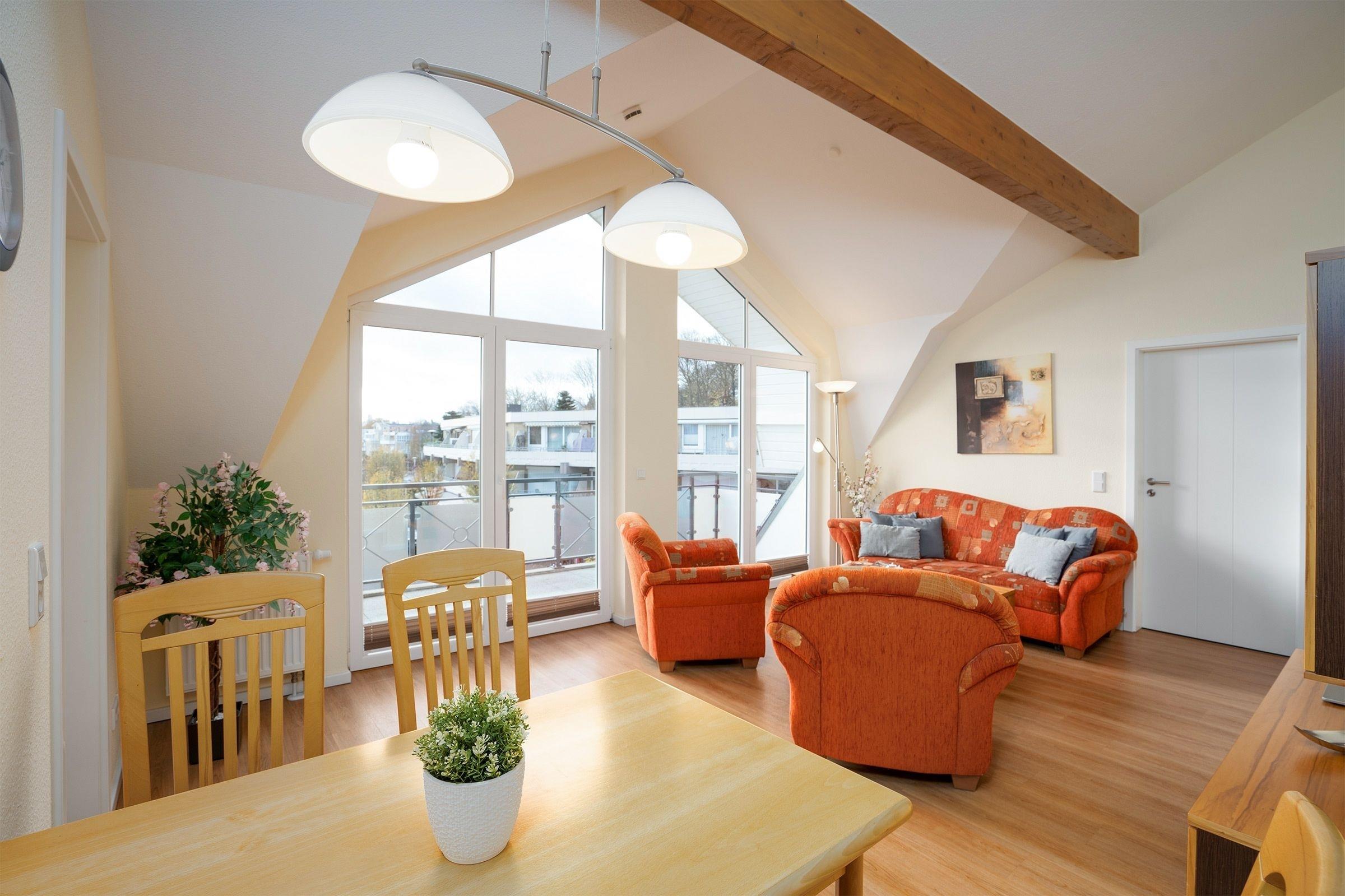 Zentral, strandnah und barrierearm - diese 3-Zimmer-Ferienwohnung befindet sich in der 2. Etage einer modernen Appartementhausanlage im Herzen von Grömitz. Die Dachgeschosswohnung erreichen Sie bequem mit dem Fahrstuhl.
