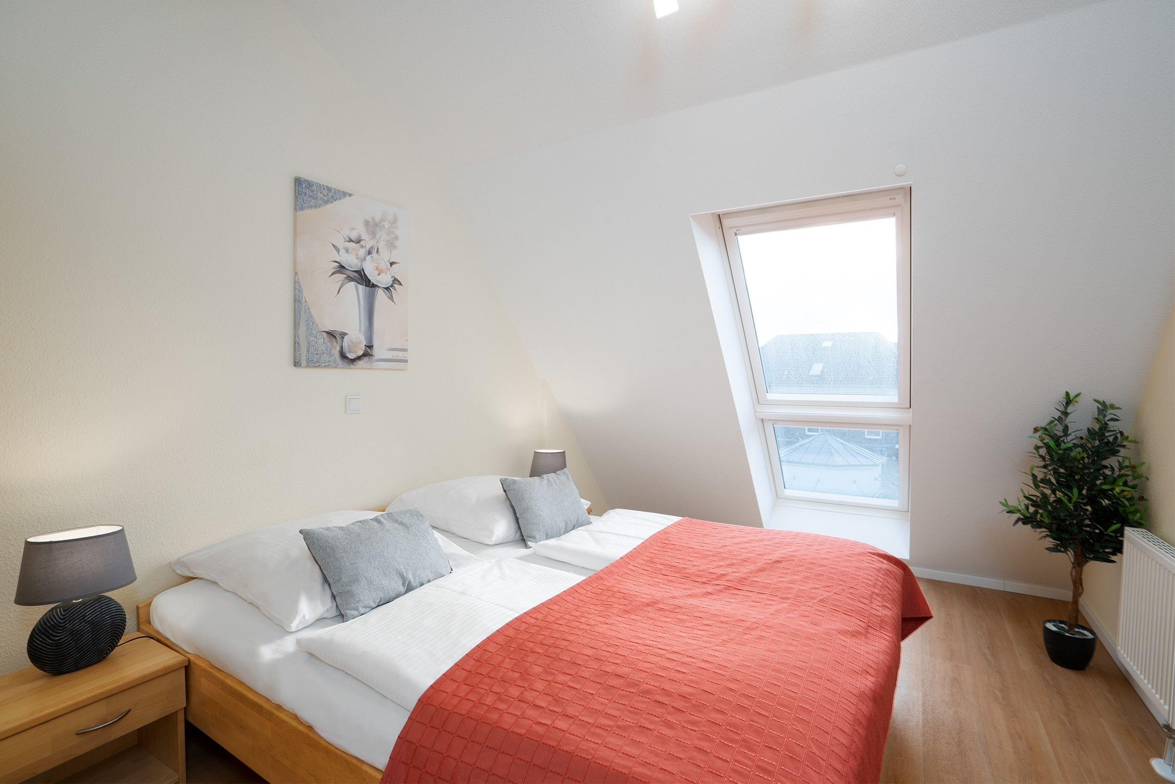 Schlafzimmer 1: 1 Doppelbett (2x 90x200 cm), blickdichte Plissees