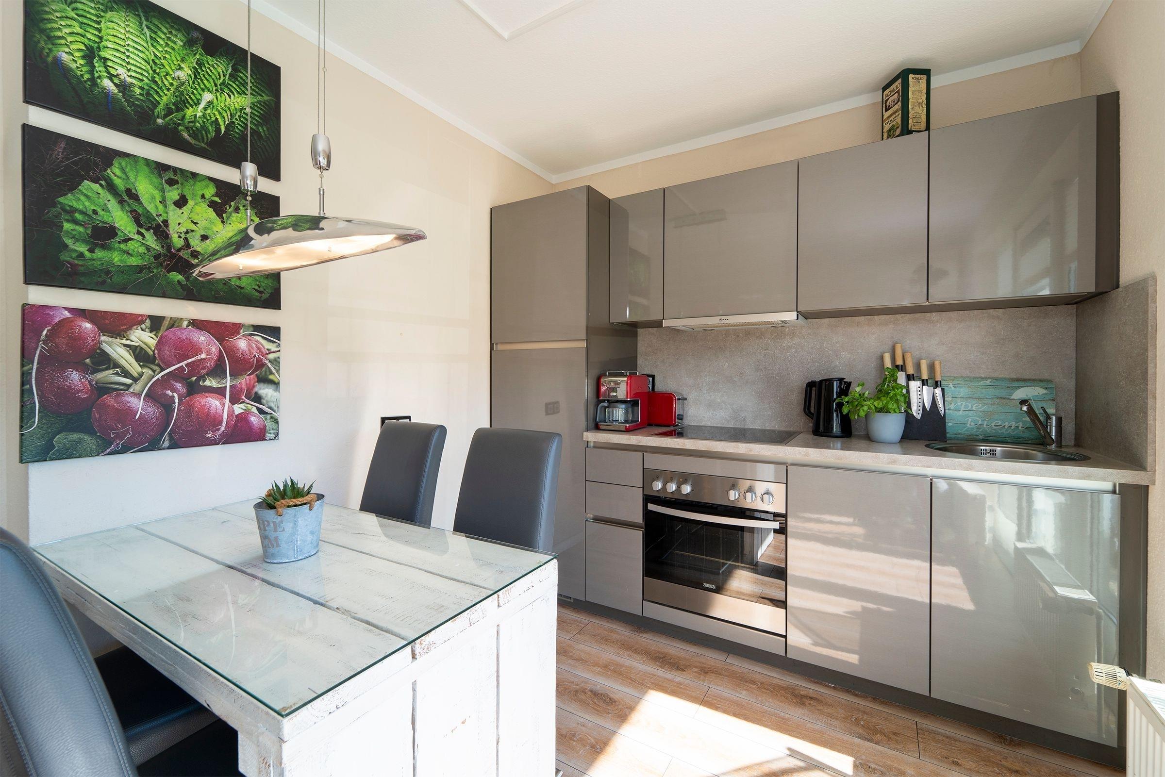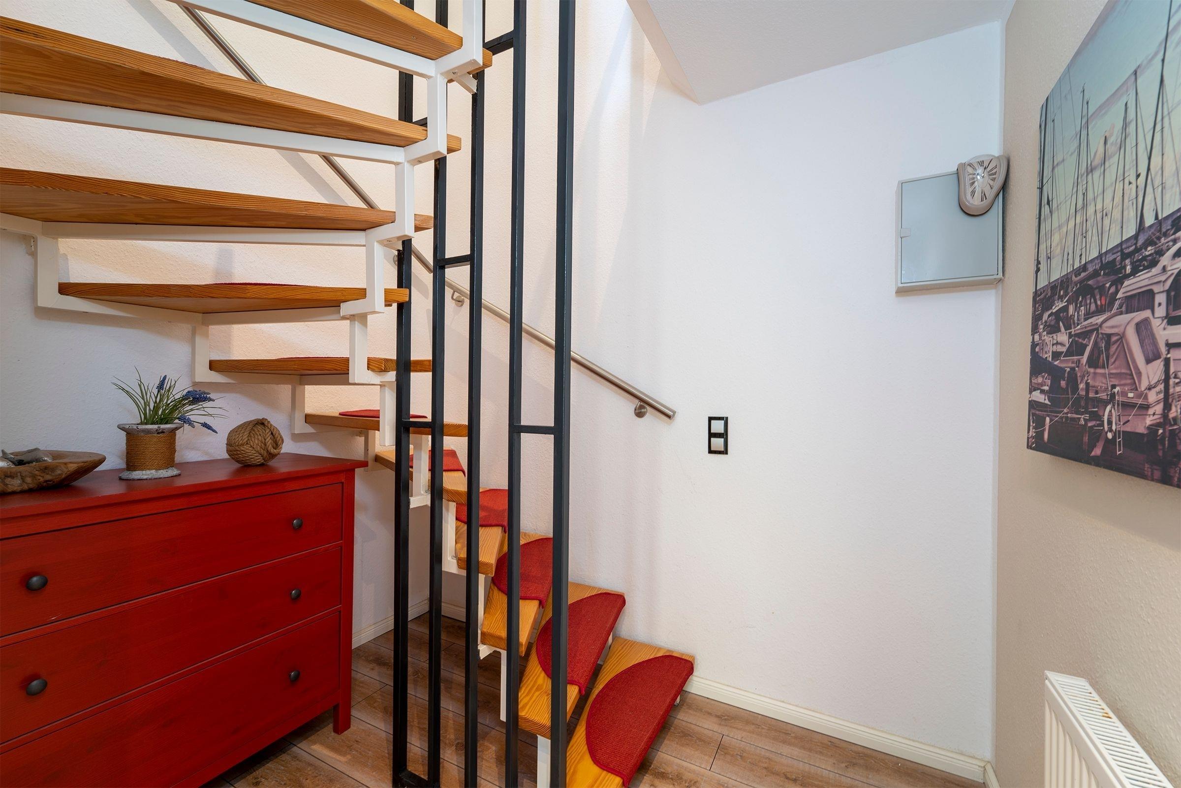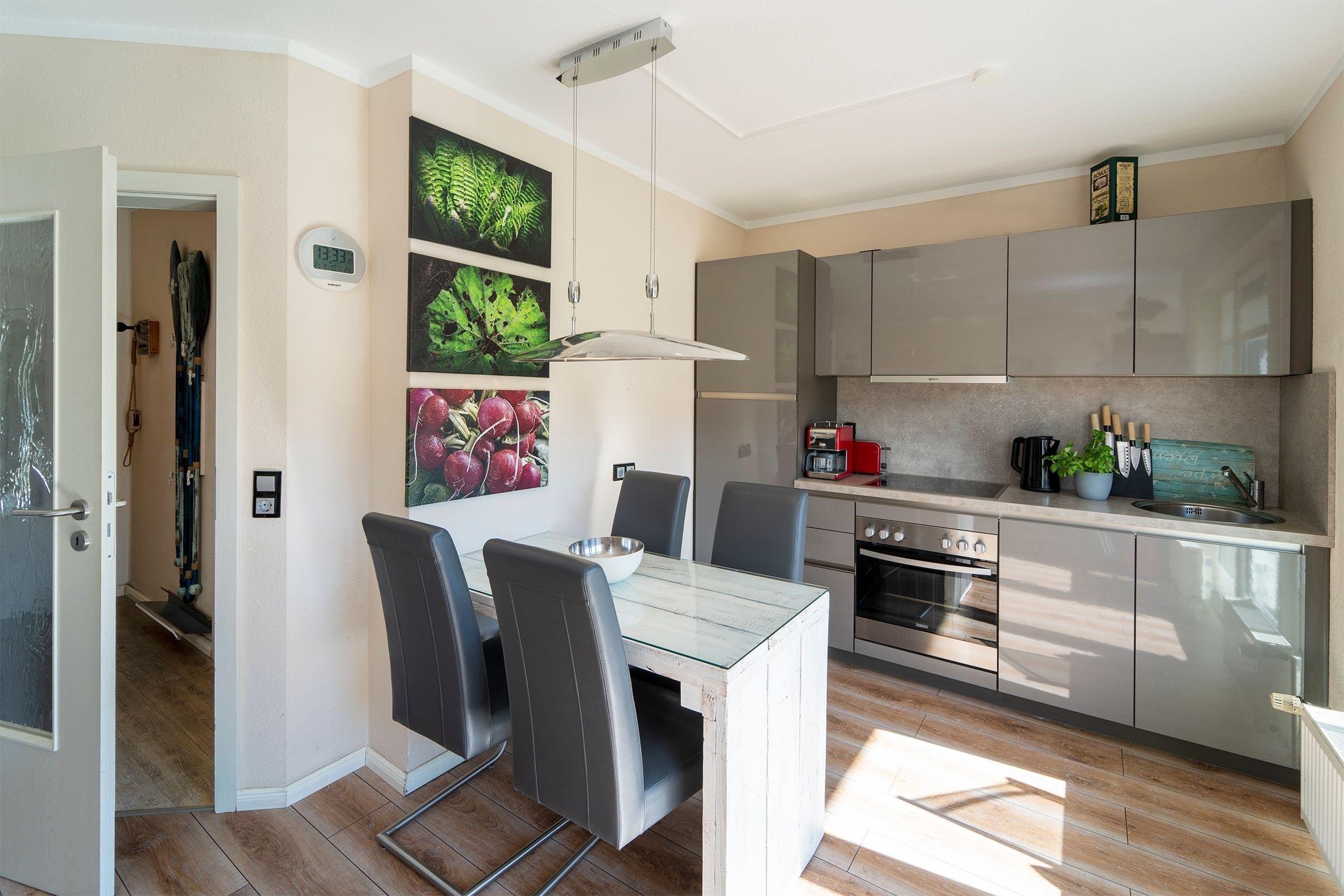 Der helle, modern gestaltete Wohnbereich mit maritimen Akzenten lädt nach einem langen Strandspaziergang zum Entspannen ein. Die mit hochwertigen Geräten (u.a. Smoothiemaker) gut ausgestattete Küche mit stylischem Essbereich lässt auch im Urlaub für den/die Hobbykoch/-köchin keine Wünsche offen. Vom offenen Wohn-Essbereich gelangen Sie direkt auf den nach Süden ausgerichteten Balkon, der mit seinen Loungesesseln zum Verweilen einlädt und in den Nachmittagsstunden Sonnenschutz bietet. Auf der selben Ebene finden Sie das maritim gestaltete Gäste-WC.
