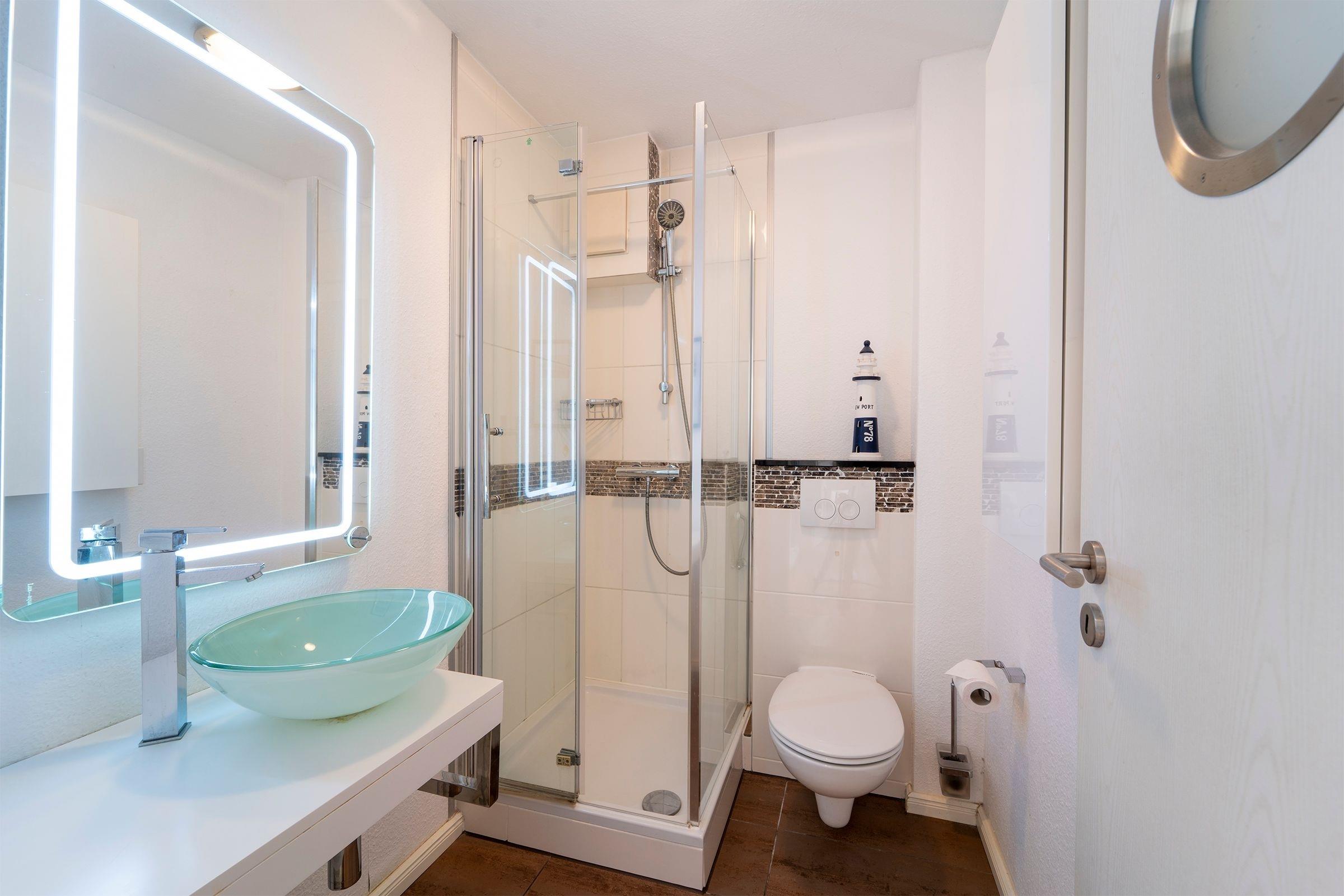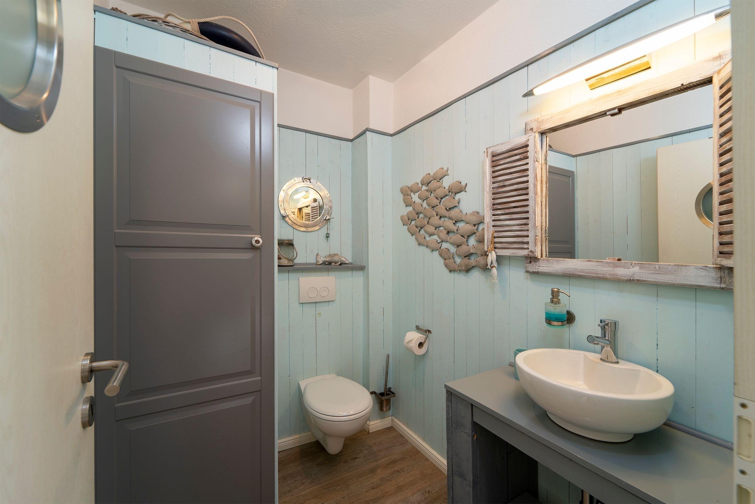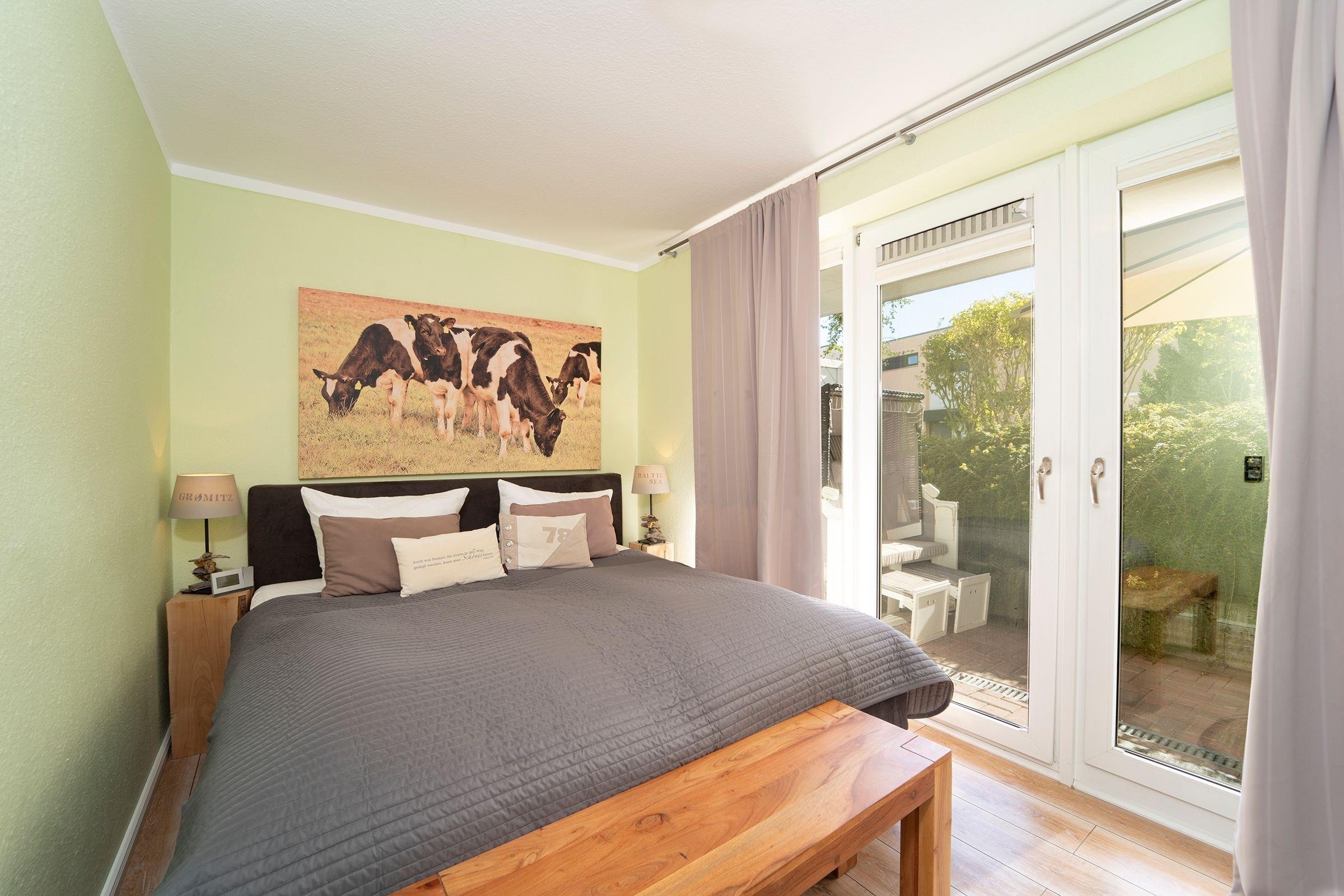 In das freundliche Souterrain gelangen Sie über eine Treppe in der Wohnung. Bitte beachten Sie, dass keine Kindersicherung vorhanden ist. Dort befinden sich zwei geschmackvoll gestaltete Schlafräume. Das erste Schlafzimmer ist u.a. mit einem großen, elektrisch verstellbaren Boxspringbett (180cm x 200cm) und einem Safe ausgestattet. Von hier aus gelangen Sie direkt auf die Terrasse, auf der Sie ab dem Frühjahr ein gemütlicher Strandkorb einlädt, den Abend bei einem Glas Wein ausklingen zu lassen. Das Souterrain präsentiert sich mit der nach Süden ausgerichteten großen Fensterfront hell und freundlich. Das zweite Schlafzimmer verfügt ebenfalls über ein Boxspringbett (140cm x 200cm). Auf dieser Ebene befindet sich das maritim eingerichtete Duschbad. Das gesamte Logis begeistert mit stilsicherer Einrichtung und wertigem Charakter.