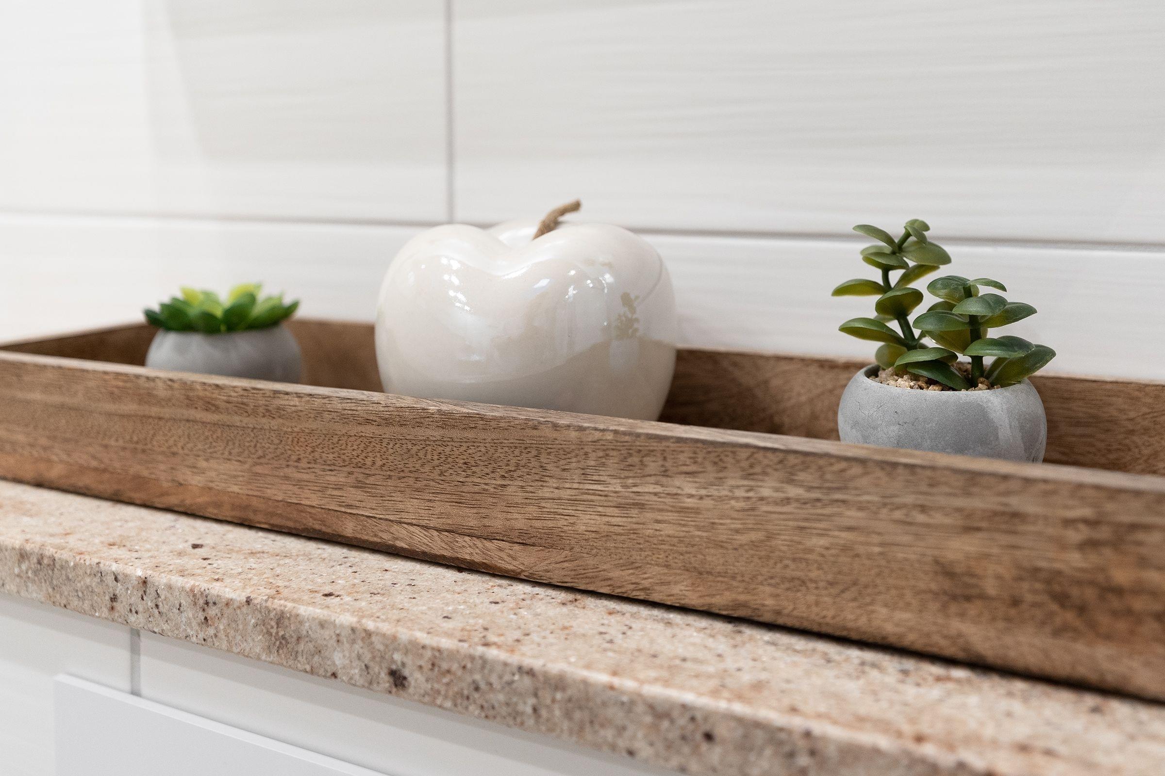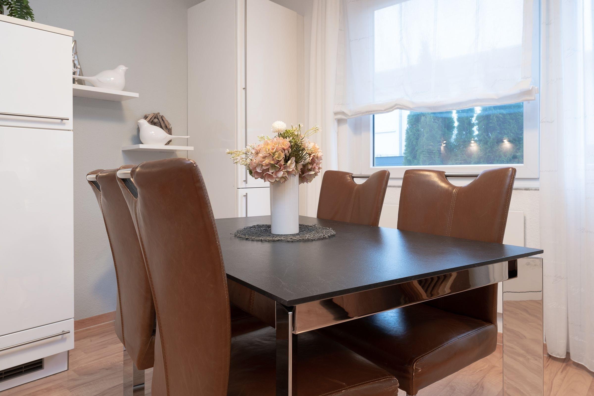Der großzügige und lichtdurchflutete Wohnbereich mit offener Küche bildet das Herz dieser traumhaften 2-Zimmer-Wohnung. Eine hochwertige Leder-Sofalandschaft lädt zu gemütlichen Fernseh-Abenden ein. Die moderne Küche mit ihrem angrenzenden Essbereich bietet alle Annehmlichkeiten, die ein Hobby-Koch-Herz höher schlagen lässt: