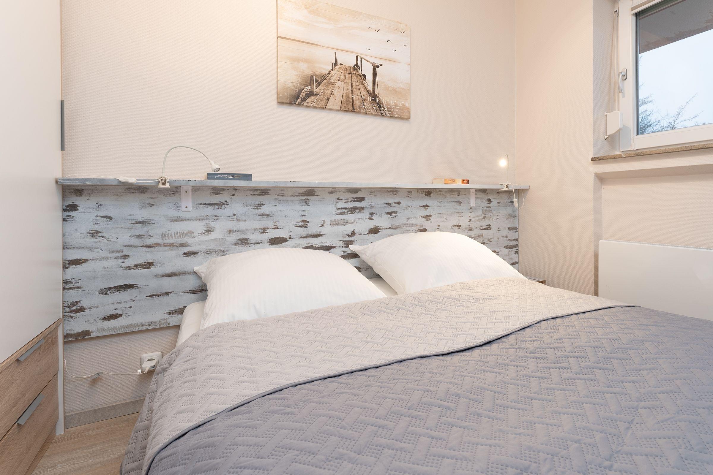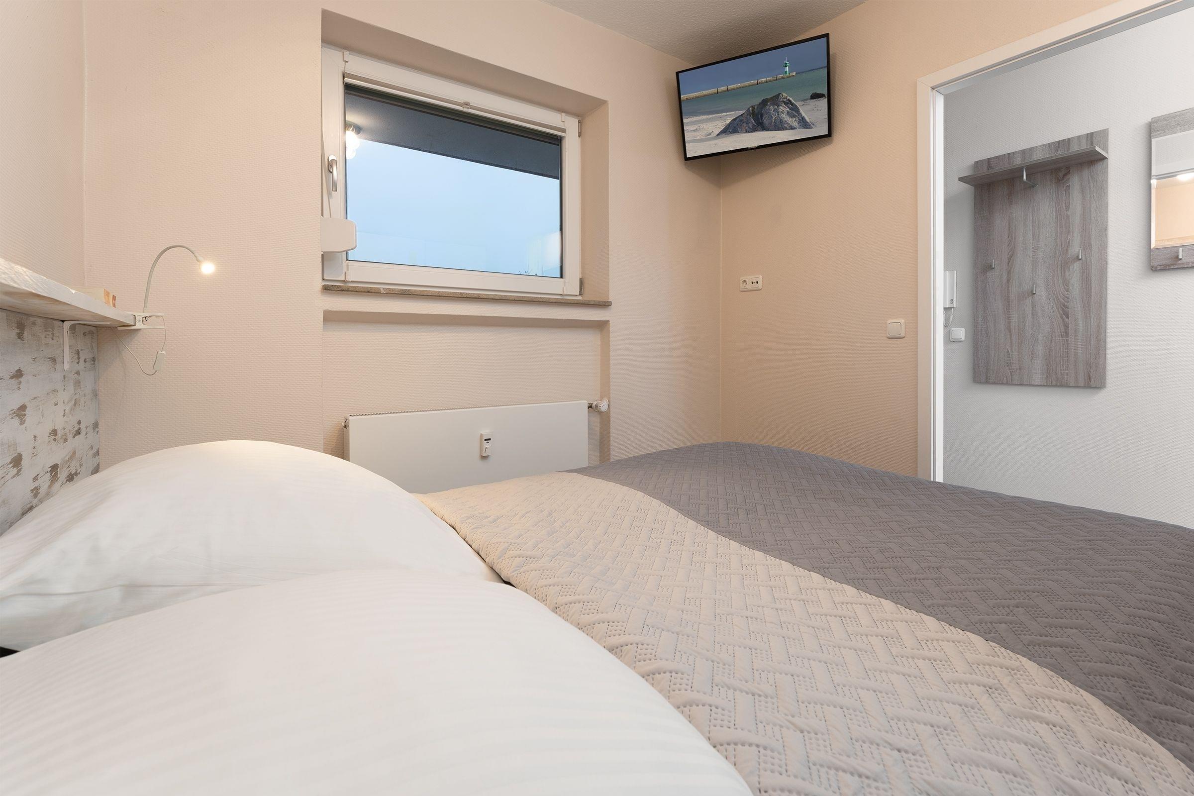 Schlafzimmer: 1 Doppelbett (2x 80x200 cm), TV, Verdunkelung (Außenjalousie), zusätzlich Plissee