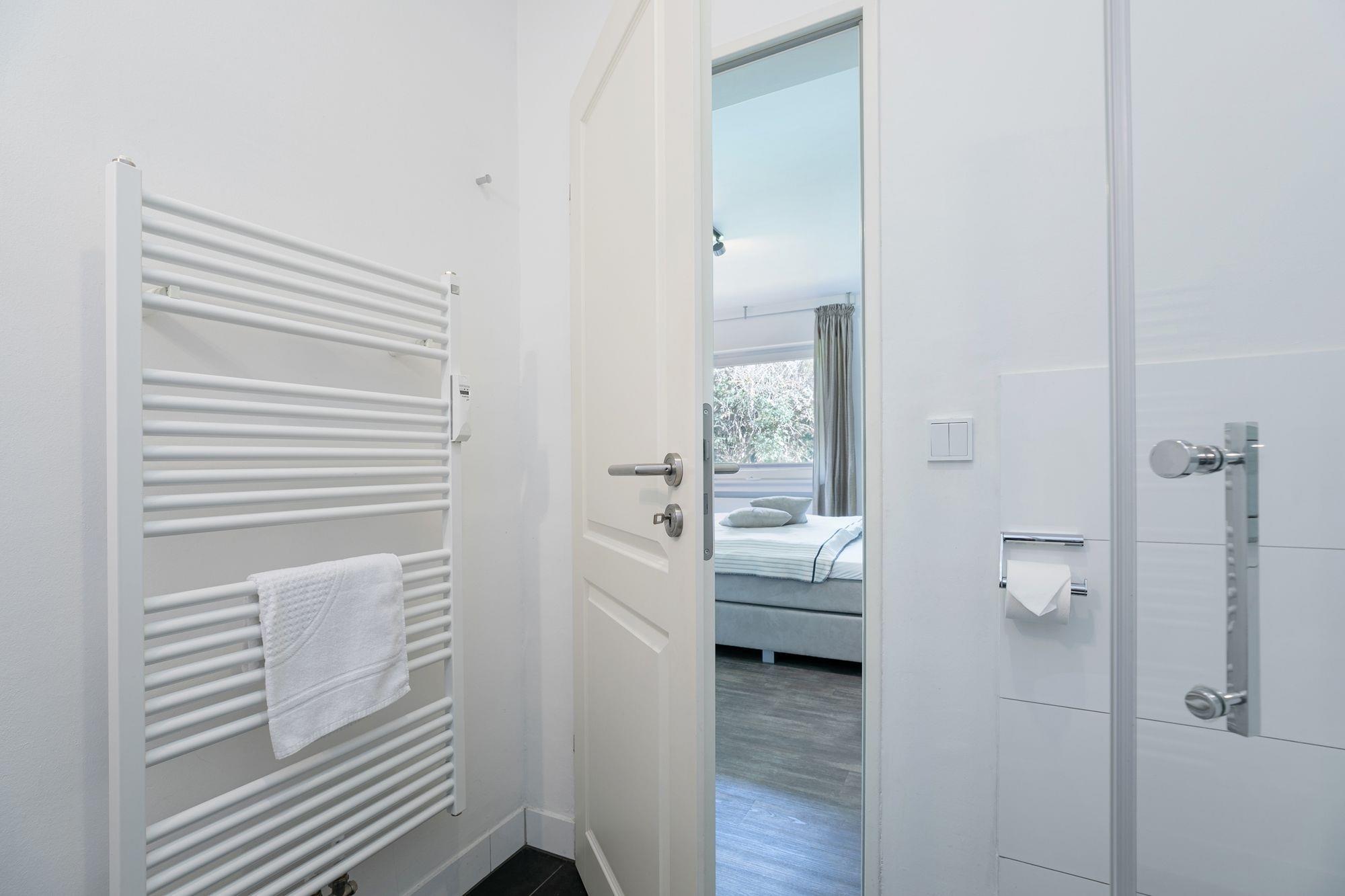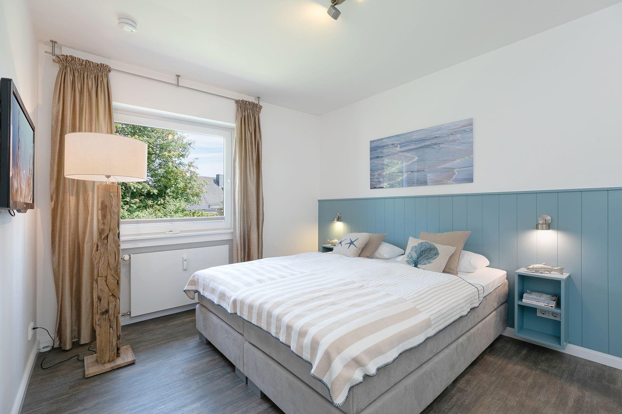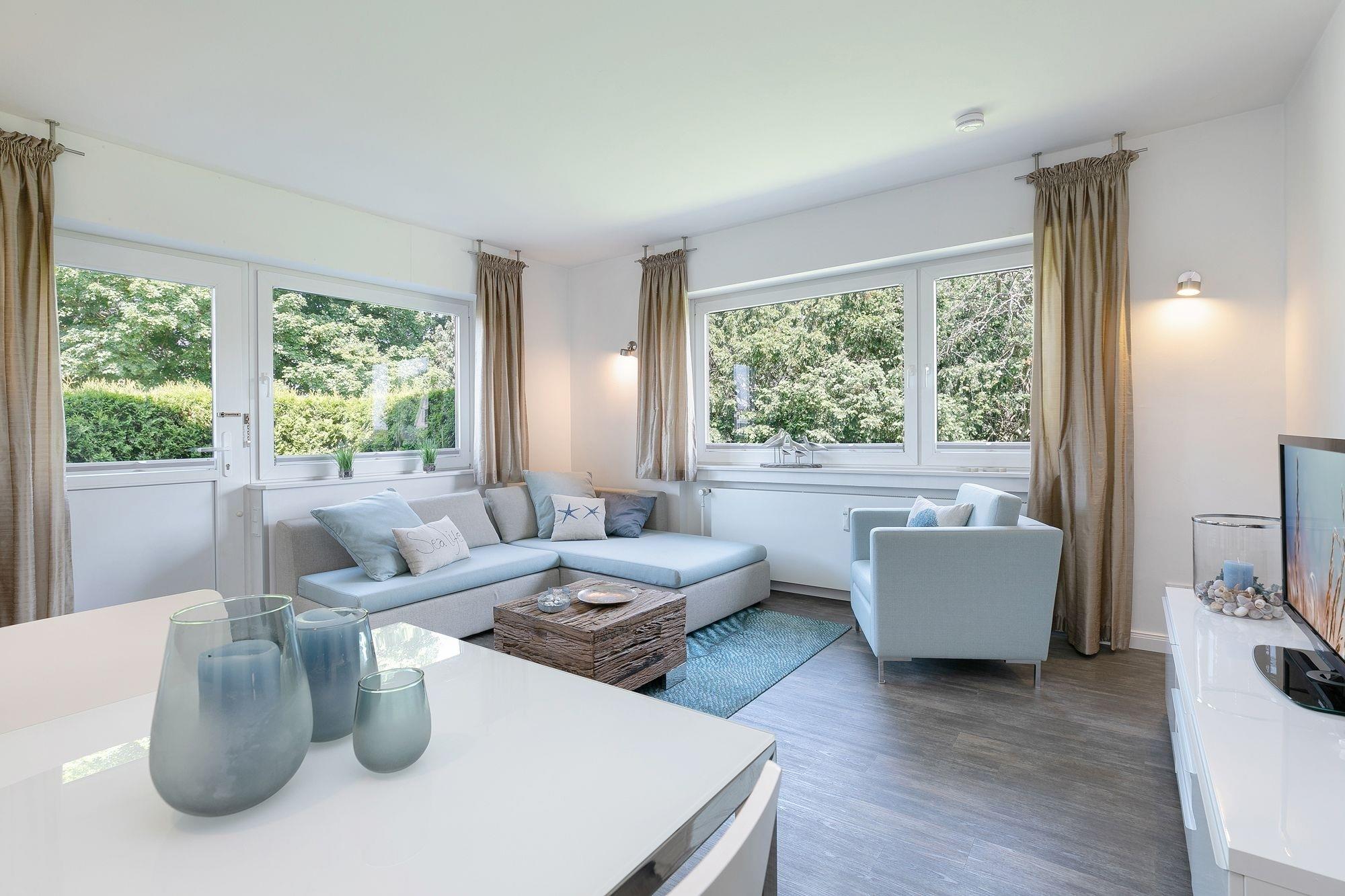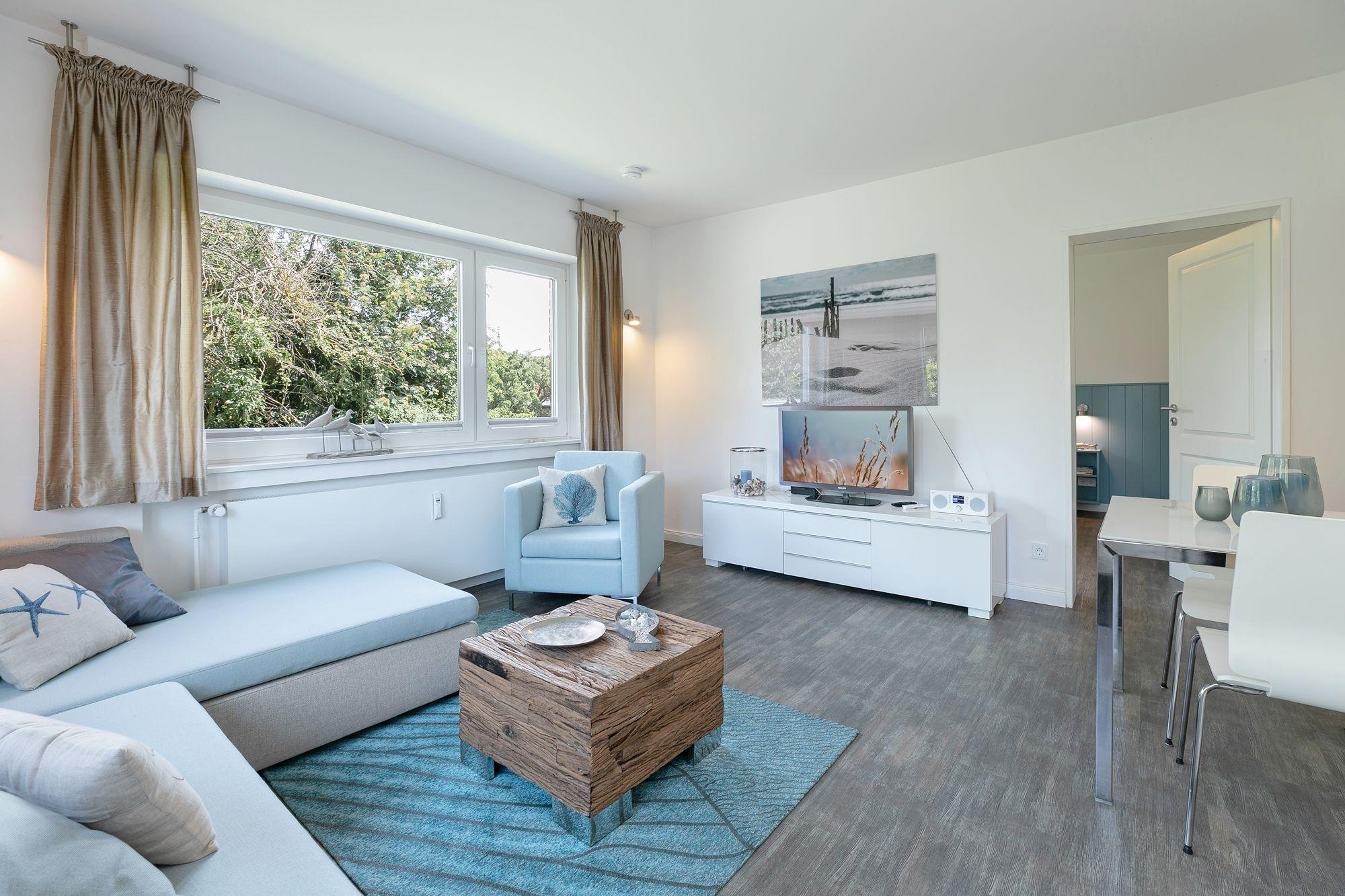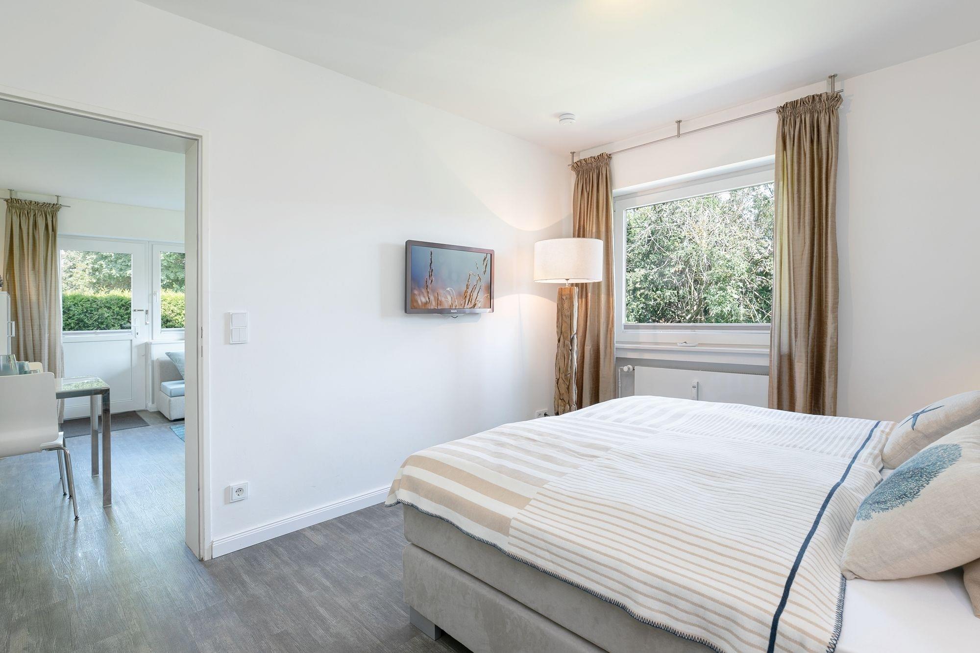 Der großzügige und lichtdurchflutete Wohnbereich mit gemütlichem Essplatz und offen angrenzender Küche ist das Herzstück dieses schönen Feriendomizils. Die moderne Küche ist offen gestaltet und perfekt in den Wohnbereich integriert, sie bietet alles, was Hobby-Koch-Herzen höher schlagen lässt. Starten Sie Ihren Tag mit einem heißen Kaffee auf der kleinen gemütlichen, möblierten Terrasse, die Sie vom Wohnbereich aus erreichen. Im separaten Schlafzimmer mit komfortablem Doppelbett (2x 90x200 cm) und einem zusätzlichem Flat-TV finden Sie ausreichend Platz für Ruhe und Erholung. Ihre Urlaubsgarderobe verstauen Sie problemlos in einem großen Wandschrank. Das Badezimmer überzeugt im modernen Stil mit einer ebenerdigen Dusche und ist vom Schlafzimmer aus zu erreichen. Das zweite Schlafzimmer verfügt über ein bequemes Einzelbett (80x200 cm). Eine Kommode bietet zusätzlichen Stauraum für Kleidung und Gepäck.