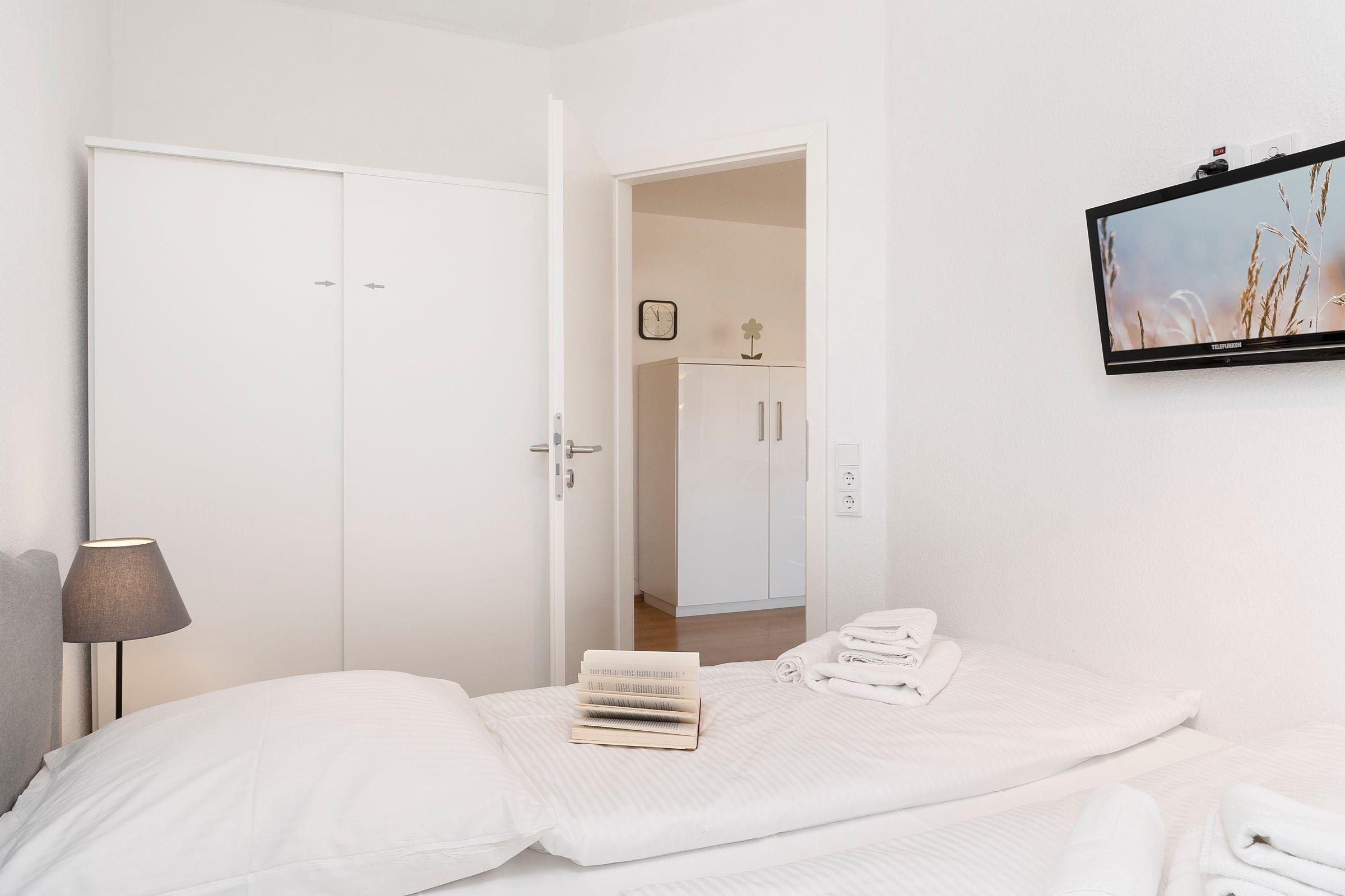 Neben einem großzügigen und lichtdurchfluteten Wohn-/Essbereich mit Schlafsofa (ca. 120x200 cm) verfügt Ihre Wohnung über ein separates Schlafzimmer mit einem komfortablen Doppelbett (2x 90x200 cm) und zusätzlichem Flachbild-TV. Ihre Urlaubsgarderobe verstauen Sie problemlos in einem geräumigen Kleiderschrank. Vom Wohnbereich aus haben Sie direkten Zugang auf den möblierten Balkon, auf dem Sie einen ereignisreichen Urlaubstag mit einem Glas Wein ausklingen lassen können. Das Duschbad wurde zum Jahresbeginn 2022 komplett saniert und ist mit allem ausgestattet, um erfrischt in den neuen Urlaubstag zu starten. Die moderne, offene Küchenzeile wurde ebenfalls 2022 erneuert und ist perfekt in den Wohnbereich integriert. Sie bietet alles, was Hobby-Koch-Herzen höher schlagen lässt. Unter anderem stehen Ihnen hier eine Kaffee-Pad-Maschine (Senseo) und eine Filterkaffeemaschine zur Verfügung. Bereiten Sie problemlos Ihre Mahlzeiten zu und genießen Sie gesellige Kochabende mit Freunden und Familie.