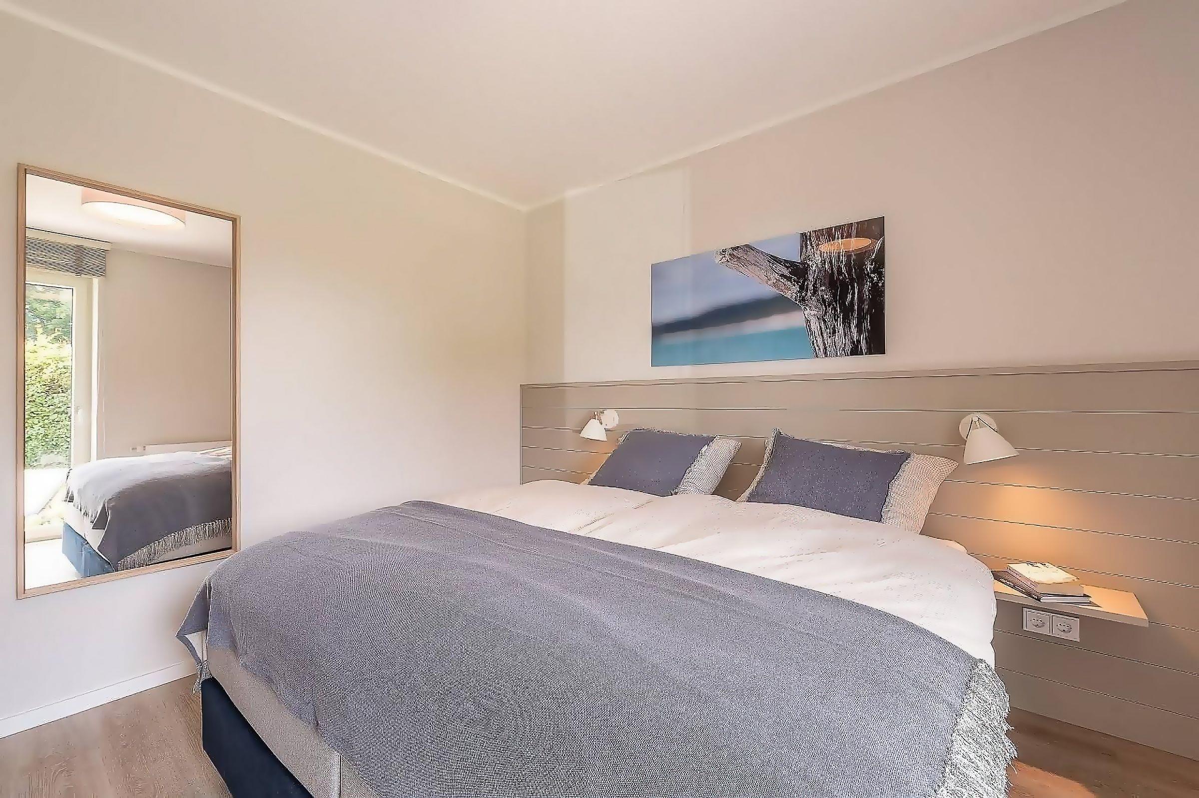 Schlafzimmer 1: 1 Boxspringbett (2 x 90x200 cm, durchgehender Topper), TV, Verdunkelung: Jalousien