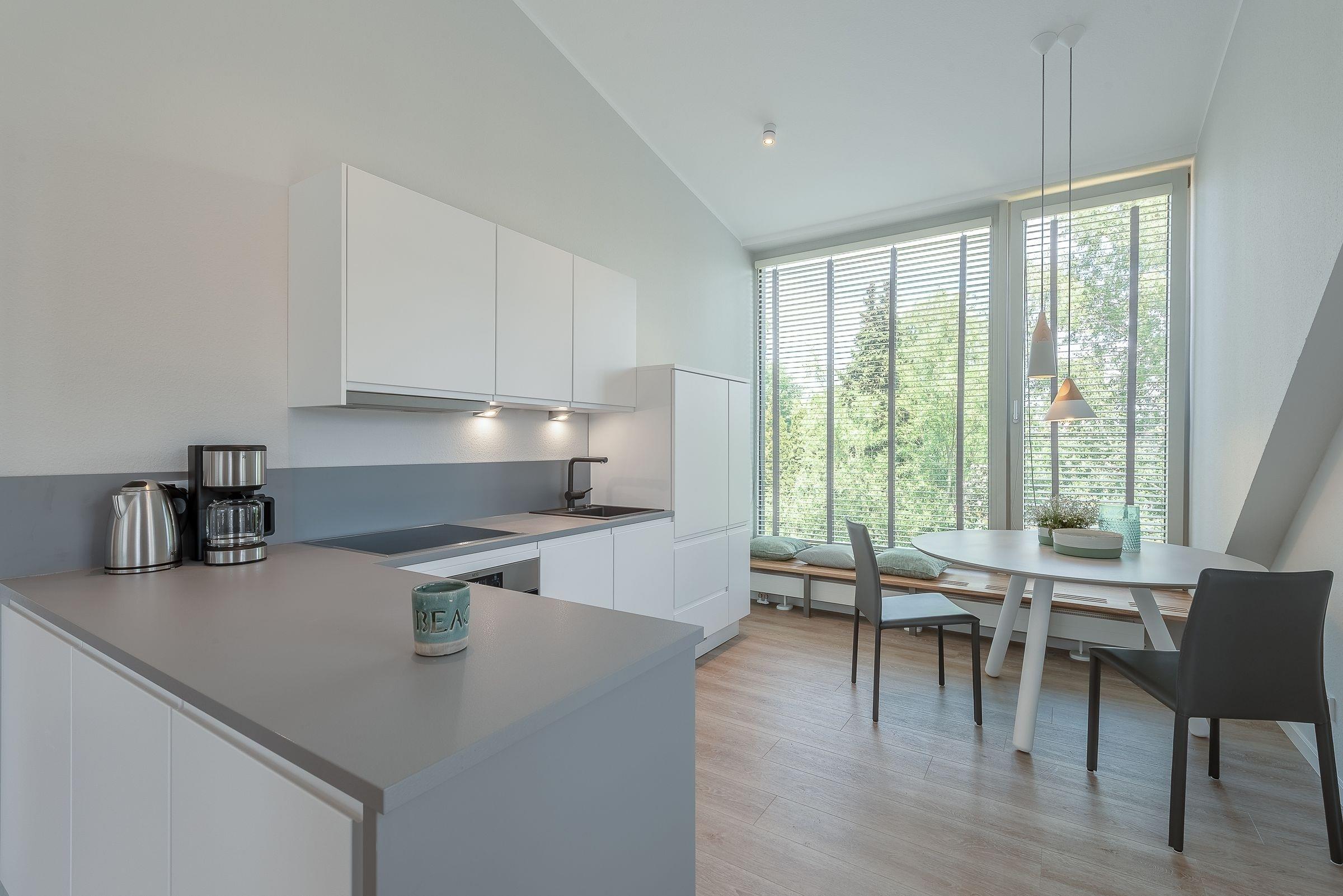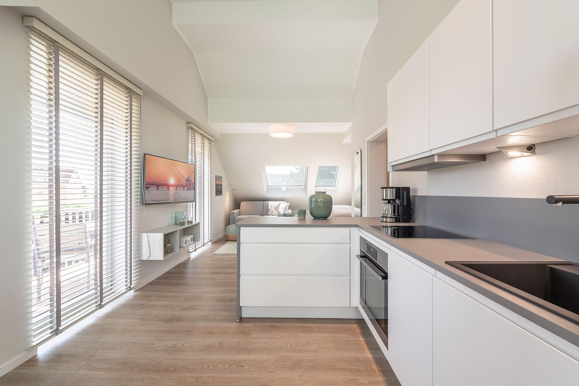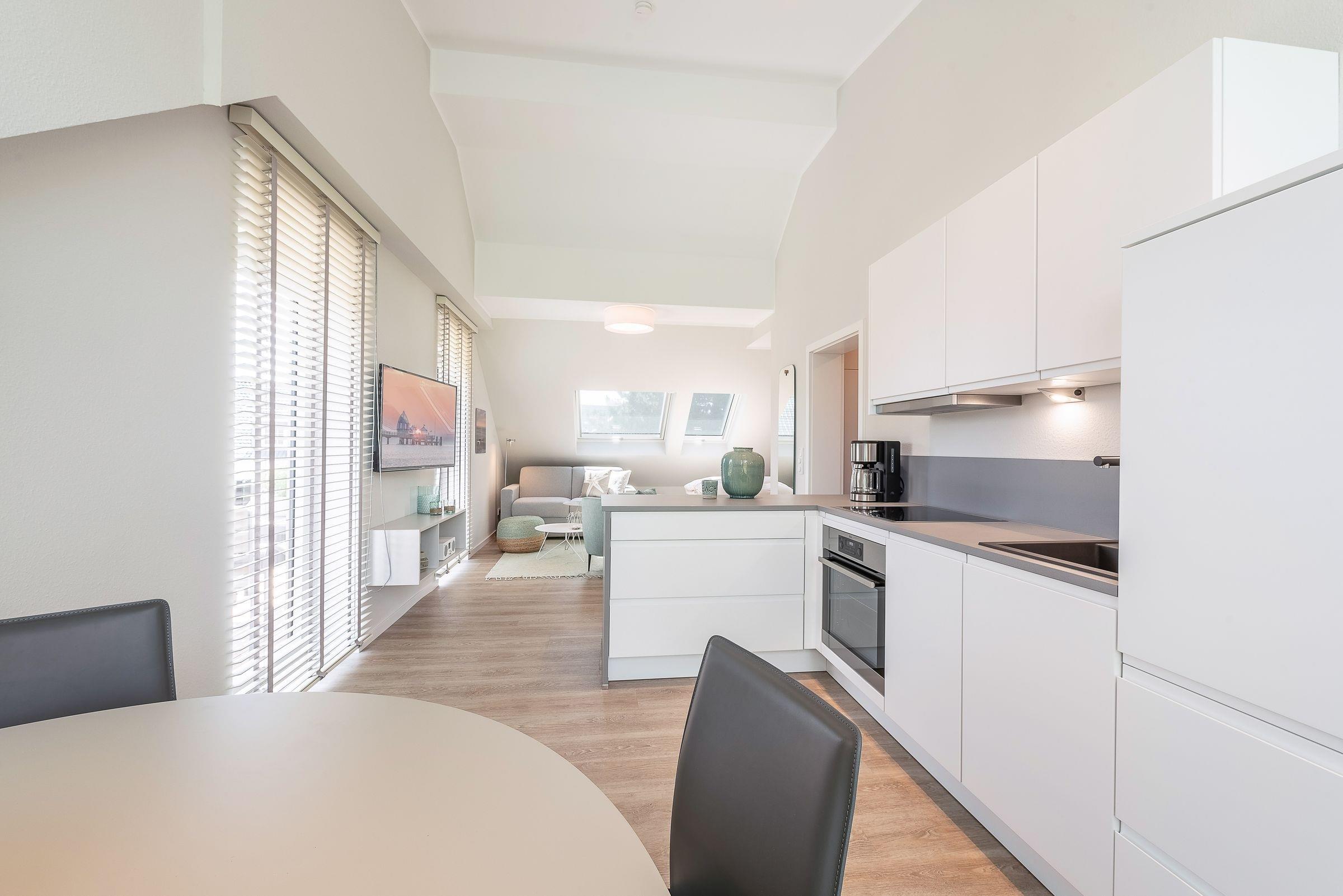 Die hochwertige Küche wurde perfekt in den großzügigen Wohnraum integriert. Hier zaubern Sie problemlos ein sterneverdächtiges Menü für Zwei!