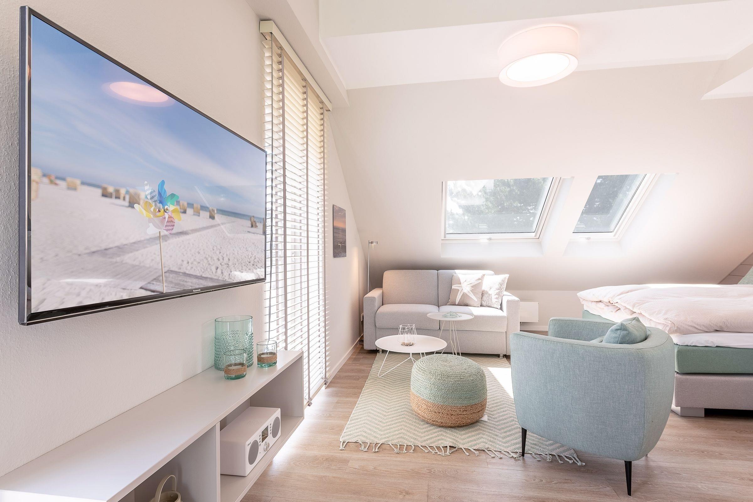 Eine große Fensterfront erfüllt den offen gestalteten Wohn-Schlafraum mit wohligem Tageslicht und sorgt für Wohlfühl-Ambiente vom ersten Moment an! Das hochwertige Boxspringbett bietet eine kuschelige Schlafmöglichkeit für zwei Personen (Liegefläche 160x200cm).