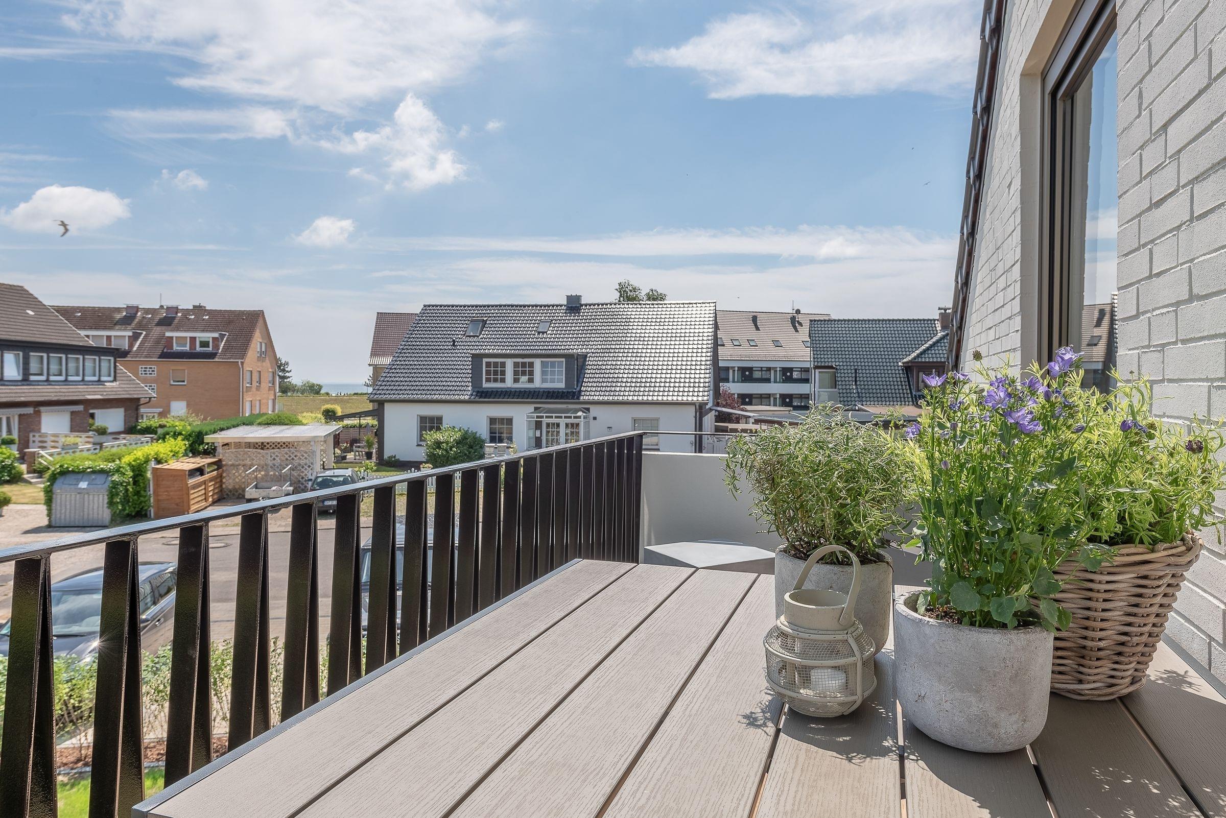 Moderne Ferienwohnung mit Balkon und Strandkorb nahe Grömitz bietet Komfort und Strandnähe für einen erholsamen Urlaub zu zweit.