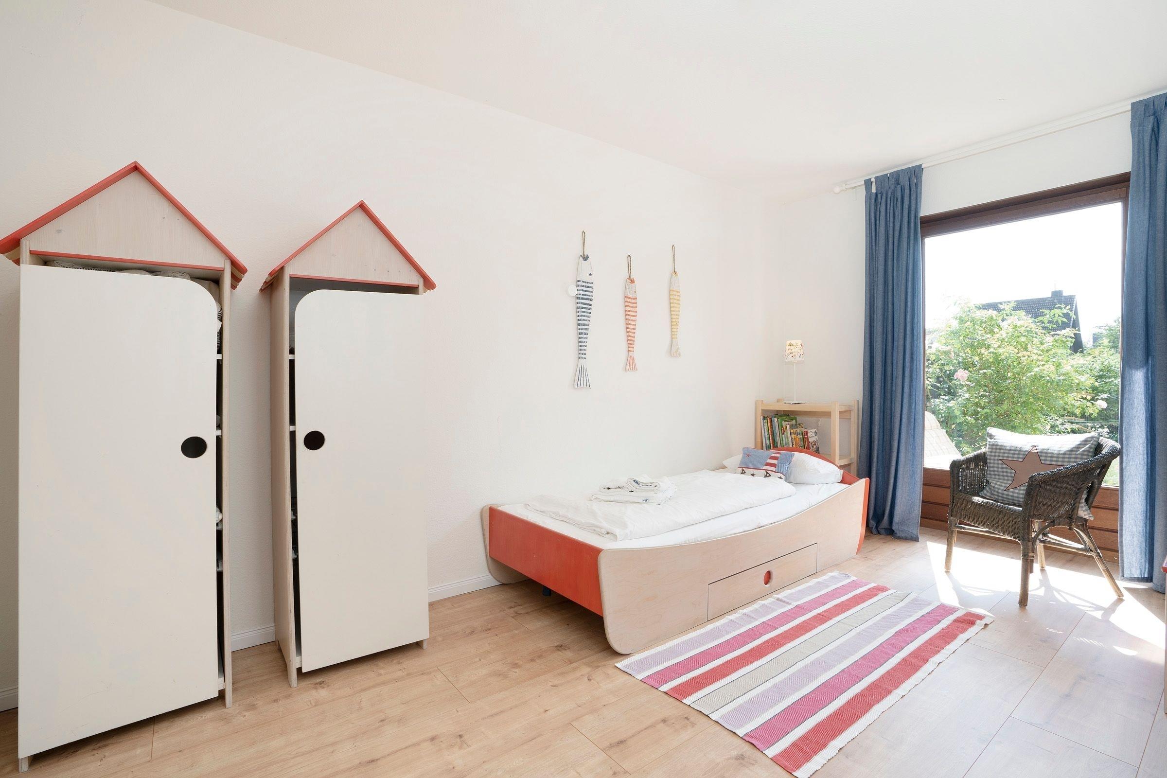 Vom Flur im Erdgeschoss aus gelangen Sie rechts in das erste der insgesamt drei Schlafzimmer. Ein hübsches Kinderzimmer mit einem Einzelbett (90x200 cm), 2 Kleiderschränken im maritimen Strandhütten-Stil und diverse Kinderbücher & Spiele begrüßen die kleinen Gäste. Eine Tür weiter befindet sich das zweite Schlafzimmer mit einem weiteren Einzelbett (90x200 cm) und einer Kommode. Von diesen beiden Zimmern führt jeweils ein direkter Zugang auf die möblierte Süd-Terrasse. Ein paar Schritte weiter den Flur entlang erreichen Sie das dritte Schlafzimmer: das bequeme Doppelbett (2x 90x200 cm) sorgt für gemütliche Nächte, im Kleiderschrank können Sie Ihre Urlaubsgarderobe perfekt verstauen. Alle Schlafräume lassen sich mit Außenjalousien angenehm verdunkeln. Starten Sie ausgeruht in den neuen Tag mit einer erfrischenden Dusche im hellen Tageslicht-Bad. Um Hektik am Morgen zu vermeiden, gibt es im Keller ein weiteres modernes Duschbad mit Fenster. Eine individuell steuerbare Fußbodenheizung sorgt für angenehme Temperaturen im ganzen Haus.
