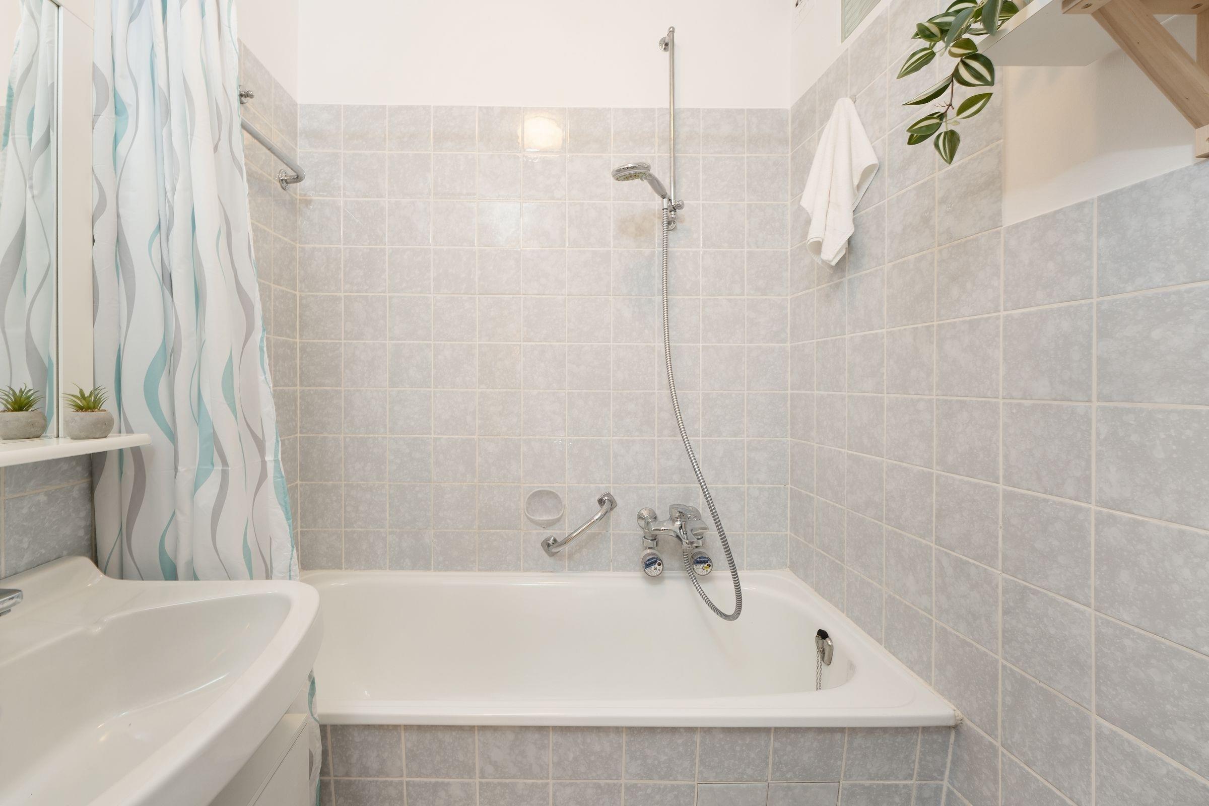 Vom Flur aus finden Sie rechter Hand die kleine Küche mit einer guten Grundausstattung, in der Sie Ihre Mahlzeiten zubereiten können. Weiter den Flur entlang befindet sich links eine offen gestaltete Schlafnische mit einem Einzelbett (90x200 cm), die als Schlafplatz für 1 Kind konzipiert ist. Gegenüber befindet sich das Badezimmer. Am Kopfende des Flurs begrüßt Sie lichtdurchflutet das Wohn-Schlafzimmer: Ein ausziehbares Kojenbett (2x 80x200 cm) sorgt nachts für erholsamen Schlaf, tagsüber dient es als bequemes Sofa. Zusätzlich bieten zwei Sessel sowie ein netter Essplatz Komfort. Treten Sie von hier aus auf den möblierten Balkon. Morgens beim ersten Kaffee oder abends bei einem guten Glas Wein können Sie hier das Meer rauschen hören.