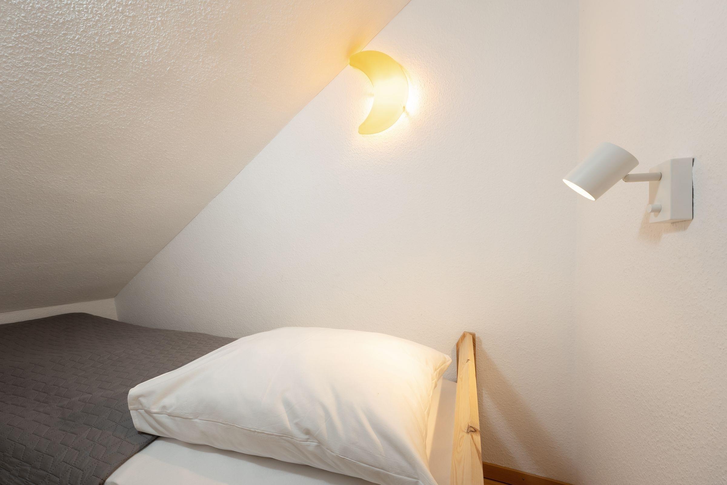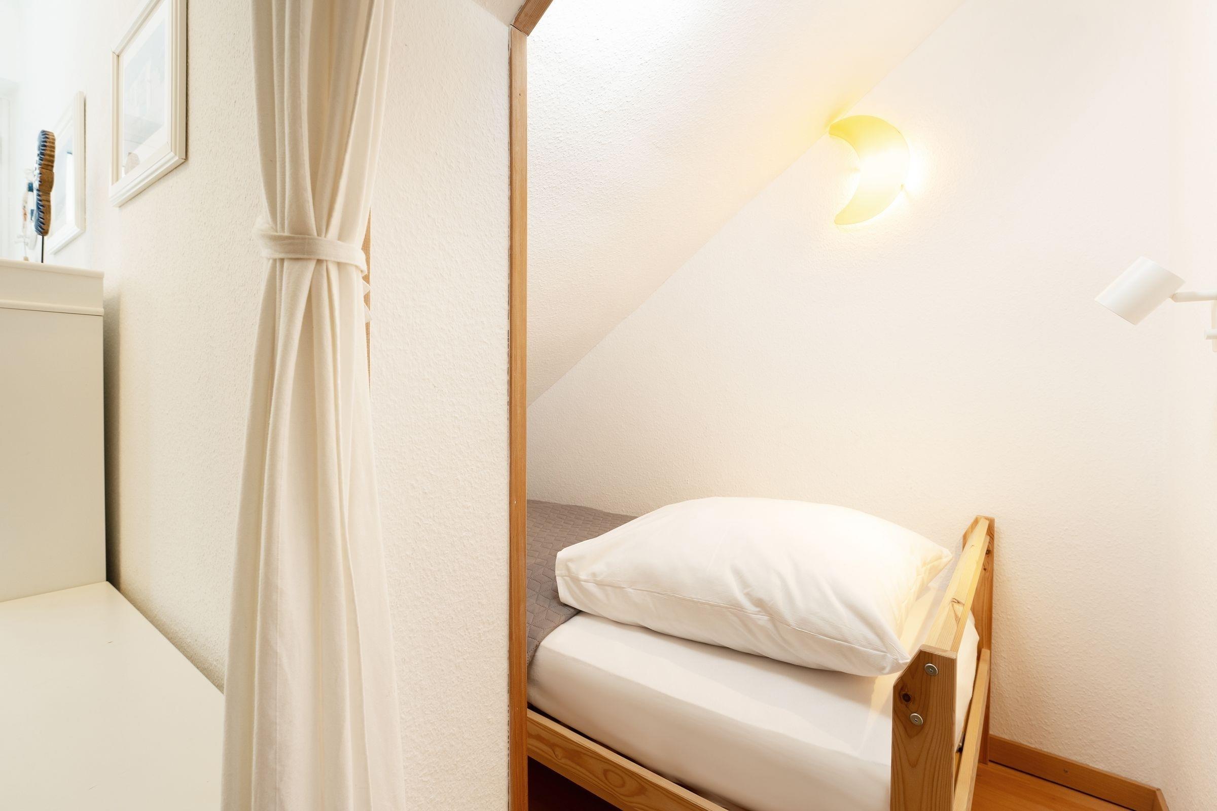 Schlafnische im Flur (mit Vorhang abtrennbar): 1 Einzelbett (90x200 cm), keine Verdunkelung