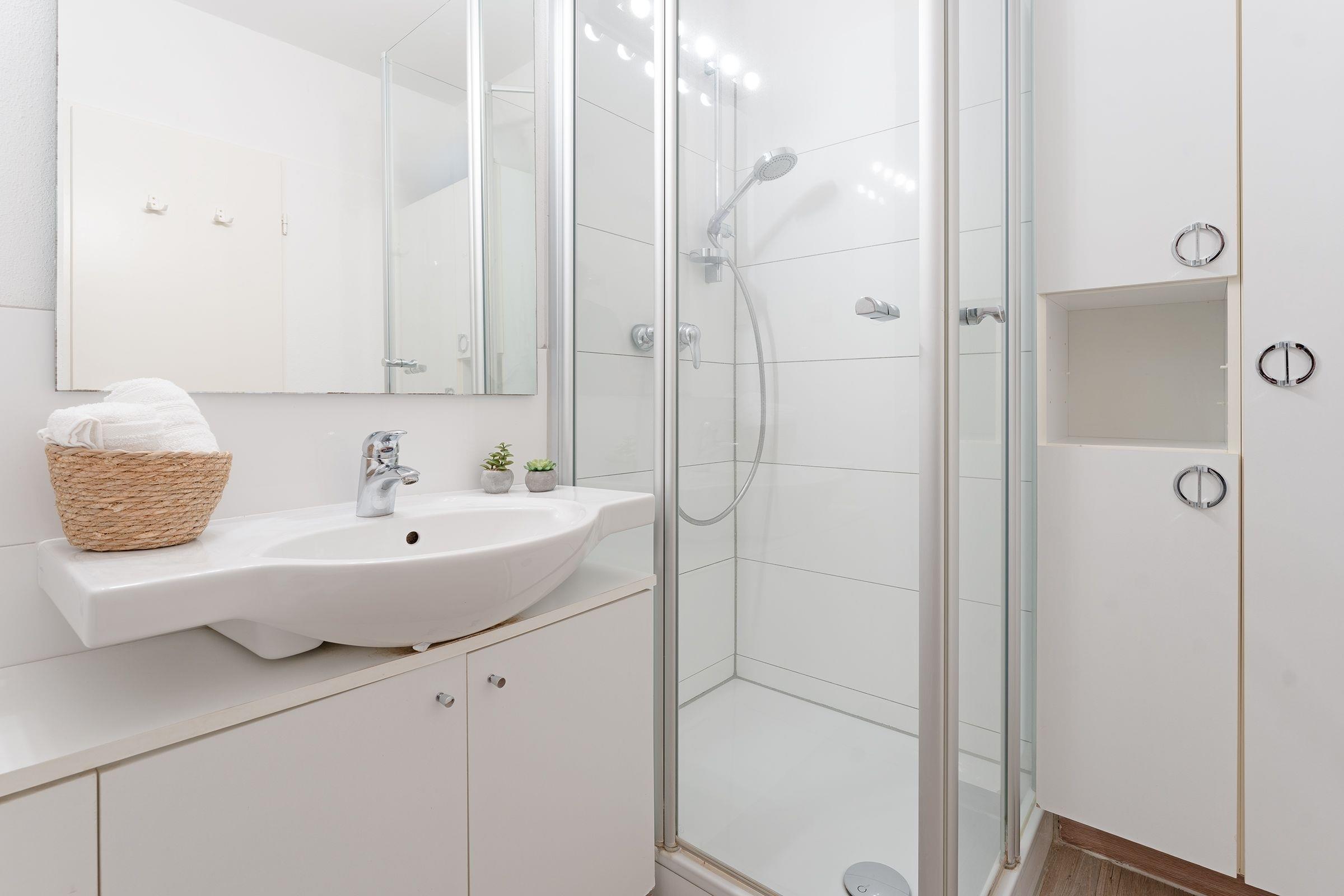 Der offene Wohn-/Schlafbereich empfängt Sie lichtdurchflutet und mit geschmackvollem Interieur. Ein hochwertiges Schrankbett bietet hier eine bequeme Schlafmöglichkeit für bis zu 2 Personen (2x 70x200 cm). Ein komfortabler Lounge Bereich mit Sofas, Sesseln, Flachbild-TV und Bose System mit USB-Anschluss sorgt nach langen Strandtagen für geruhsame Stunden. Der angrenzende Essbereich ist für bis zu 4 Personen ausgerichtet und bietet Platz für gesellige Mahlzeiten, auch die moderne und hochwertige Küchenzeile ist clever in den Wohnraum integriert. Ein direkter Zugang führt vom Wohnzimmer auf den möblierten Balkon mit spektakulärem Meerblick! Atemberaubend! Eins der zwei Schlafzimmer verfügt über ein Doppelbett (2x 100x190 cm), sowie einen geräumigen Kleiderschrank mit reichlich Stauraum für Ihre Urlaubsgarderobe. Das zweite Schlafzimmer bietet mit einem Einzelbett (80x200 cm) und Regalschränkchen einen lauschigen Rückzugsort für eine weitere Person. Das hell geflieste Bad ist mit Dusche, WC, Waschtisch und beleuchtetem Spiegel ausgestattet.