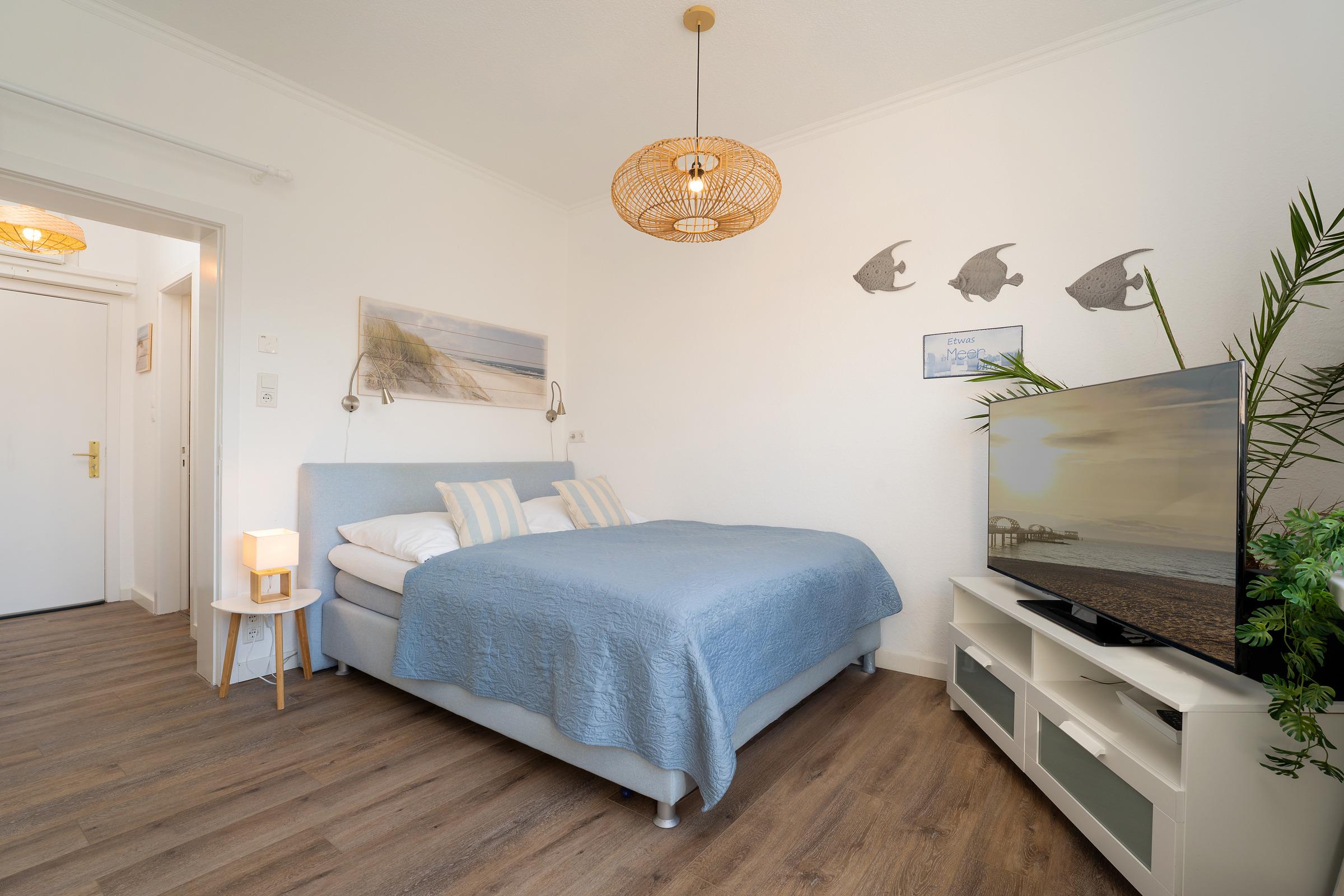 Wohnzimmer: Boxspringbett (180x200 cm), TV, Verdunkelungsjalousien