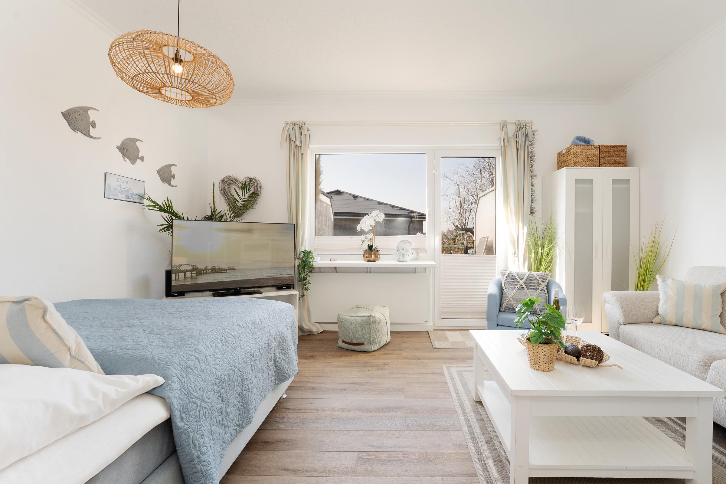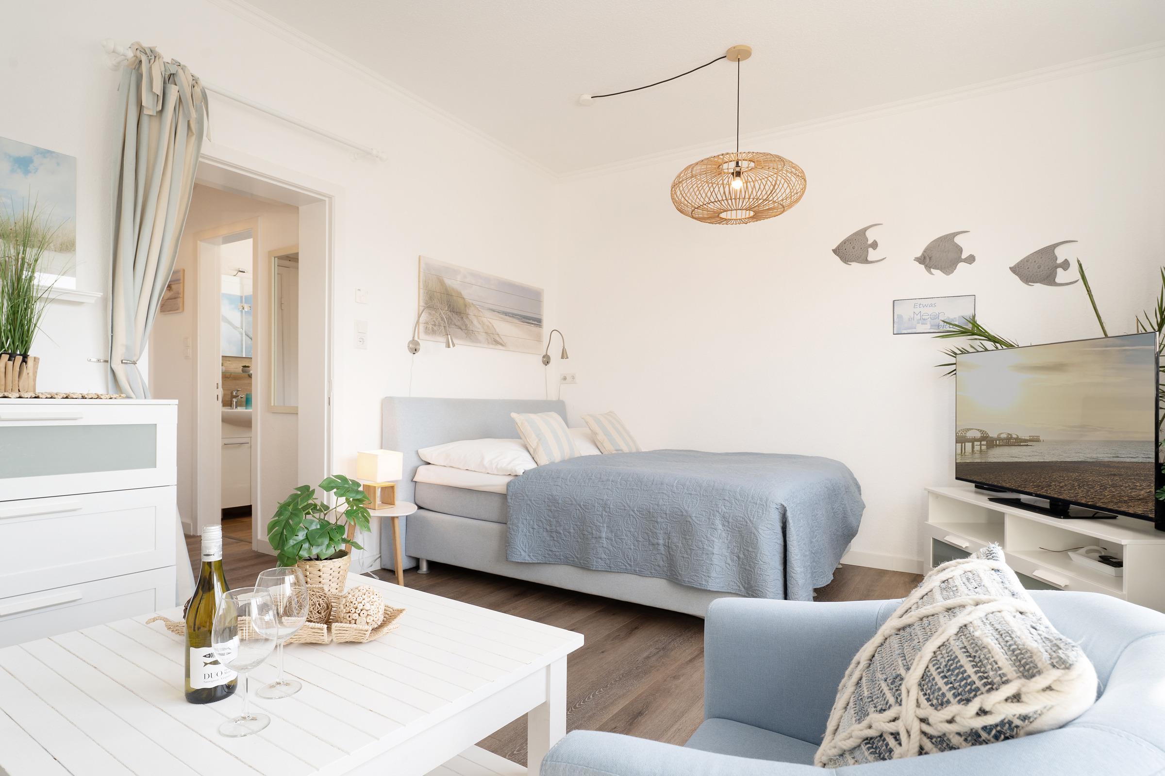 Von Ihrem Wohn-Schlafbereich mit Doppelbett (180x200 cm), Sofa, Sessel und Fernsehecke abgehend, befindet sich die angrenzende Küche (separat, jedoch mit offenem Zugang) die mit guter Ausstattung vom Ceranherd bis zur Spülmaschine begeistert. Vom Wohnbereich aus geht es direkt auf den möblierten Balkon, eine Markise schützt vor zu starker Sonneneinstrahlung. Starten Sie in den Tag in Ihrem freundlichen Duschbad. Ihr Feriendomizil ist durchgehend geschmackvoll ausgestattet und hat ein angenehmes Wohnambiente.