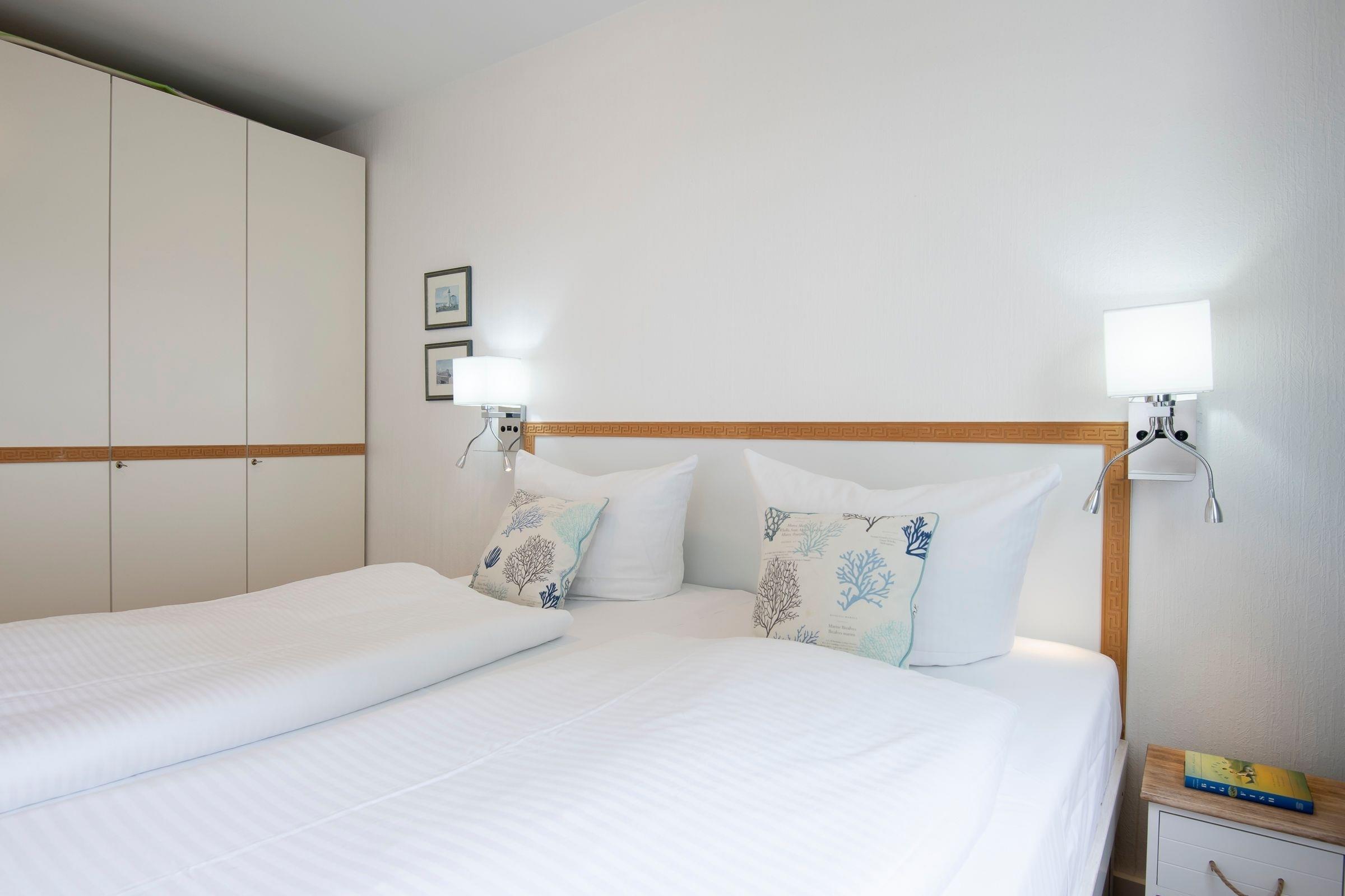 Schlafzimmer 1: 1 Doppelbett (2x 90x190 cm), Kleiderschrank, Außenjalousien