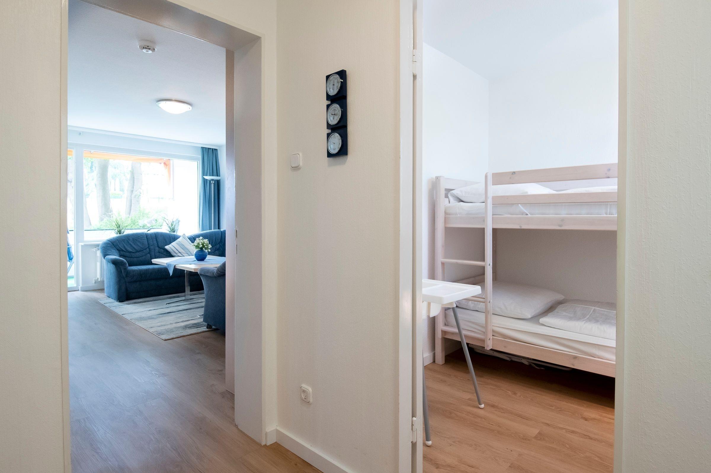 Lichtdurchflutet und hell begrüßt Sie der Wohnraum mit integriertem Essbereich. Eine komfortable Sofaecke und ein Flachbild-TV sorgen nach langen Strandspaziergängen für Entspannung. Über einen kostenlosen WLAN-Anschluss bleiben Sie auch im Urlaub für Ihre Lieben erreichbar. Vom Wohnzimmer führt ein direkter Zugang auf den möblierten Balkon mit seitlichem Blick Richtung Ostsee, eine Markise schützt hier an Sommertagen vor zu starker Sonne. In der kleinen separaten Küche (offene Tür) sind von der Mikrowelle, über den Backofen und den 4-Plattenceranherd diverse Alltagshelfer vorhanden und die Spülmaschine erledigt den Abwasch. Das größere der beiden Schlafzimmer ist mit einem Doppelbett (2x90x190cm), das zweite Schlafzimmer ist mit einem Etagenbett (je 90x200cm) ausgestattet. In beiden Schlafräumen sorgen Außenjalousien für angenehme Verdunklung und erholsamen Schlaf. Das geschmackvolle Designbad sorgt mit Wohlfühlausstattung wie Dusche, WC und Waschtisch mit Schminkspiegel gleich morgens für gute Laune.