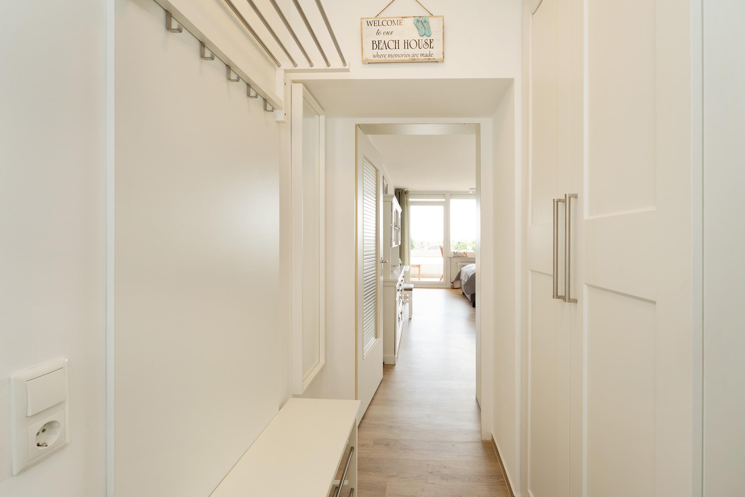Erholsam schlafen werden Sie im hochwertigen, komfortablen Polsterbett (2x 80x200 cm), die Fenster lassen sich durch Rollos angenehm abdunkeln. Für Unterhaltung sorgen ein kostenfreier WLAN-Anschluss, ein schwenkbarer 50 Zoll TV und ein Internetradio mit Bluetooth-Kopplungsmöglichkeit. In der gut ausgestatteten Küchenzeile sorgen Alltagshelfer wie Backofen, Cerankochfeld, Kaffeemaschine und Spülmaschine für sorgenfreies Kochvergnügen. Der Ausblick vom möblierten Balkon führt über die Dächer von Grömitz bis hin zur entfernten, blau funkelnden Ostsee. Ein Sonnenschirm bietet an sonnigen Tagen Schutz vor zu starker Sonneneinstrahlung. Ein Duschbad mit WC und komfortabler Regendusche ist ebenfalls vorhanden.