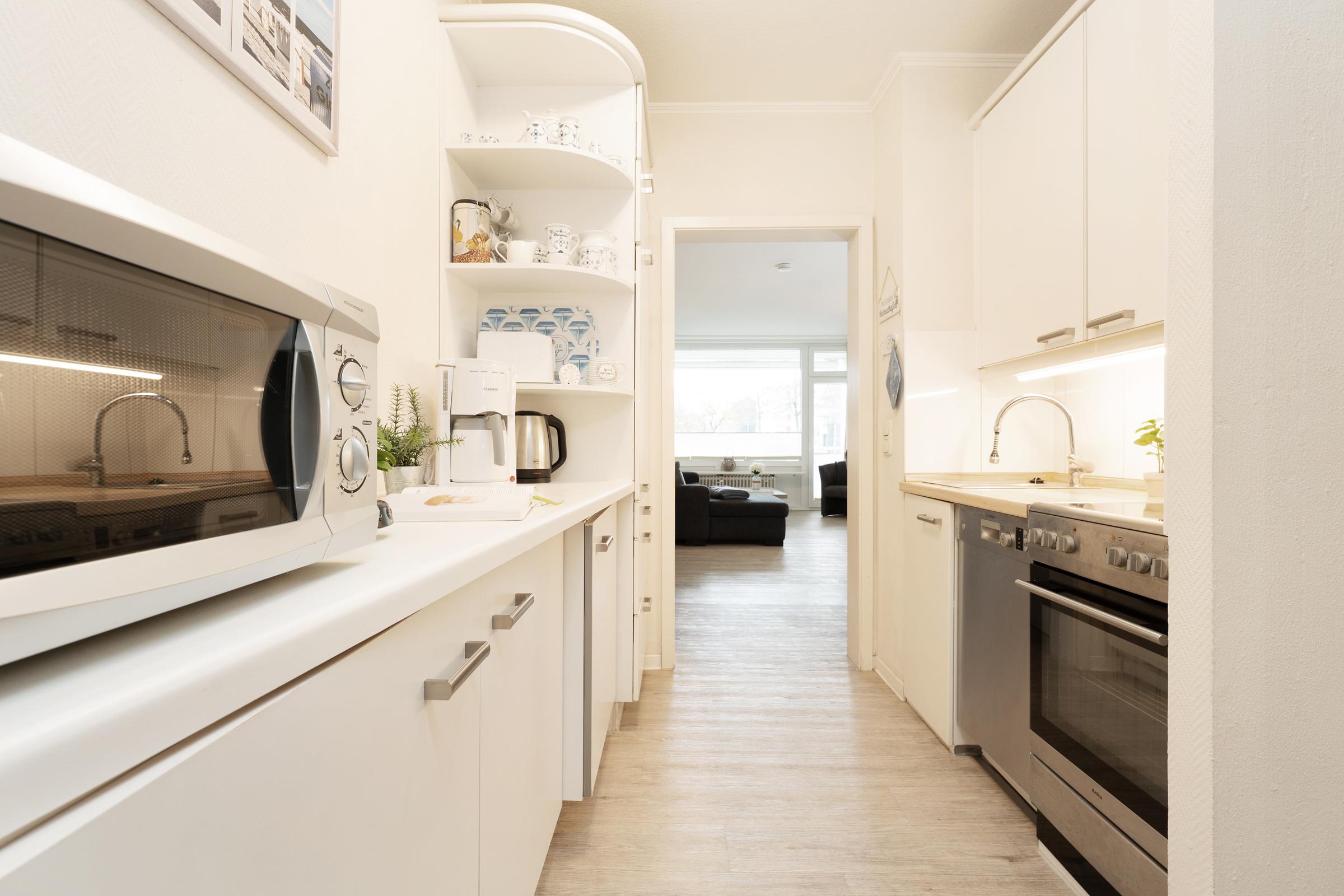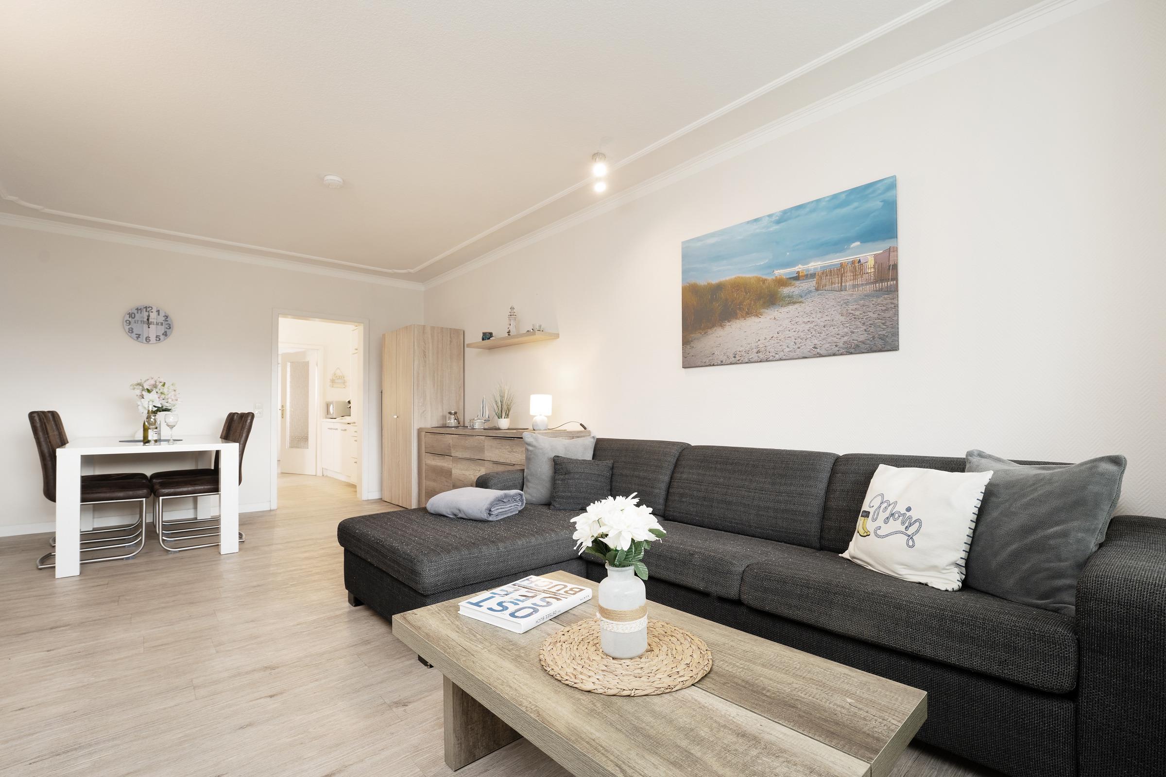 Im gemütlichen Wohnzimmer befindet sich eine offene Küche, die ausgestattet ist mit Herd, Kühlschrank mit Gefrierfach, Geschirrspülmaschine und vielem mehr. Ein ausziehbares Schlafsofa (180x250 cm) bietet Platz für 2 Personen. Im separaten Schlafzimmer ist ein bequemes Doppelbett (160x200 cm) das für 2 weitere Schlafplätze sorgt. Das Badezimmer überzeugt mit einer Dusche und einem beheizbaren Handtuchhalter. Der Balkon mit Südwest-Ausrichtung und Meerblick rundet diese Feriendomizil ab.