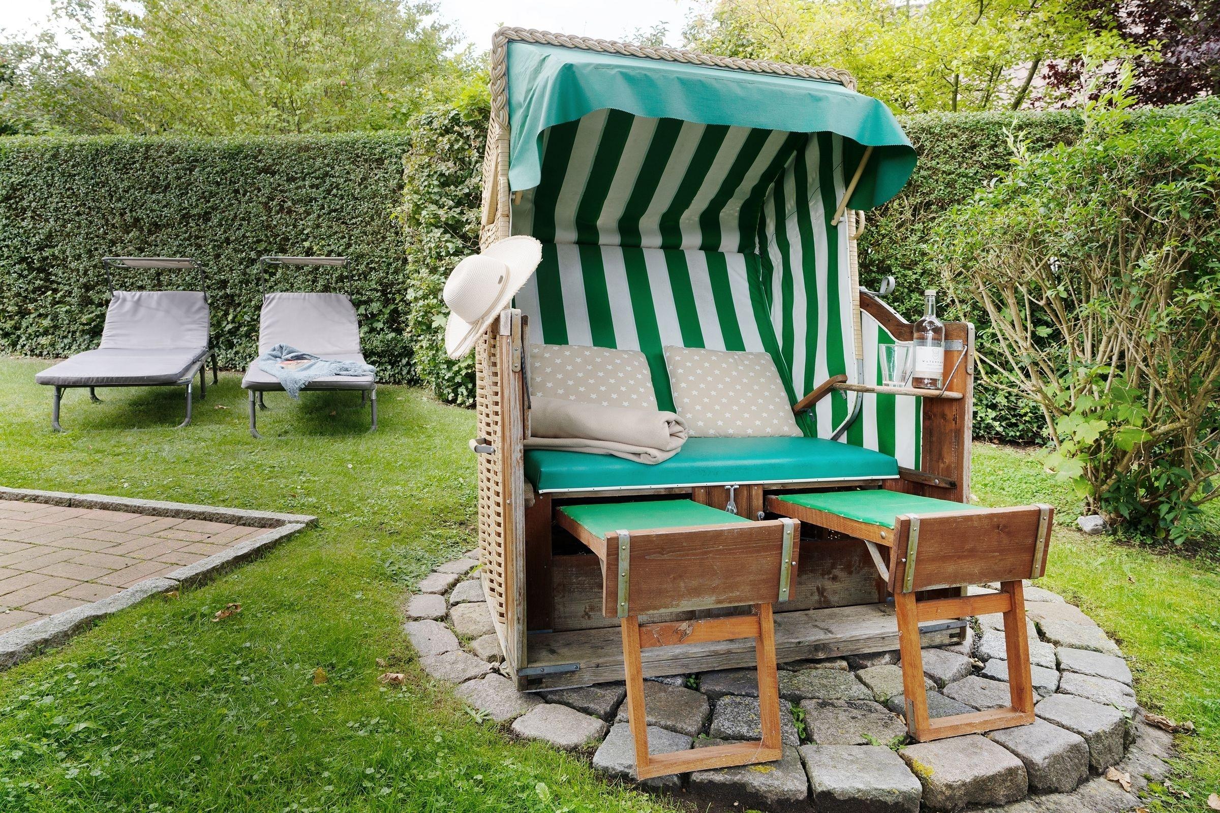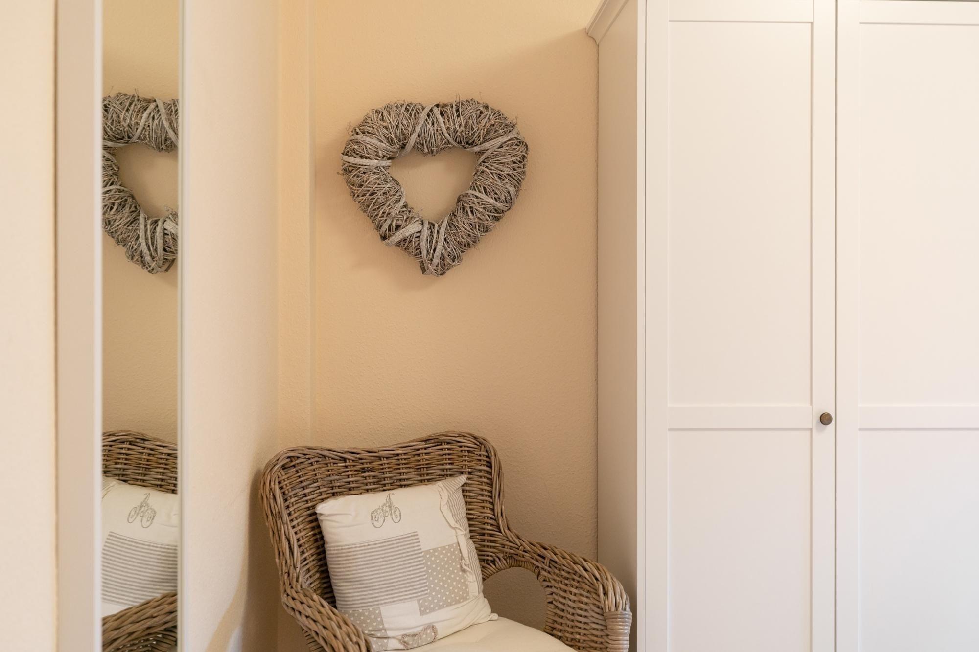 Gemütliche Ferienwohnung in Grömitz mit Terrasse, Strandkorb und E-Bike-Ladestation, ideal für einen entspannten Ostseeurlaub zu zweit.