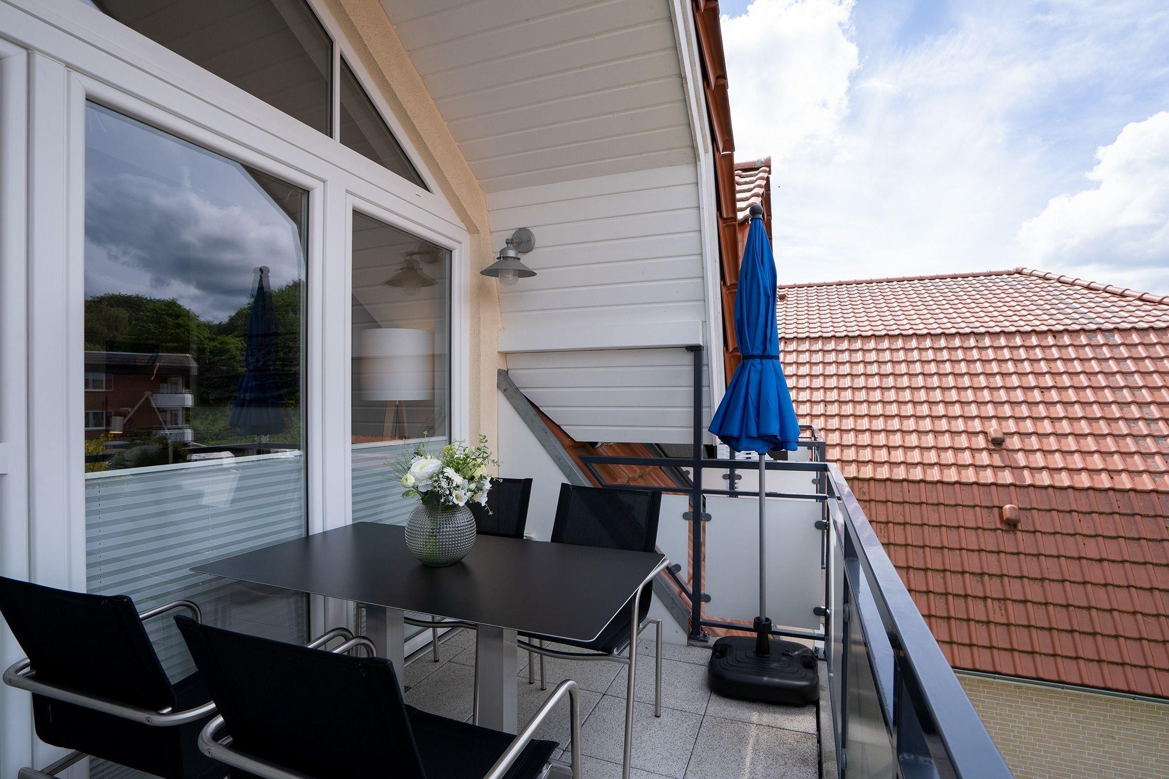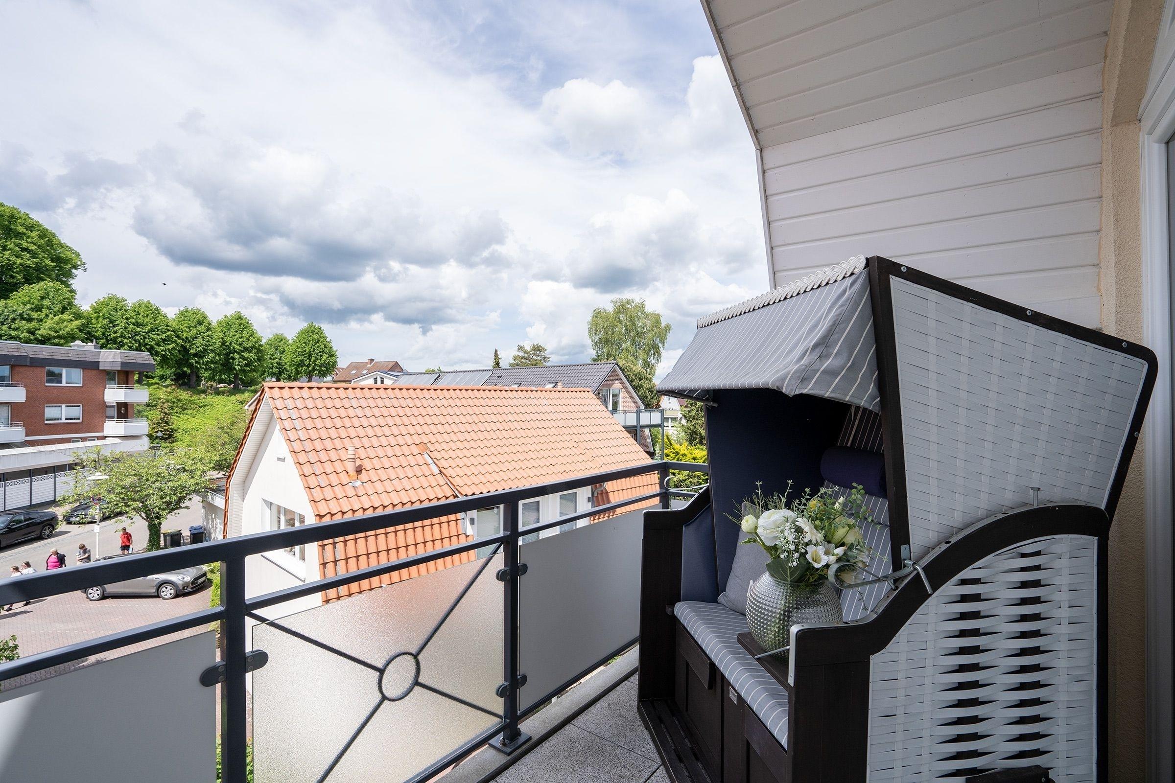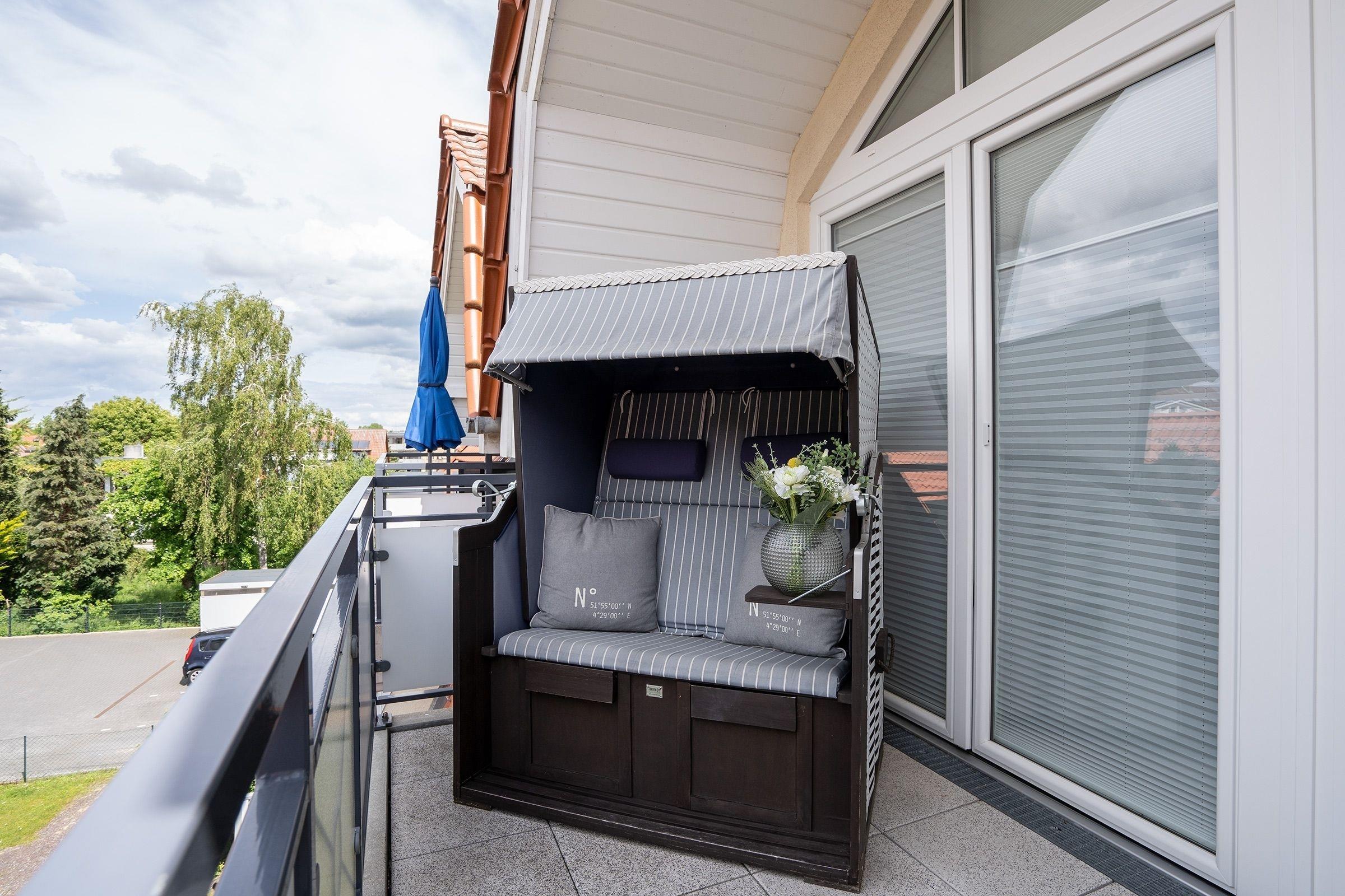 Barrierearme Ferienwohnung mit Balkon und Strandkorb in Grömitz, nur wenige Gehminuten vom Strand entfernt.