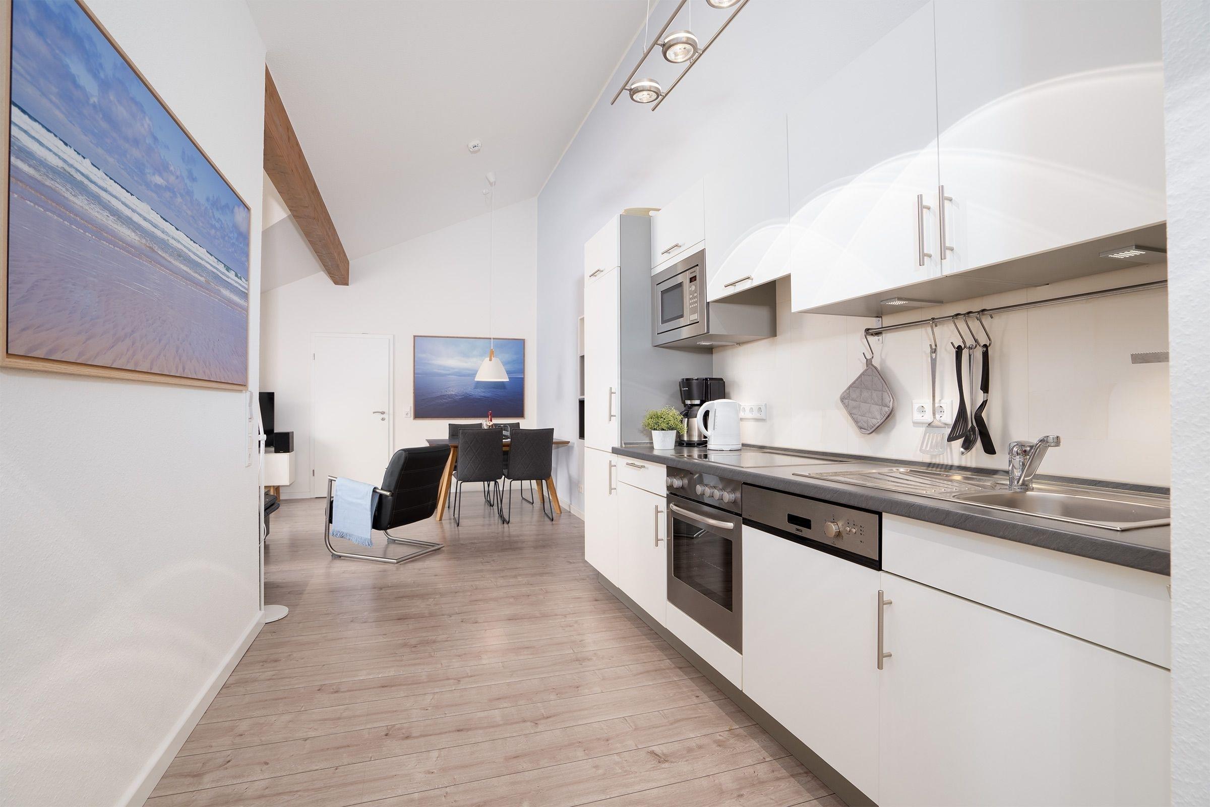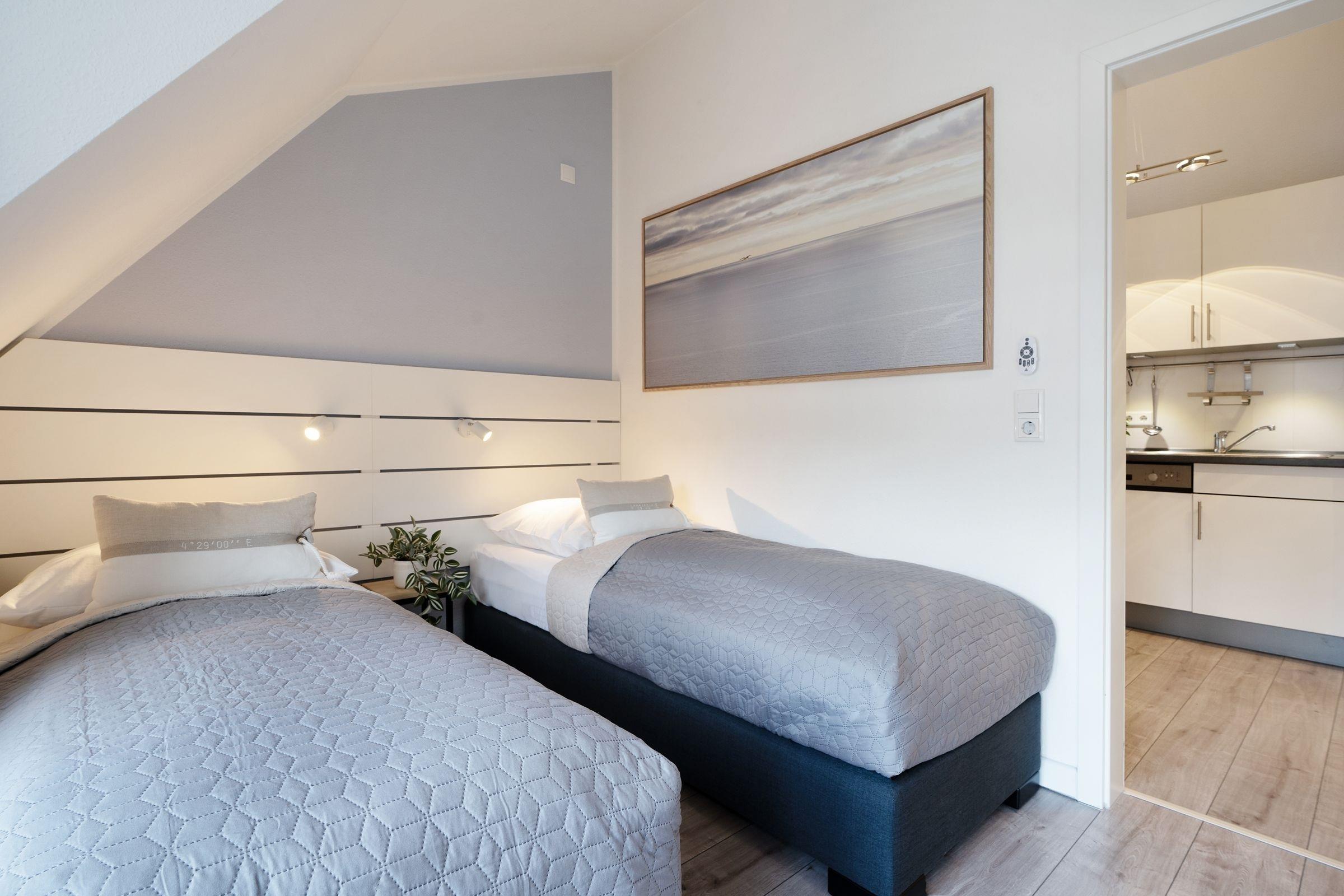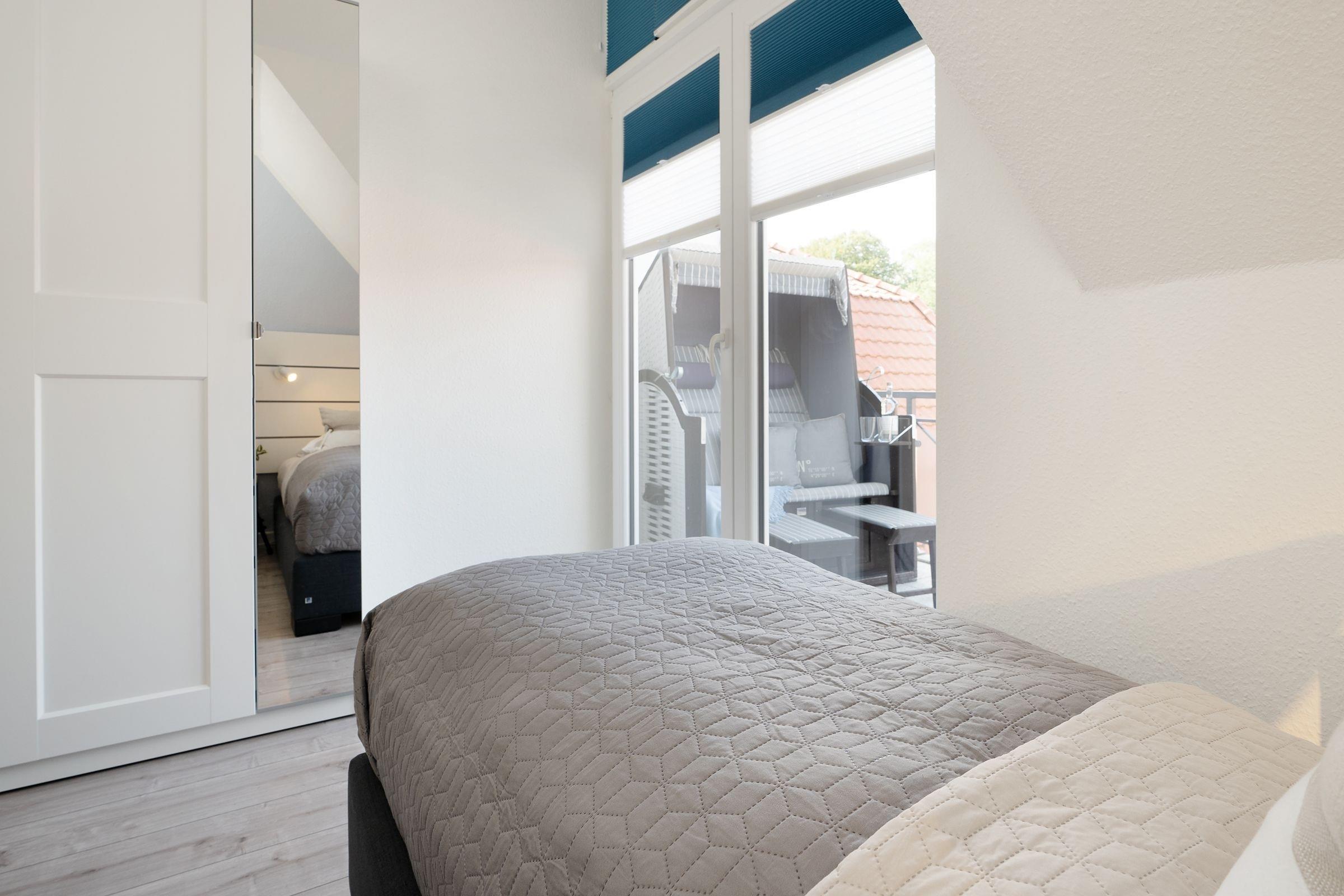 Der großzügige Wohn-/Essbereich mit gemütlicher Sofaecke, Flachbild-TV, integrierter Küche und Essplatz ist offen gestaltet, hell und lichtdurchflutet. Die gute Ausstattung der Küche umfasst Annehmlichkeiten wie 4-Platten-Ceranherd, Backofen, Mikrowelle und Spülmaschine - perfekt geeignet für gesellige Kochabende. Vom Wohnbereich führt ein direkter Zugang auf Ihren eigenen Balkon - hier lässt es sich herrlich frühstücken! Auf dem zweiten Balkon lädt ein gemütlicher Strandkorb zur Entspannung ein. Eins der Schlafzimmer ist mit einem hochwertigen Boxspring-Doppelbett (2x 90x200 cm, ohne Rausfallschutz) möbliert, das zu zwei Einzelbetten auseinandergestellt werden kann. Bei einem der beiden Boxspring-Betten ist die Liegefläche bis zu 80 cm höhenverstellbar. Es ist damit auch für Menschen mit Bewegungsbeeinträchtigungen oder Pflegebedarf geeignet. Das zweite Schlafzimmer ist mit zwei Boxspring-Betten (je 80x200 cm) ausgestattet. Angenehme Verdunklung ist durch Plissee und Vorhänge gegeben. Das stilvolle, geräumige Badezimmer begeistert mit bodentiefer Dusche, Fußbodenheizung und beheizbarem Handtuchhalter.
