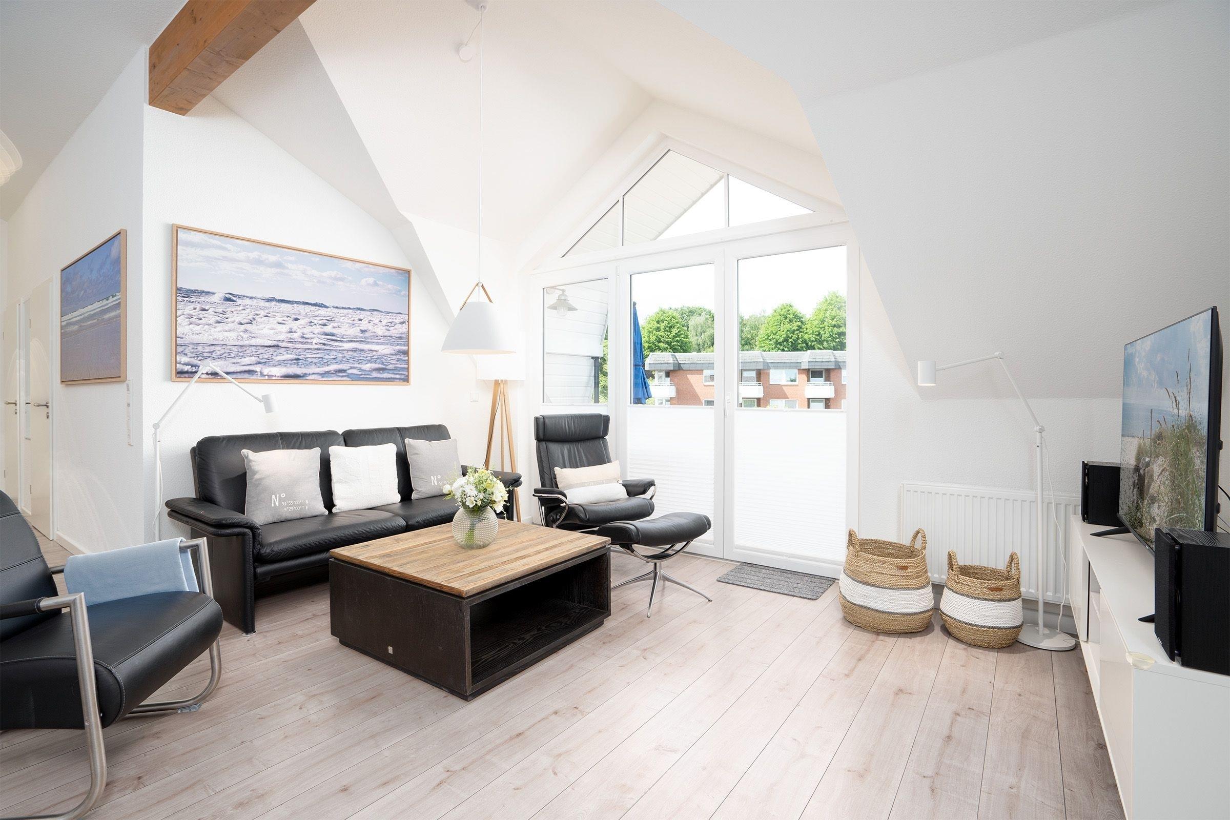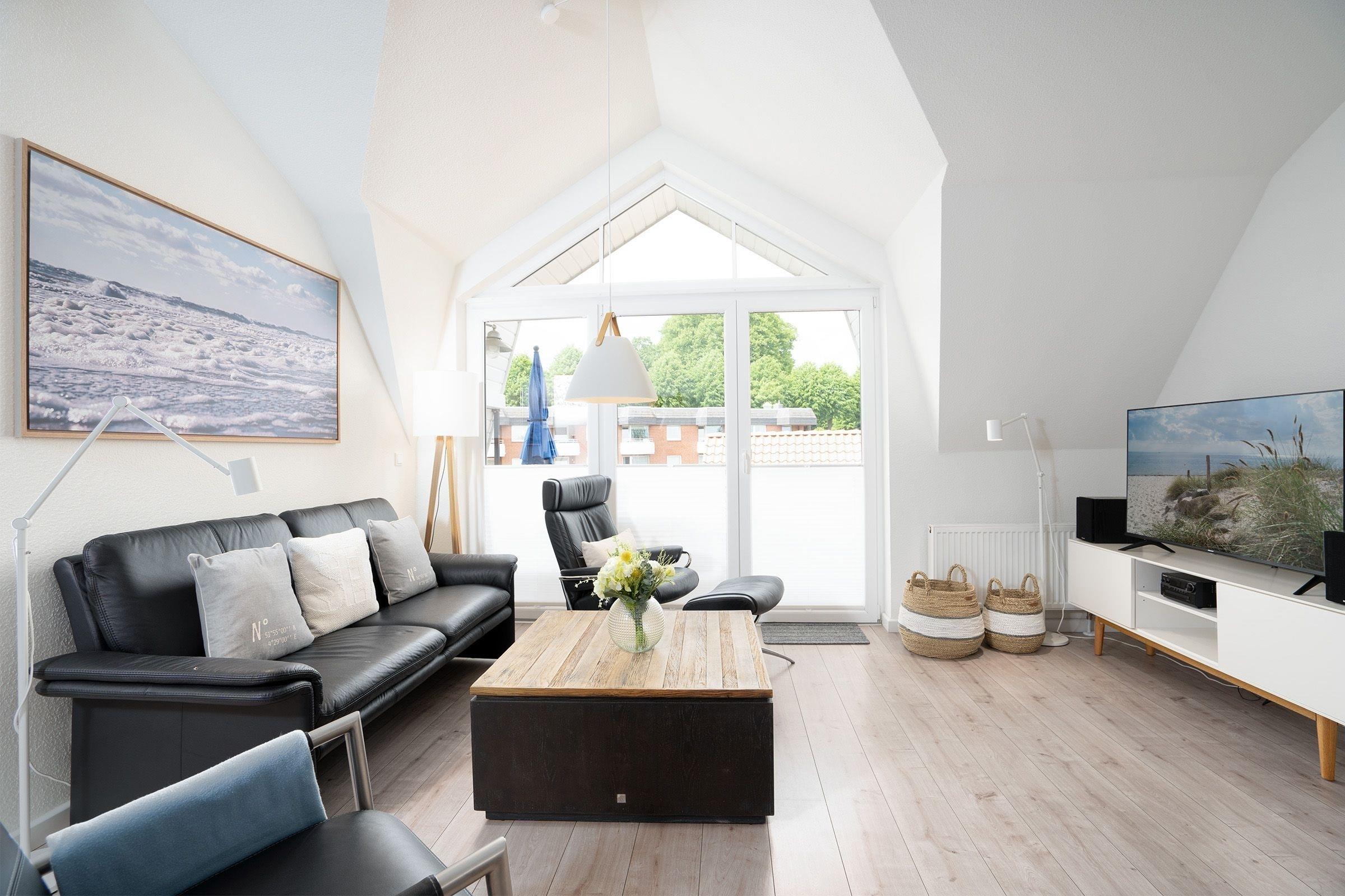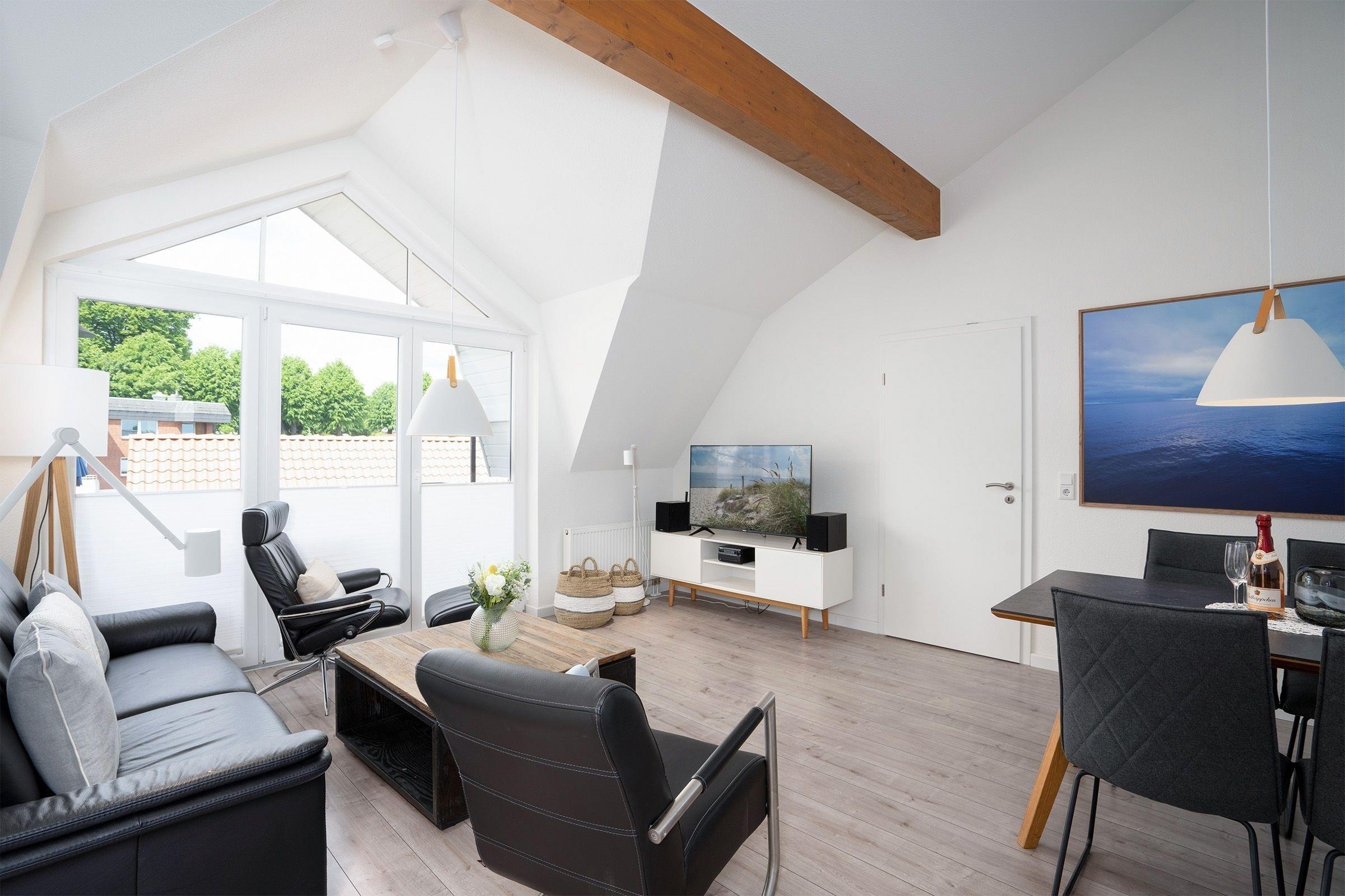 Der großzügige Wohn-/Essbereich mit gemütlicher Sofaecke, Flachbild-TV, integrierter Küche und Essplatz ist offen gestaltet, hell und lichtdurchflutet. Die gute Ausstattung der Küche umfasst Annehmlichkeiten wie 4-Platten-Ceranherd, Backofen, Mikrowelle und Spülmaschine - perfekt geeignet für gesellige Kochabende. Vom Wohnbereich führt ein direkter Zugang auf Ihren eigenen Balkon - hier lässt es sich herrlich frühstücken! Auf dem zweiten Balkon lädt ein gemütlicher Strandkorb zur Entspannung ein. Eins der Schlafzimmer ist mit einem hochwertigen Boxspring-Doppelbett (2x 90x200 cm, ohne Rausfallschutz) möbliert, das zu zwei Einzelbetten auseinandergestellt werden kann. Bei einem der beiden Boxspring-Betten ist die Liegefläche bis zu 80 cm höhenverstellbar. Es ist damit auch für Menschen mit Bewegungsbeeinträchtigungen oder Pflegebedarf geeignet. Das zweite Schlafzimmer ist mit zwei Boxspring-Betten (je 80x200 cm) ausgestattet. Angenehme Verdunklung ist durch Plissee und Vorhänge gegeben. Das stilvolle, geräumige Badezimmer begeistert mit bodentiefer Dusche, Fußbodenheizung und beheizbarem Handtuchhalter.