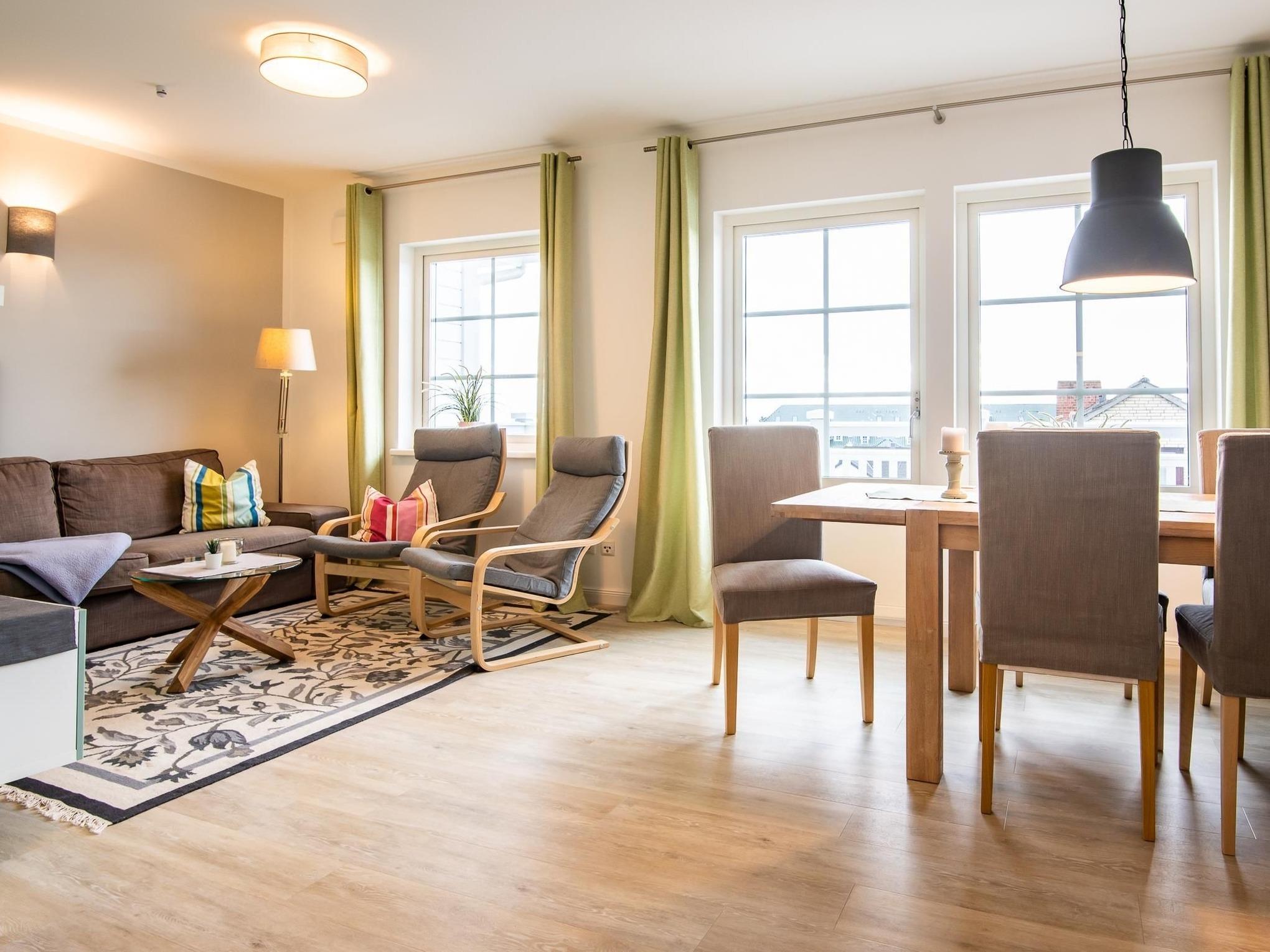 1. OG: Das helle Entrée ist mit Garderobenhaken und Spiegel ausgestattet. Der Flur führt linkerhand in eines der Schlafzimmer im modernen Landhausstil mit Doppelbett (2x 90x200 cm), Kommode und begehbarer Kammer zur Unterbringung Ihrer Ferienkleidung. Rechterhand befindet sich ein stilvolles Designbad mit Annehmlichkeiten wie bodentiefer Eckdusche, Waschmaschine und Fußbodenheizung. Der kombinierte Wohn- und Essbereich wurde mit sehr viel Gespür für Stil und Wohlfühlatmosphäre gestaltet. Die traumhafte Küchenecke überzeugt u.a. mit Ausstattungsmerkmalen wie einem großen Kühlschrank mit Gefrierfach, Spülmaschine, Mikrowelle, Backofen und 4-Platten Cerankochfeld. Der Essbereich direkt am Fenster bietet einen wunderbaren Panoramablick über die Dächer von Grömitz. Machen Sie es sich in der komfortablen Sofaecke mit Sofa, Sesseln und großem, wertigen Flat-TV, sowie Blu-Ray-Player bequem. Das gesamte Domizil ist nach Süden hin ausgerichtet, es ist daher lichtdurchflutet und hell und sorgt rundum für ein gutes Wohngefühl! Dazu trägt auch die angenehme Fußbodenheizung bei. Vom Wohnbereich aus treten Sie direkt auf Ihren großzügigen Balkon und genießen von hier einen saisonalen Ostsee-Fernblick. Der erste Kaffee am Morgen, ein guter Tropfen um abends den Tag ausklingen zu lassen - dieser Balkon sorgt zu jeder Tageszeit für gute Laune. Urlauben auf hohem Niveau mit einer Prise frischer Ostseeluft und zahlreichen Sonnenstunden!