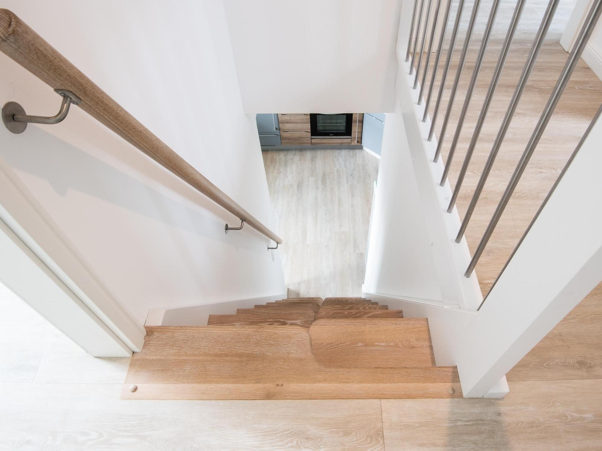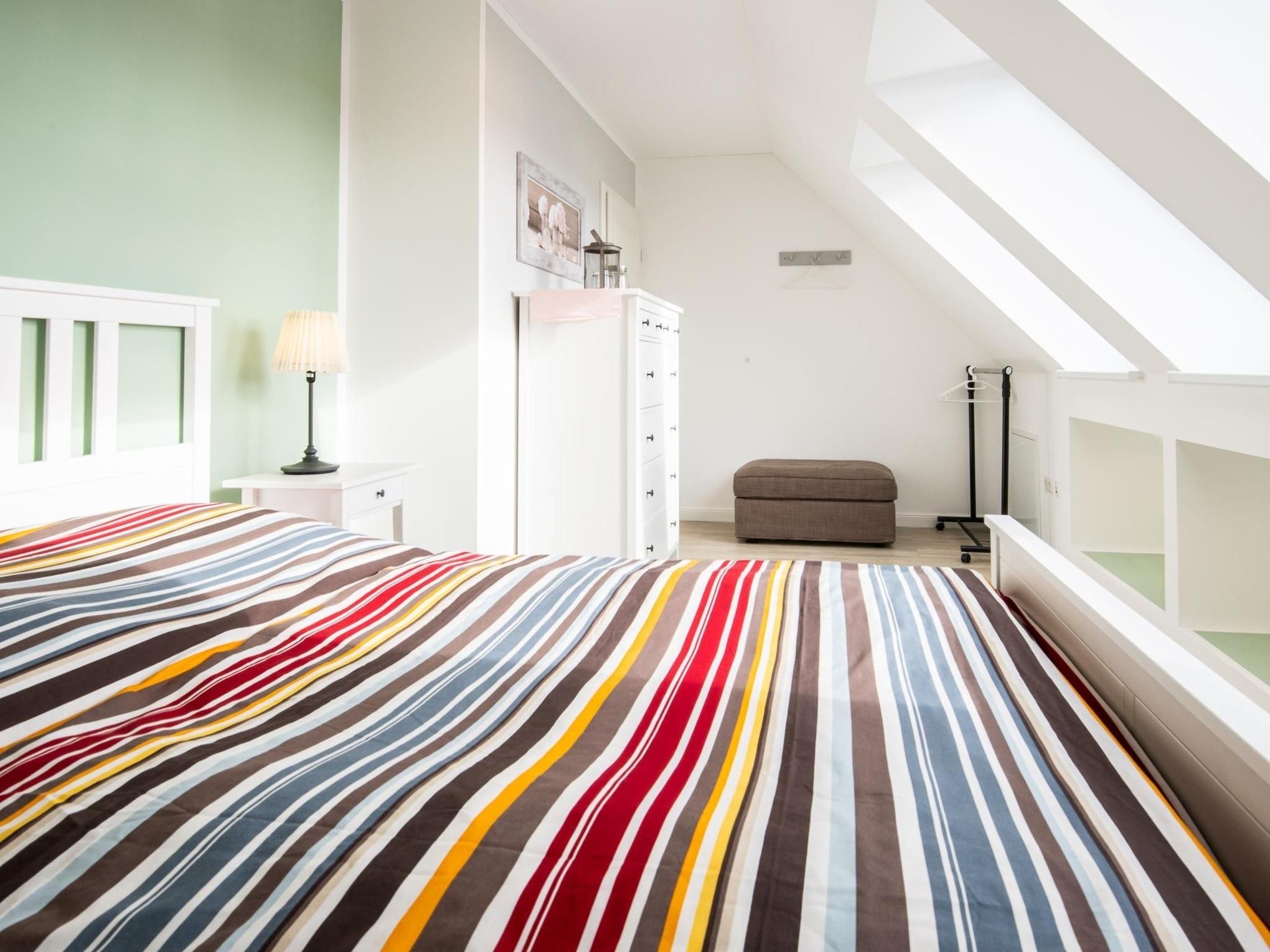2. OG: Eine markant gestaltete Raumspartreppe mit versetzten Stufen führt in den oberen Bereich der Wohnung. Rechterhand liegt ein geräumiges, helles Schlafzimmer mit Doppelbett (2 x90x200 cm), Kommode, sowie charaktervoll beleuchteten Wandnischen als weitere Stauraummöglichkeit. Die Dachschrägenfenster sind hier mit Verdunklungsrollos, sowie in den Sommermonaten außen mit Sonnenlichtrollos, versehen. Gegenüber liegt dann ein zweites tageshelles Duschbad mit WC, beleuchtetem Schminkspiegel und Waschbecken. Der Flur führt schließlich in das dritte Schlafzimmer, ebenfalls mit Doppelbett (2x 90x200 cm), Kommode, Kleiderständer und sogar mit einem 2. TV ausgestattet. Verdunklungsrollos sorgen auch hier für erholsamen Schlaf.