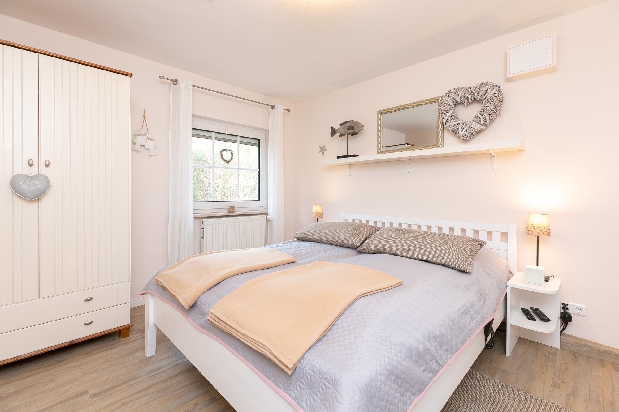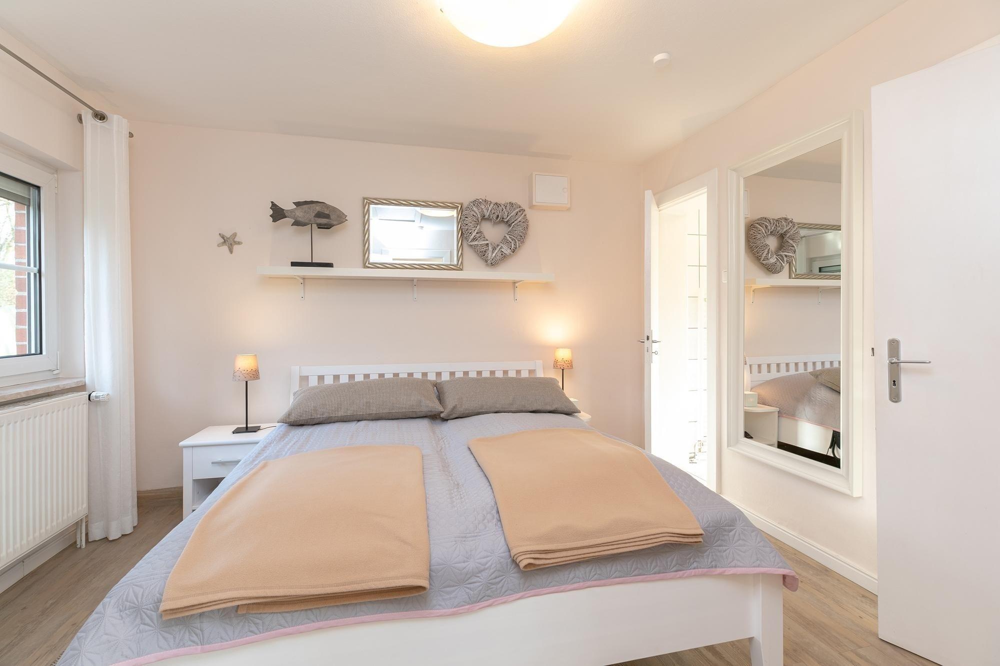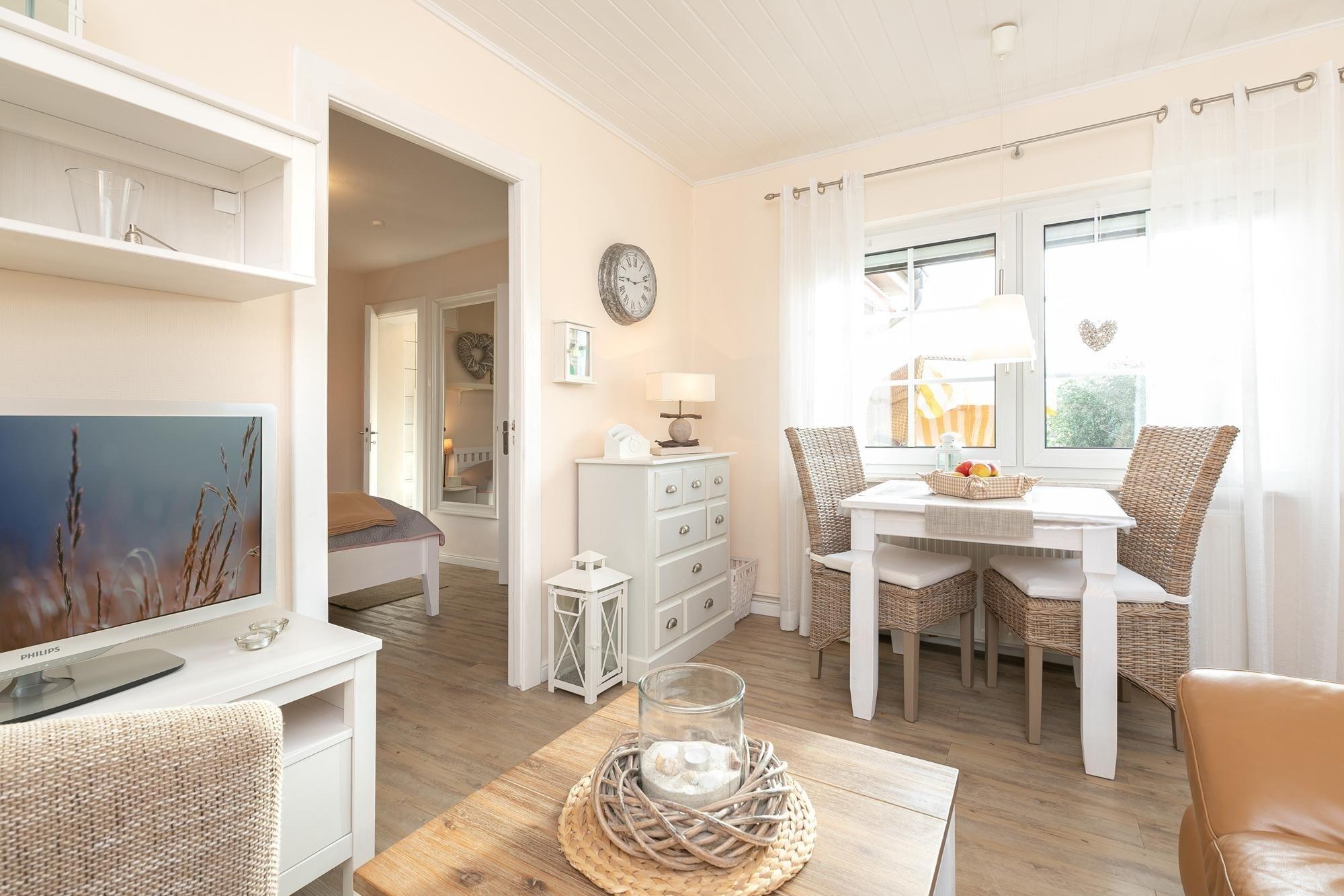 Dieses Feriendomizil ist stilsicher, hell und modern eingerichtet. Das Wohnzimmer ist ausgestattet mit einer gemütlichen cognacfarbenden Couch, Flachbildfernseher, CD-Player sowie Radio und ist somit gewappnet für einen Schiet-Wetter-Tag. Zudem steht hier ein Esstisch ausgelegt für 2 Personen für ein romantisches Candle-Light-Dinner bereit. Liebevoll platzierte Dekoartikel sorgen für ein wohnliches Gefühl und ziehen sich durch jeden Raum. Vom Wohnzimmer gelangen Sie in das Schlafzimmer mit komfortablem Boxspringbett (2x 80x200 cm) und großzügigem Kleiderschrank für all Ihre Urlaubsutensilien. Von hier haben Sie Zutritt zum hell gefliesten, modernen Duschbad mit Handtuchheizung und zur voll ausgestatteten, separaten Küche mit Backofen, Herd, Kaffeemaschine, Kühlschrank mit Gefrierfach, Spülmaschine, Mikrowelle, Mixer, Eierkocher, Toaster & Wasserkocher. Abgerundet wird dieses niedliche Ferienhaus durch eine Terrasse mit Markise und eigenem Strandkorb. Genießen Sie sonnige Tage im liebevoll angelegten Garten und lassen Sie den Tag unter sternenklarem Himmel im gemütlichen Strandkorb ausklingen. Worauf warten Sie?