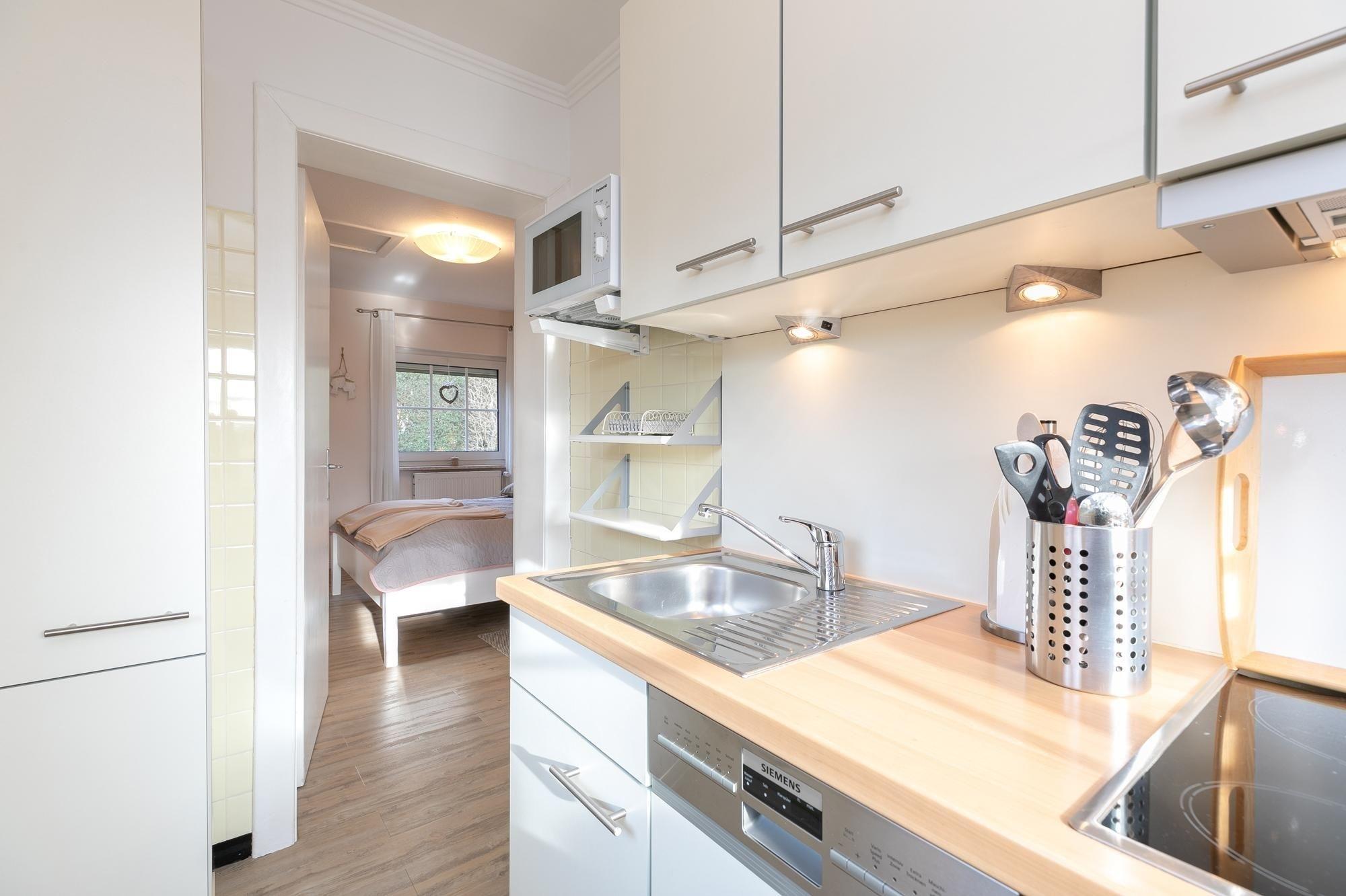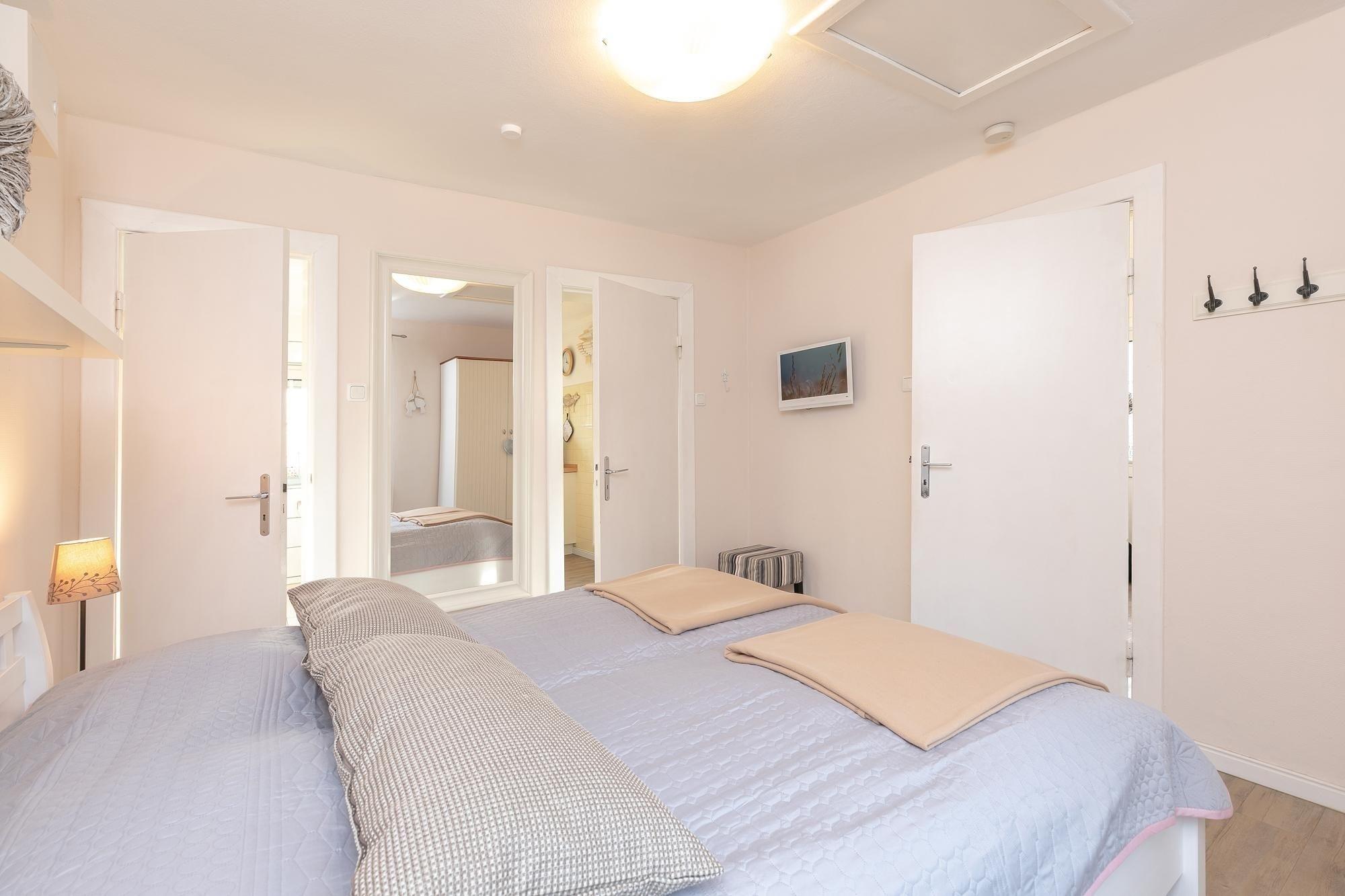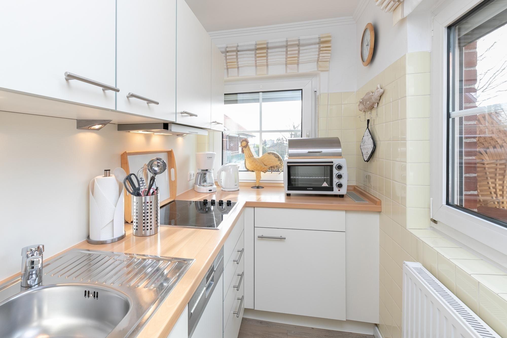 Dieses Feriendomizil ist stilsicher, hell und modern eingerichtet. Das Wohnzimmer ist ausgestattet mit einer gemütlichen cognacfarbenden Couch, Flachbildfernseher, CD-Player sowie Radio und ist somit gewappnet für einen Schiet-Wetter-Tag. Zudem steht hier ein Esstisch ausgelegt für 2 Personen für ein romantisches Candle-Light-Dinner bereit. Liebevoll platzierte Dekoartikel sorgen für ein wohnliches Gefühl und ziehen sich durch jeden Raum. Vom Wohnzimmer gelangen Sie in das Schlafzimmer mit komfortablem Boxspringbett (2x 80x200 cm) und großzügigem Kleiderschrank für all Ihre Urlaubsutensilien. Von hier haben Sie Zutritt zum hell gefliesten, modernen Duschbad mit Handtuchheizung und zur voll ausgestatteten, separaten Küche mit Backofen, Herd, Kaffeemaschine, Kühlschrank mit Gefrierfach, Spülmaschine, Mikrowelle, Mixer, Eierkocher, Toaster & Wasserkocher. Abgerundet wird dieses niedliche Ferienhaus durch eine Terrasse mit Markise und eigenem Strandkorb. Genießen Sie sonnige Tage im liebevoll angelegten Garten und lassen Sie den Tag unter sternenklarem Himmel im gemütlichen Strandkorb ausklingen. Worauf warten Sie?