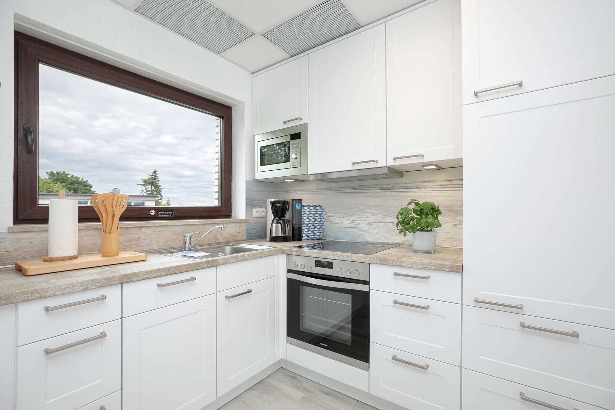 Im Schlafzimmer mit Doppelbett (2x 90x200 cm), und Kleiderschrank für all Ihre Urlaubsutensilien lassen sich ruhige Nächte verbringen. Ein TV, sowie elektrische Außenrollos gehören ebenfalls zur Grundausstattung. Das 2. Schlafzimmer verfügt über ein 100 cm breites, komfortables Einzelbett (100x200 cm) einen weiteren Fernseher und ebenfalls über elektrische Außenrollos. Vom Wohnzimmer mit offener Küche und Fernseher gelangen Sie auf den möblierten Balkon mit Markise. Hier lässt sich der Tag entspannt mit einem Frühstück und frisch gebrühtem Kaffee starten. Die Küche ist voll ausgestattet sodass Sie auch im Urlaub kulinarische Köstlichkeiten zaubern können. Die geschmackvolle Einrichtung setzt sich auch im Badezimmer fort, ausgestattet mit WC und Dusche, sowie einem Fön und einem beheizbaren Handtuchhalter fehlt es Ihnen hier an Nichts. Also auf geht’s an die Ostsee...