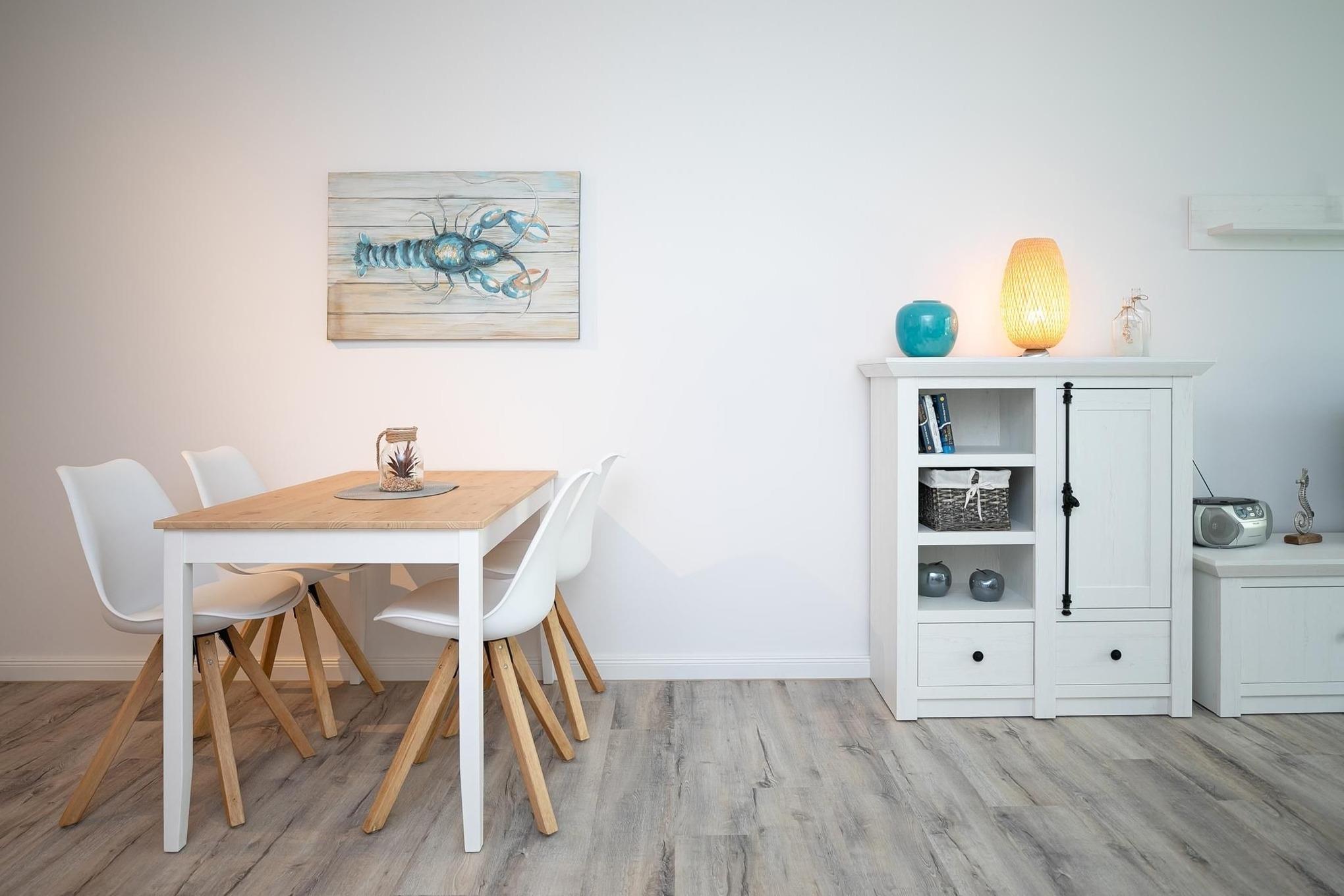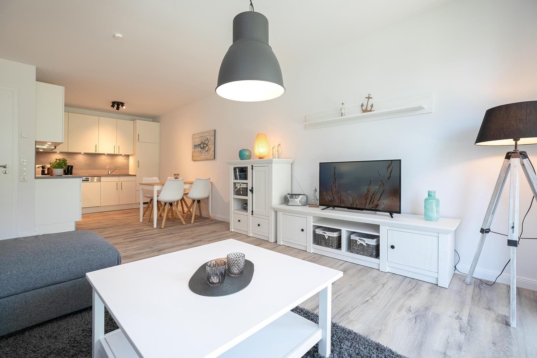 Über das Wohnzimmer gelangen Sie auf die möblierte Terrasse. Hier steht Wohlfühlen im Mittelpunkt... ein ausgiebiges Frühstück oder ein gemütlicher Abend mit Wein und Käse, lassen Sie den Alltag vergessen. Im offen gestalteten Wohnraum fügt sich die moderne Küche optimal ein. Ausgestattet mit Backofen, Herd, Kühl – und Gefrierschrank, Spülmaschine und Nespresso Kaffee-Kapselmaschine lassen sich hier zahlreiche Gerichte zaubern. Das Badezimmer überzeugt mit Fußbodenheizung, beheizbarem Handtuchhalter und Dusche mit bodentiefem Einstieg. Lassen Sie es sich in dieser Ferienoase gut gehen...