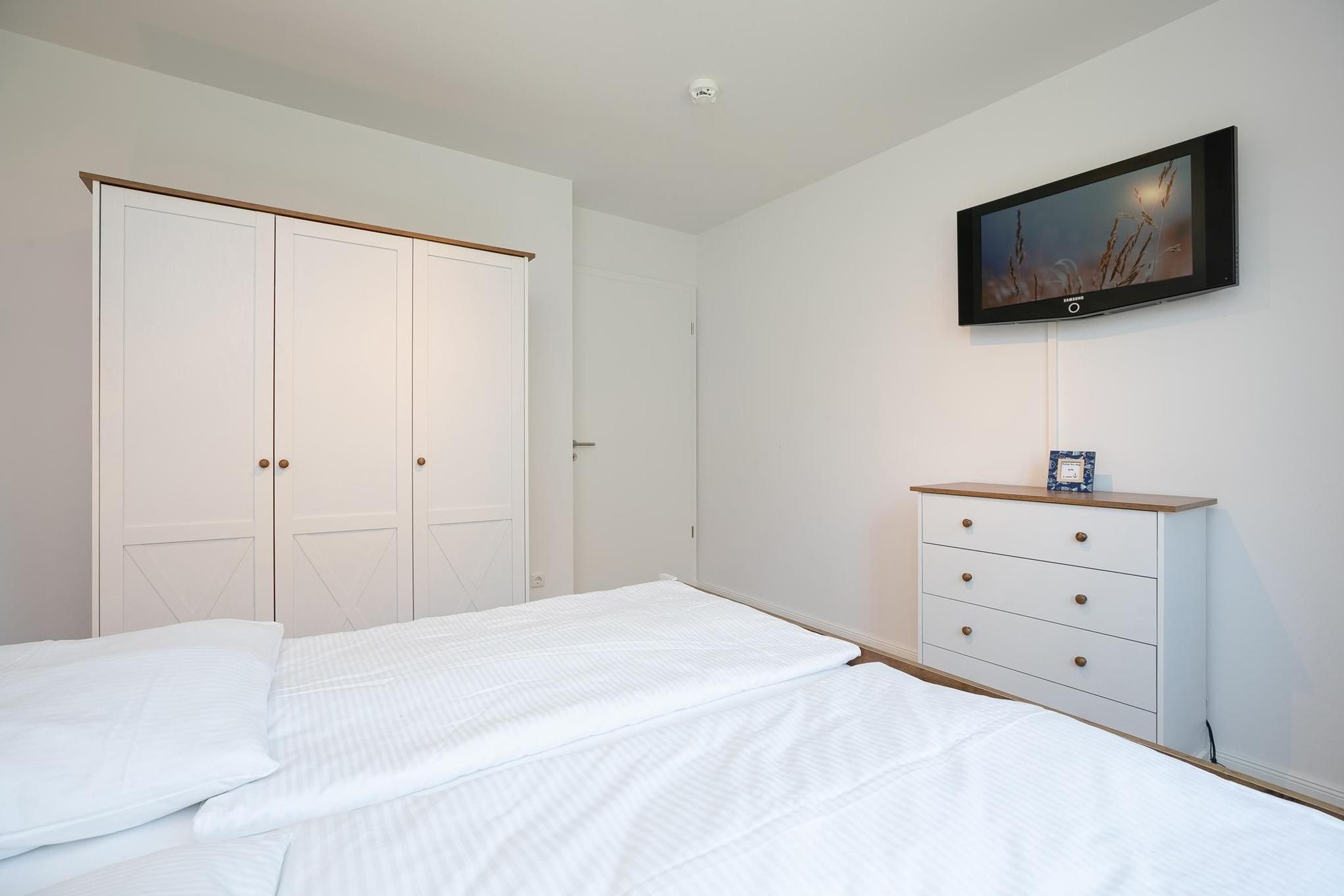 Schlafzimmer: 1 Doppelbett (2x 90x200 cm), Kleiderschrank, Verdunkelung (elektrische Außenrollos)