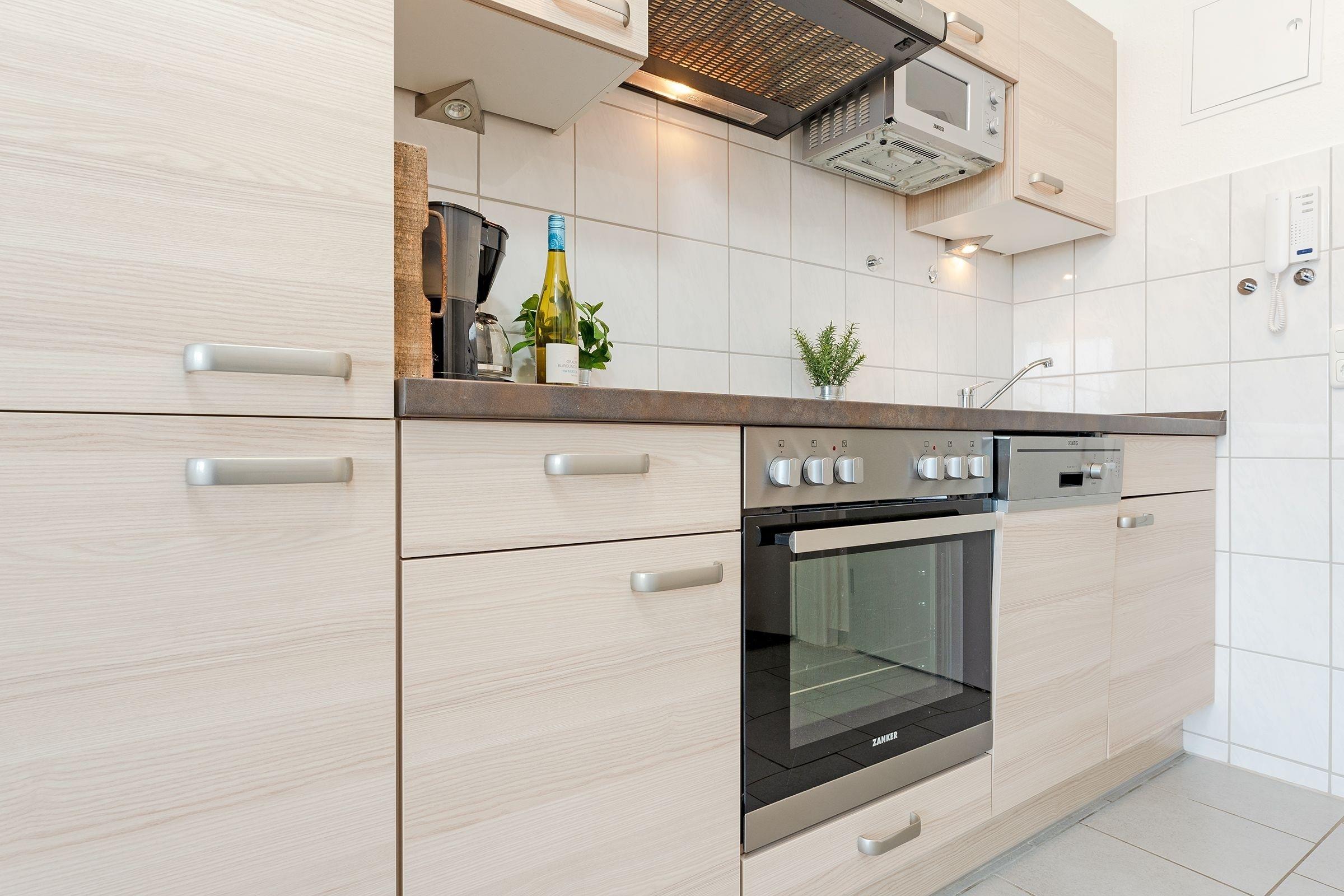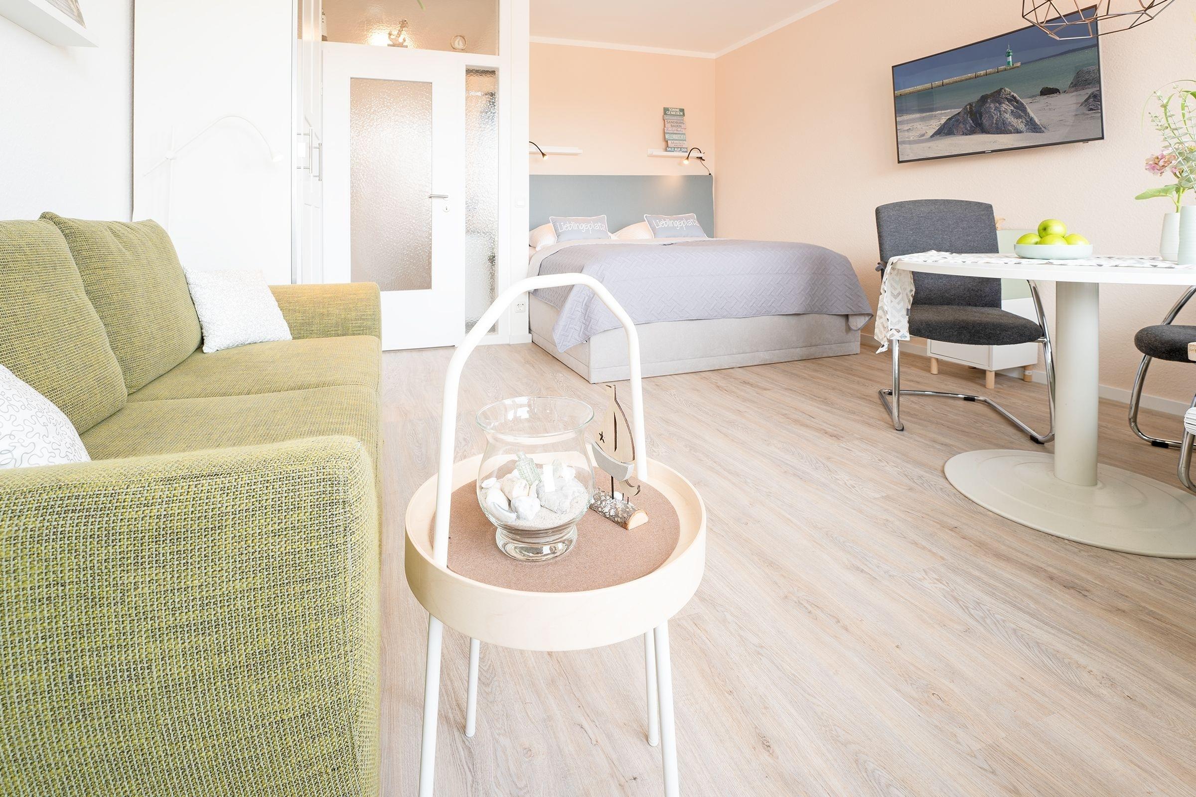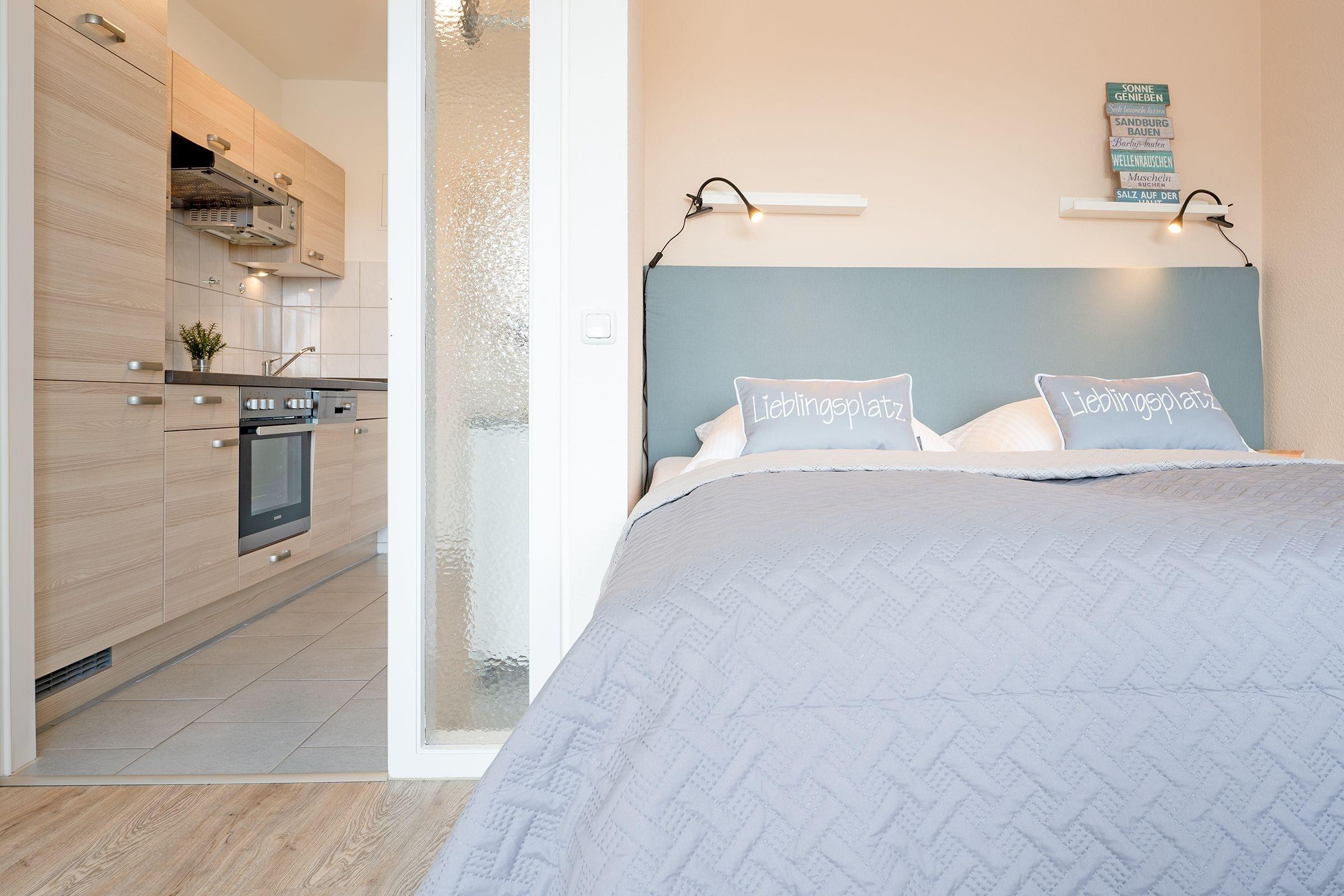 Die gemütliche Wohnung heißt ihre Gäste mit einem freundlich eingerichteten, kombinierten Wohn- und Schlafraum mit offener Küche willkommen. in einem komfortablen Boxspring-Doppelbett (180x200cm) können Sie traumhafte Nächte verbringen. In der integrierten Küchenzeile finden Sie alles, um sich im Urlaub selbst verpflegen zu können wie z. B. einen Herd mit 4-Platten-Cerankochfeld, einen Backofen, einen Kühlschrank mit Gefrierfach sowie eine Geschirrspülmaschine. Das innenliegende Badezimmer verfügt über WC und Dusche. Genießen Sie die Morgensonne auf dem möblierten Balkon, welcher nach Osten ausgerichtet ist.