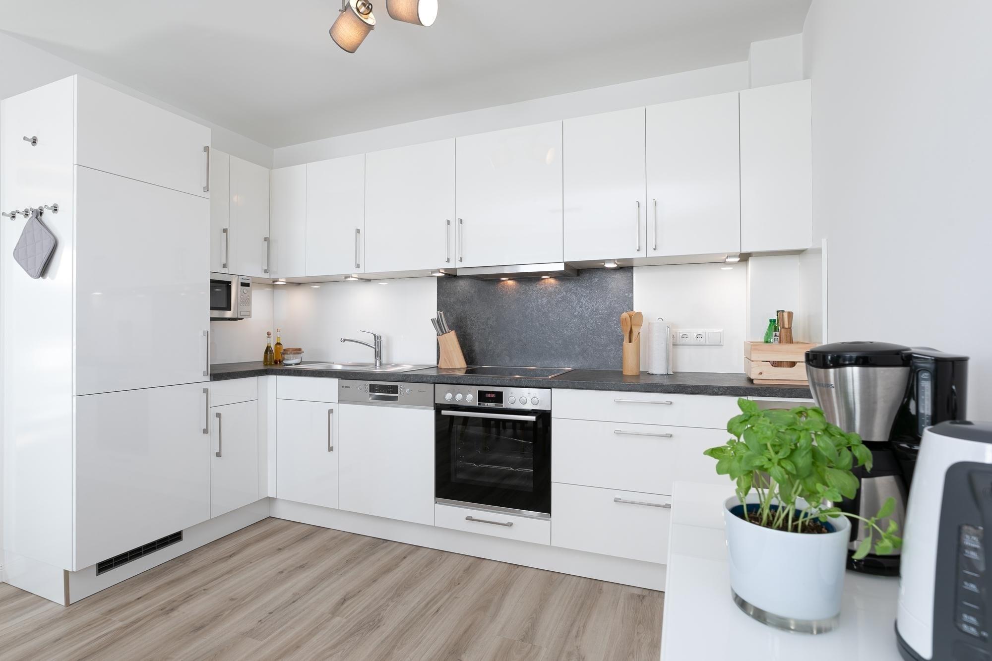 Vom Flur mit Garderobe, Gäste WC und Abstellkammer betreten Sie das lichtdurchflutete Wohn-/Esszimmer mit Balkonzugang. Hier haben Sie ausreichend Platz für gesellige Spieleabende oder gemütliche Stunden auf dem Sofa mit Schlaffunktion (Liegefläche ca. 140x200 cm) vor dem Fernsehgerät. Eine Fußbodenheizung sorgt in allen Räumen für behagliche Wärme vor allem in der kalten Jahreszeit. Der Balkon ist möbliert und eine Markise spendet bei Bedarf Schatten. Ein schmackhaftes Mittag- oder Abendessen lässt sich in der offenen Küche unkompliziert zubereiten, denn hier finden Sie einen Herd mit 4 Ceran-Kochfeldern und Backofen, Geschirrspüler, Mikrowelle, Kühl-Gefrierkombination, Mixer, Pürierstab, Eierkocher, Kaffeemaschine, Toaster und Wasserkocher. Im hinteren Teil der Wohnung lädt Sie das Hauptschlafzimmer mit Doppelbett (2x 90x200 cm), Kleiderschrank und TV zum Träumen und Entspannen ein. Auch das zweite Schlafzimmer mit 2 Einzelbetten (2x 90x200 cm) verfügt über Stauraum für die Urlaubsgarderobe, sowie ein TV Gerät. Das Tageslichtbad mit bodentiefer Dusche, Fußboden- und Handtuchheizung, sowie Waschmaschine vervollständigt diese schöne Ferienwohnung. Ein kostenloser WLAN Anschluss ist verfügbar.